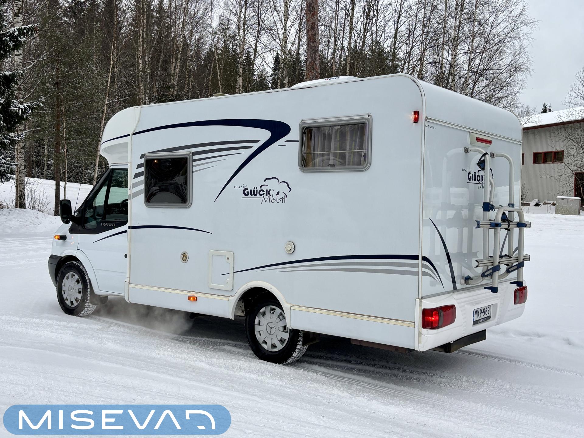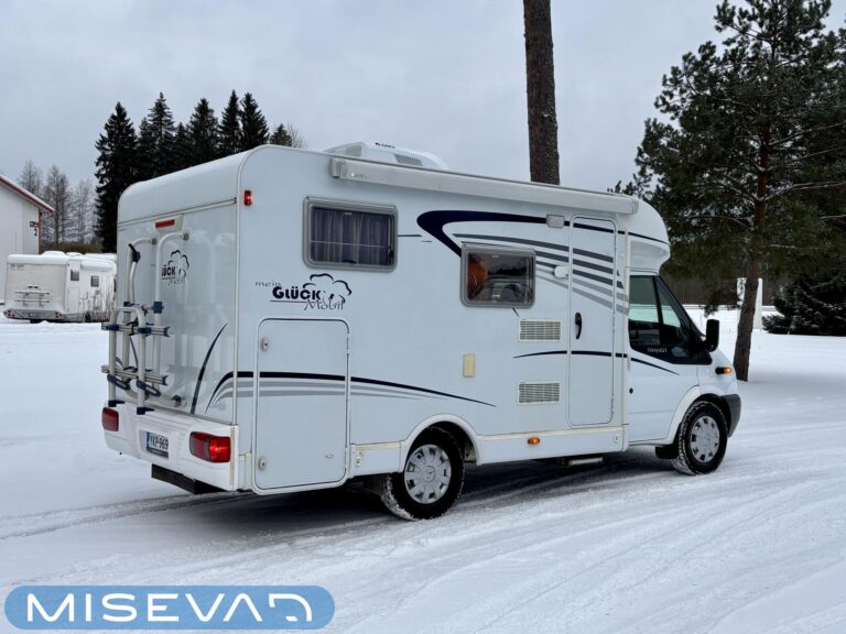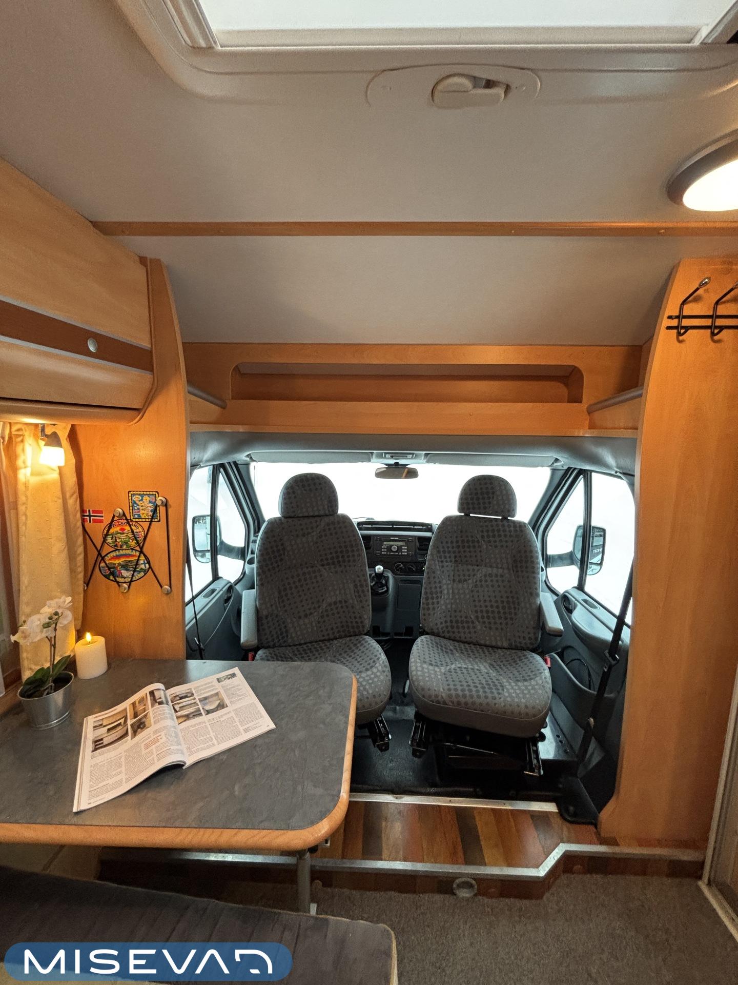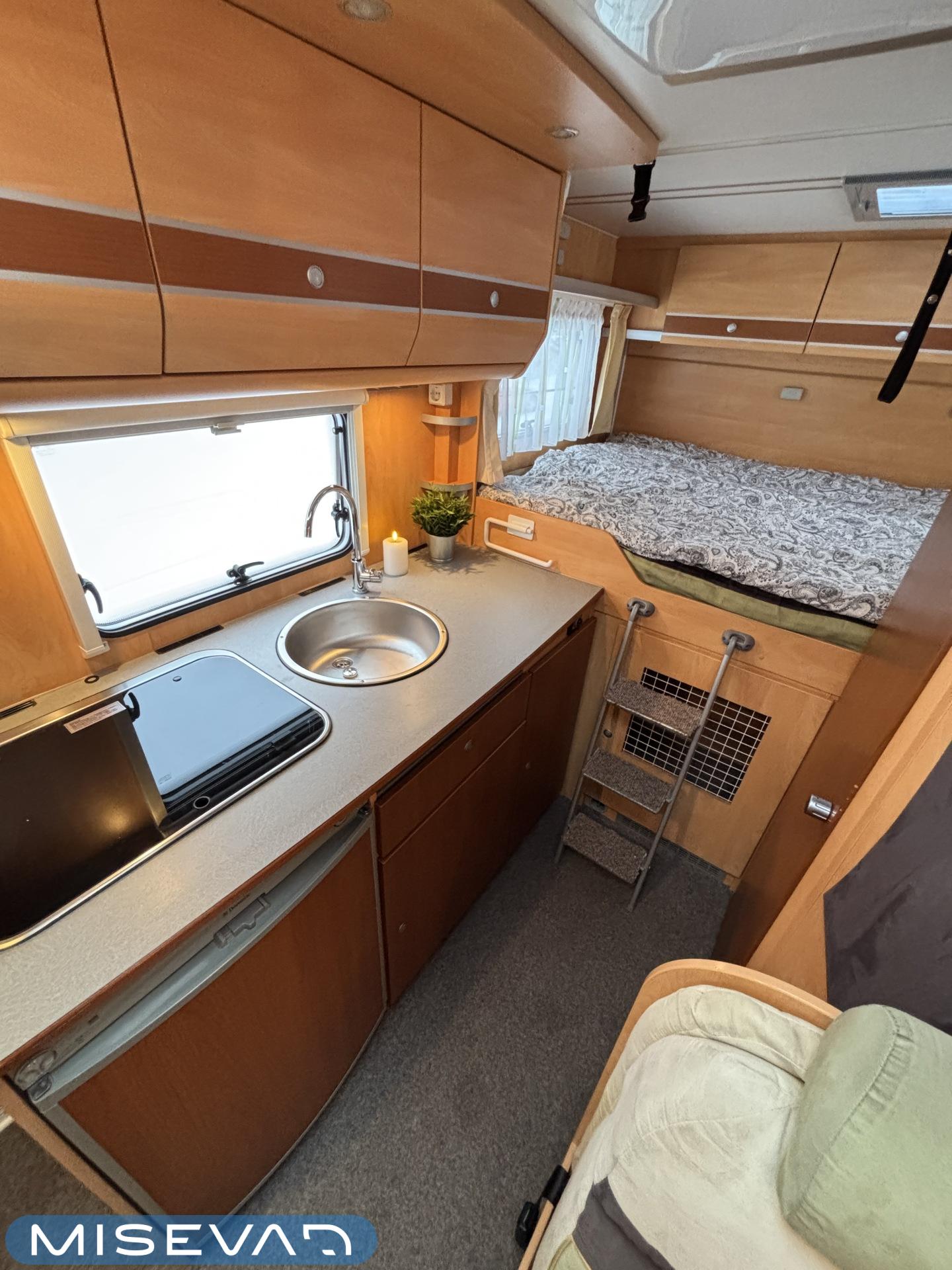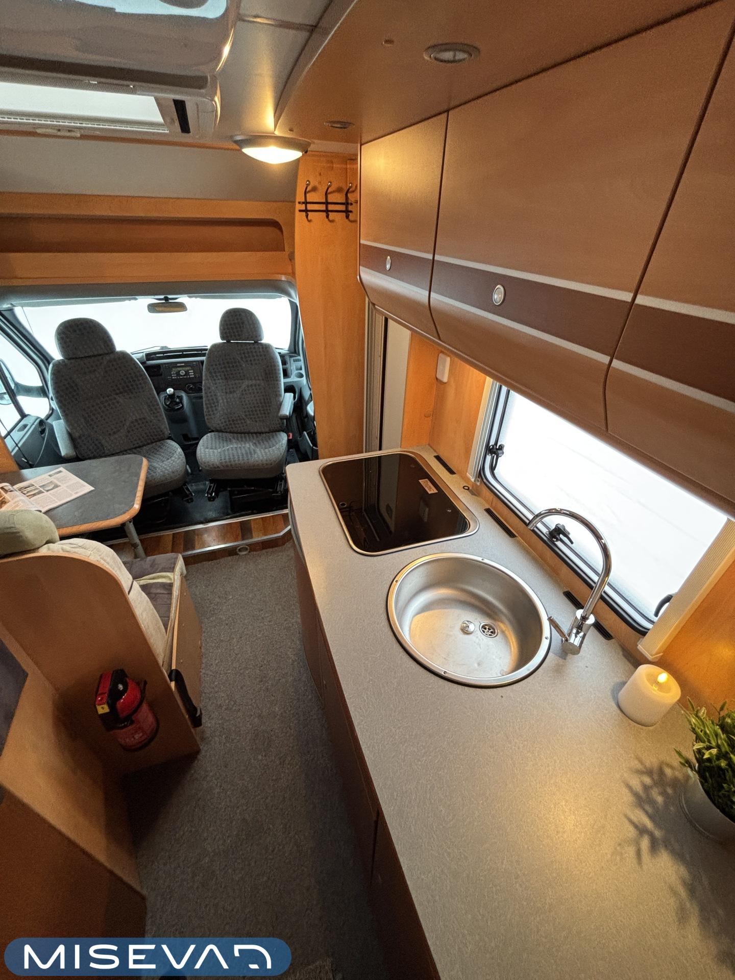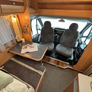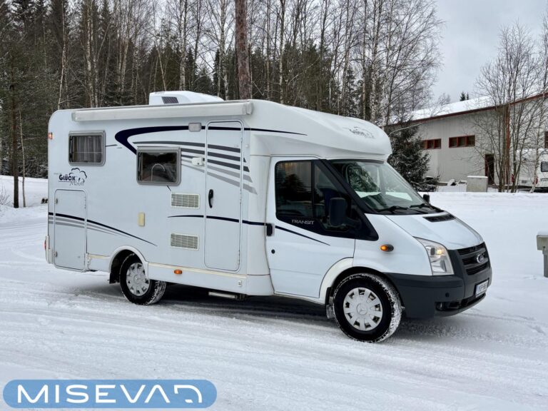 Poikittaisella parivuoteella ja takatallilla varustettu alle seiskametrinen matkakoti esimerkiksi pariskunnille. Tässä yksilössä ajomääräkin on vielä ihan maltillisella tasolla. Auton takaosassa on poikittainen parivuode ja sen alle jää mukavasti säilytystiloja. Keskelle autoa asemoituu keittiötilat ja toiselta sivulta löytyy kylppäritilat. Edessä on pöytäryhmä minne yhdistyvät kääntyvät ohjaamon penkit. Lämmön pirttiin toimittaa Trumaticin tehokkainta mallia (6kw) oleva ilmapuhalluslämmitin ja se on kaasukäyttöinen. Autossa on tietysti myös normaalit matkailuajoneuvon varusteet, eli löytyy jääkaappi, lämminvesiboileri, sekä liesi. Kesäkuumalla viilennys tapahtuu ajon aikana ohjaamoilmastoinnilla ja leirissä kattoilmastoinnin avulla (tarvitaan verkkovirta). Pari fillaria matkaa kätevästi mukana takaseinälle sijoitetussa pyörätelineessä. Löytyypä autosta vielä pienille verkkovirtalaitteille tarkoitettu 600W siniaaltoinvertterikin ja aurinkopaneeli. Ajettavissa henkilöauton B-kortilla ja rekisteröidyt matkustuspaikat neljälle henkilölle.