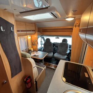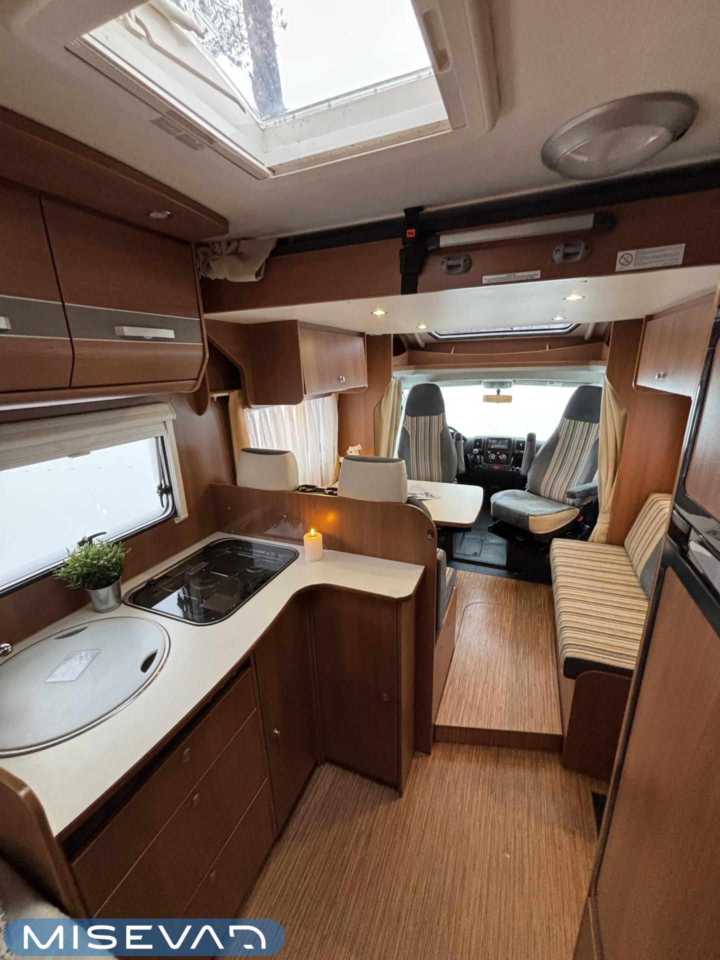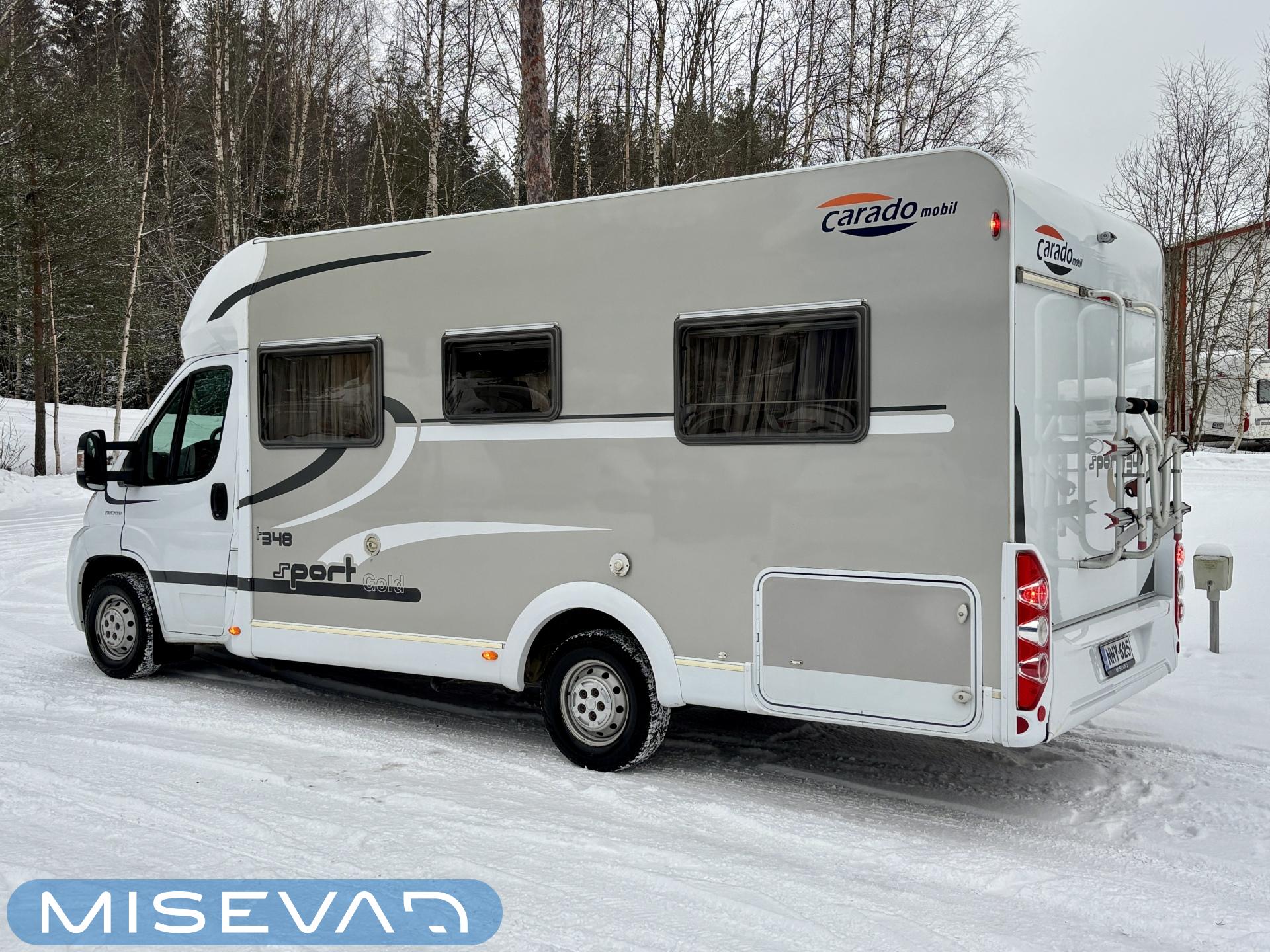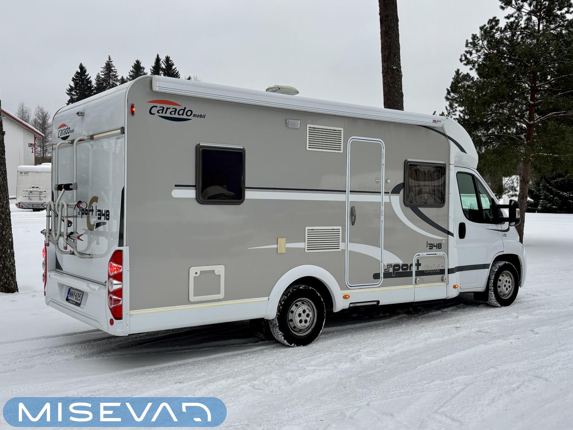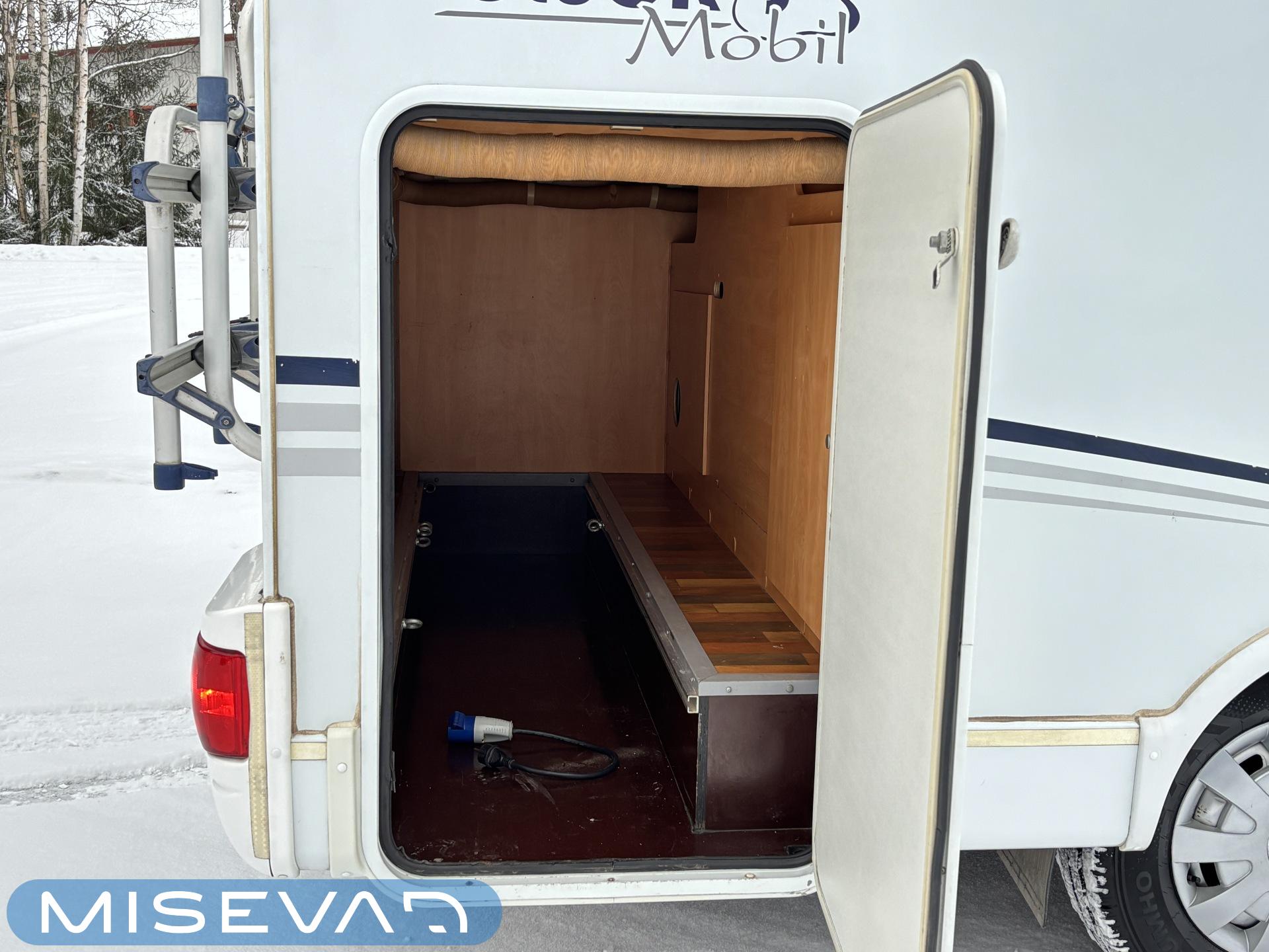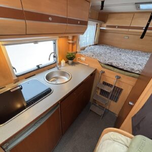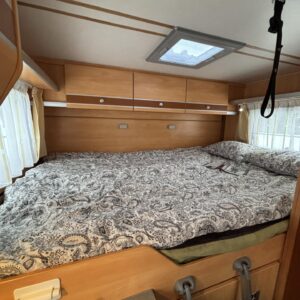 Poikittaisella parivuoteella ja takatallilla varustettu alle seiskametrinen matkakoti esimerkiksi pariskunnille. Tässä yksilössä ajomääräkin on vielä ihan maltillisella tasolla. Auton takaosassa on poikittainen parivuode ja sen alle jää mukavasti säilytystiloja. Keskelle autoa asemoituu keittiötilat ja toiselta sivulta löytyy kylppäritilat. Edessä on pöytäryhmä minne yhdistyvät kääntyvät ohjaamon penkit. Lämmön pirttiin toimittaa Trumaticin tehokkainta mallia (6kw) oleva ilmapuhalluslämmitin ja se on kaasukäyttöinen. Autossa on tietysti myös normaalit matkailuajoneuvon varusteet, eli löytyy jääkaappi, lämminvesiboileri, sekä liesi. Kesäkuumalla viilennys tapahtuu ajon aikana ohjaamoilmastoinnilla ja leirissä kattoilmastoinnin avulla (tarvitaan verkkovirta). Pari fillaria matkaa kätevästi mukana takaseinälle sijoitetussa pyörätelineessä. Löytyypä autosta vielä pienille verkkovirtalaitteille tarkoitettu 600W siniaaltoinvertterikin ja aurinkopaneeli. Ajettavissa henkilöauton B-kortilla ja rekisteröidyt matkustuspaikat neljälle henkilölle.