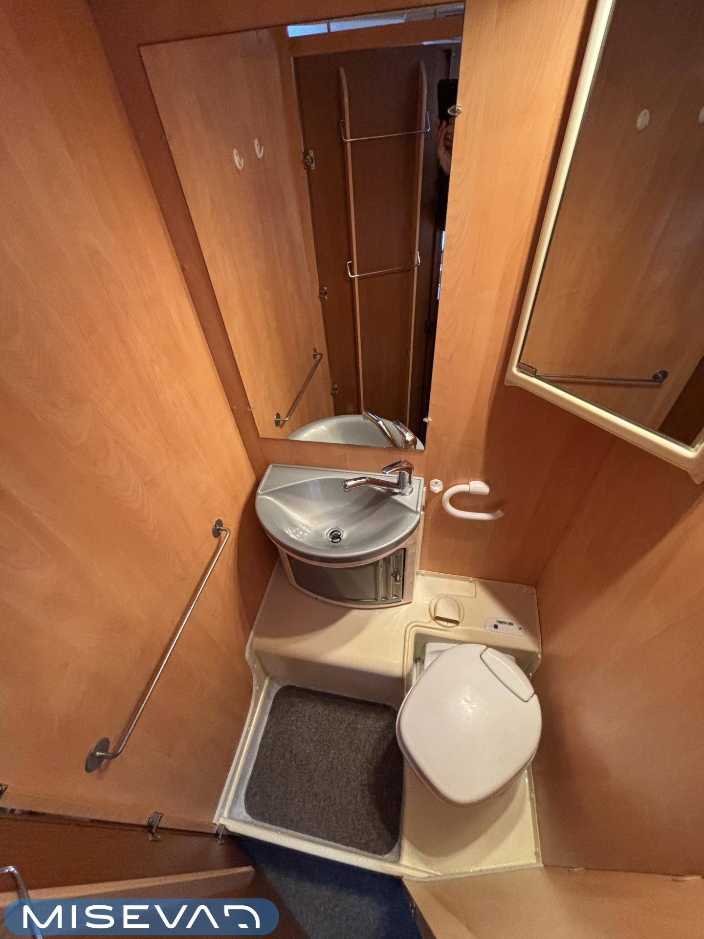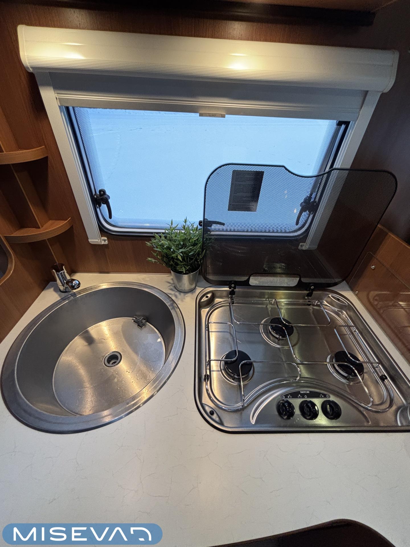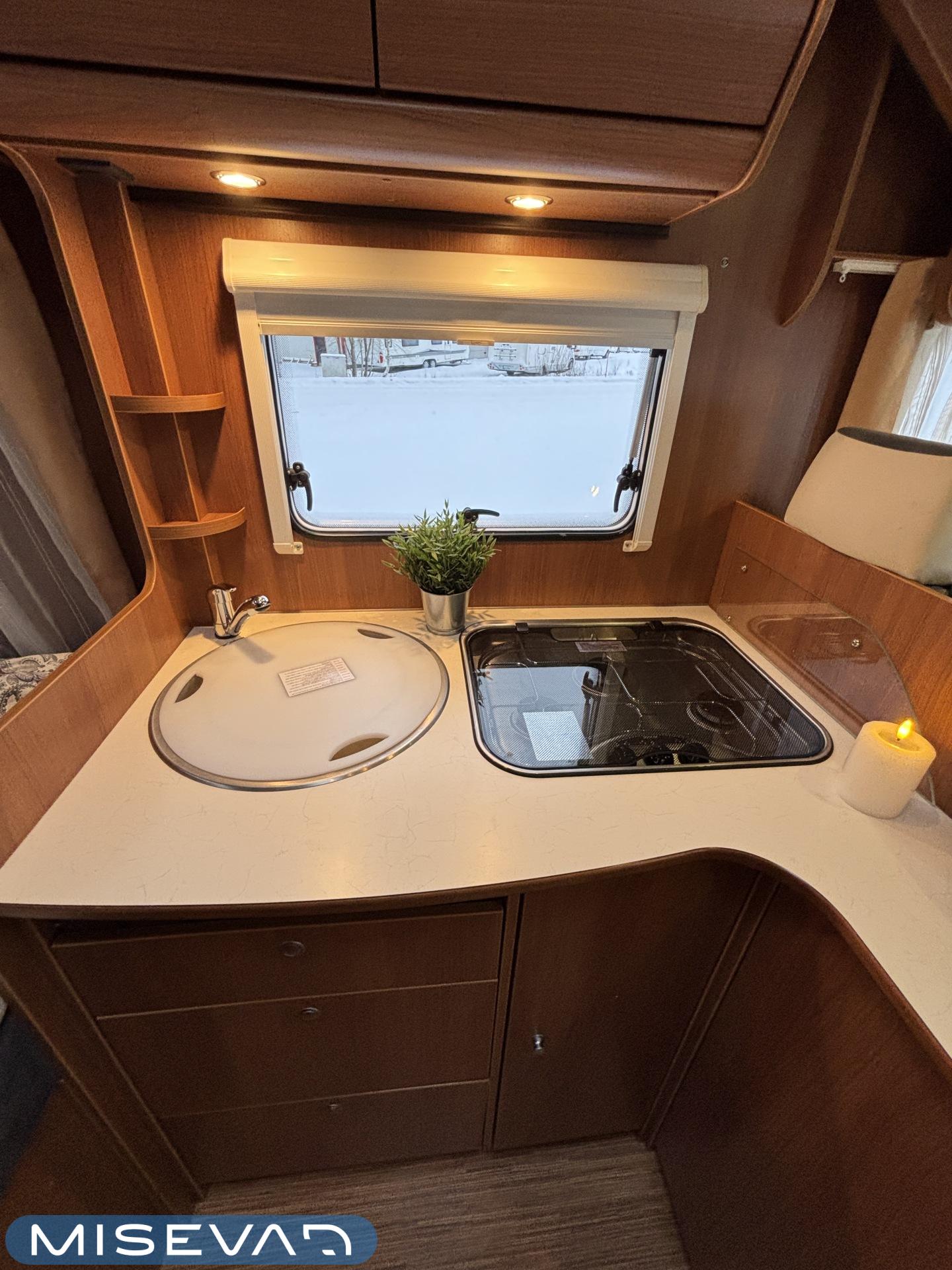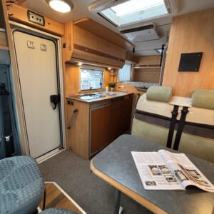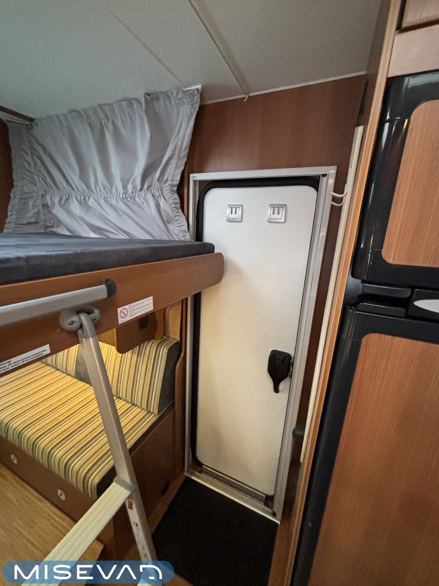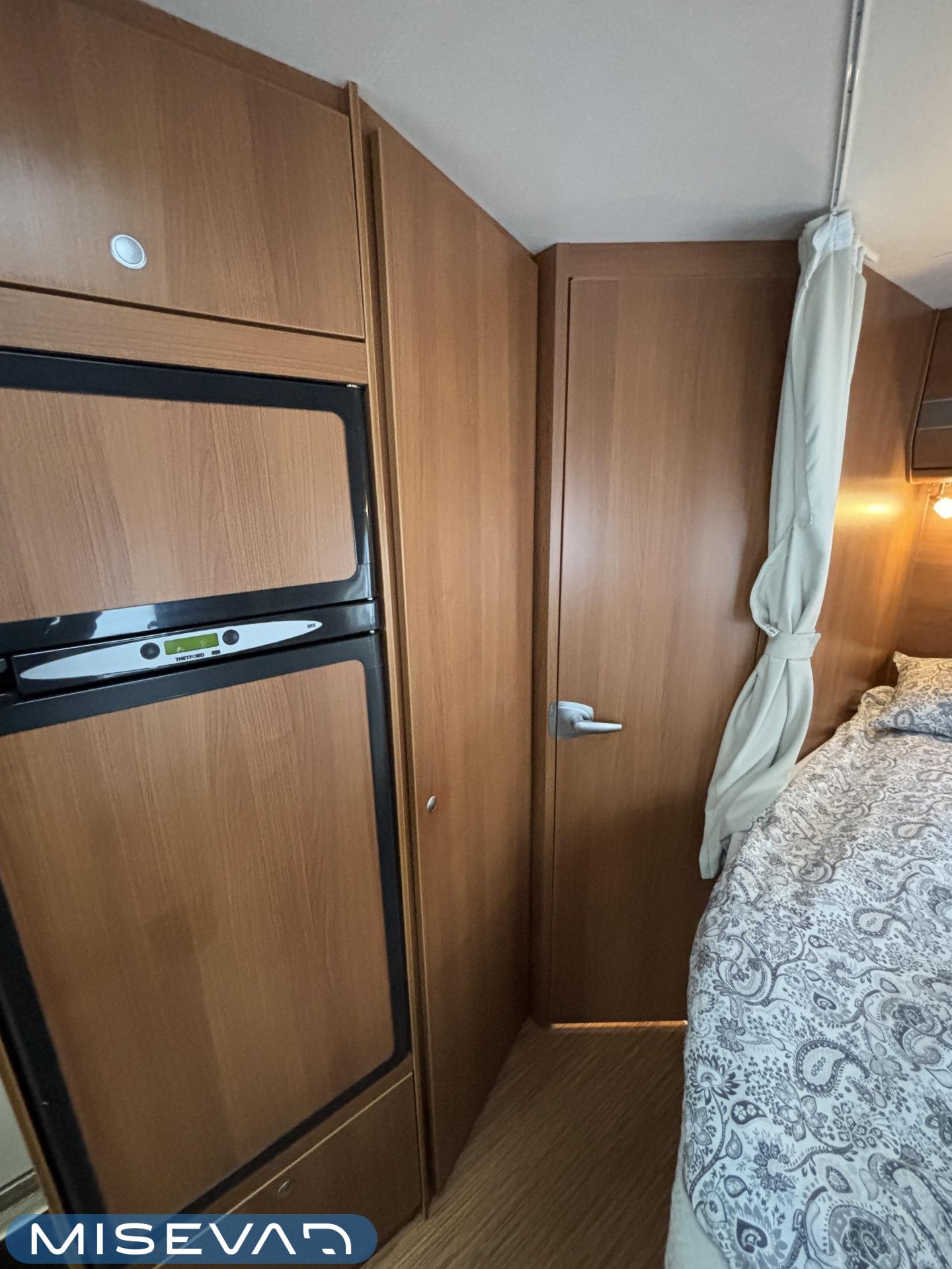 Poikittaisella parivuoteella ja takatallilla varustettu alle seiskametrinen matkakoti esimerkiksi pariskunnille. Tässä yksilössä ajomääräkin on vielä ihan maltillisella tasolla. Auton takaosassa on poikittainen parivuode ja sen alle jää mukavasti säilytystiloja. Keskelle autoa asemoituu keittiötilat ja toiselta sivulta löytyy kylppäritilat. Edessä on pöytäryhmä minne yhdistyvät kääntyvät ohjaamon penkit. Lämmön pirttiin toimittaa Trumaticin tehokkainta mallia (6kw) oleva ilmapuhalluslämmitin ja se on kaasukäyttöinen. Autossa on tietysti myös normaalit matkailuajoneuvon varusteet, eli löytyy jääkaappi, lämminvesiboileri, sekä liesi. Kesäkuumalla viilennys tapahtuu ajon aikana ohjaamoilmastoinnilla ja leirissä kattoilmastoinnin avulla (tarvitaan verkkovirta). Pari fillaria matkaa kätevästi mukana takaseinälle sijoitetussa pyörätelineessä. Löytyypä autosta vielä pienille verkkovirtalaitteille tarkoitettu 600W siniaaltoinvertterikin ja aurinkopaneeli. Ajettavissa henkilöauton B-kortilla ja rekisteröidyt matkustuspaikat neljälle henkilölle.