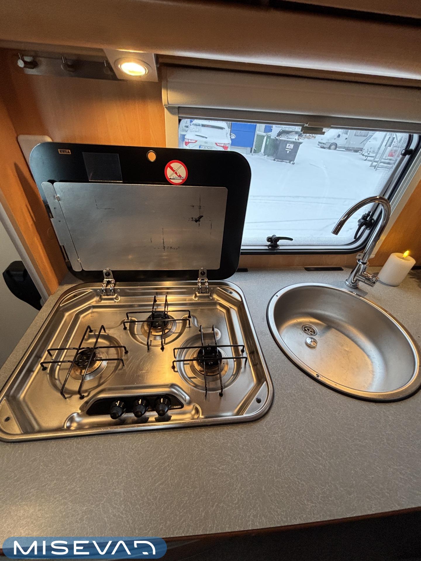 Aurinkopaneeli, CD-soitin, Jääkaappi, Kasetti WC, Kasettiverhot, Kattoluukku, Keskuslämmitys, Liesi, Lohkolämmitin, Lämminvesiboileri, Pakastelokero, Parivuode, Pesuallas, Pyöräteline, Radio, Sähkörappu, Trumatic, Vakionopeudensäädin, Ilmastointi (ohjaamo), Ilmastointi (asuintila), Talvirenkaat(kitka), Invertteri, ABS-jarrut, Airbag, Ajotietokone, Ohjaustehostin, Lattiamatot asunto-osassa