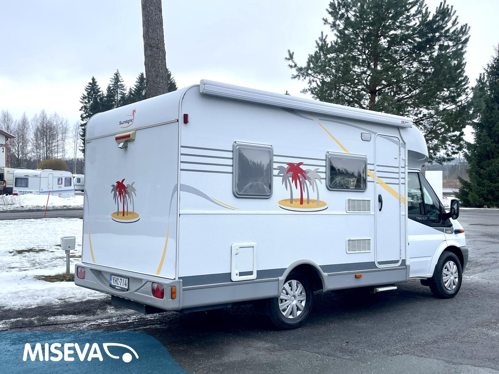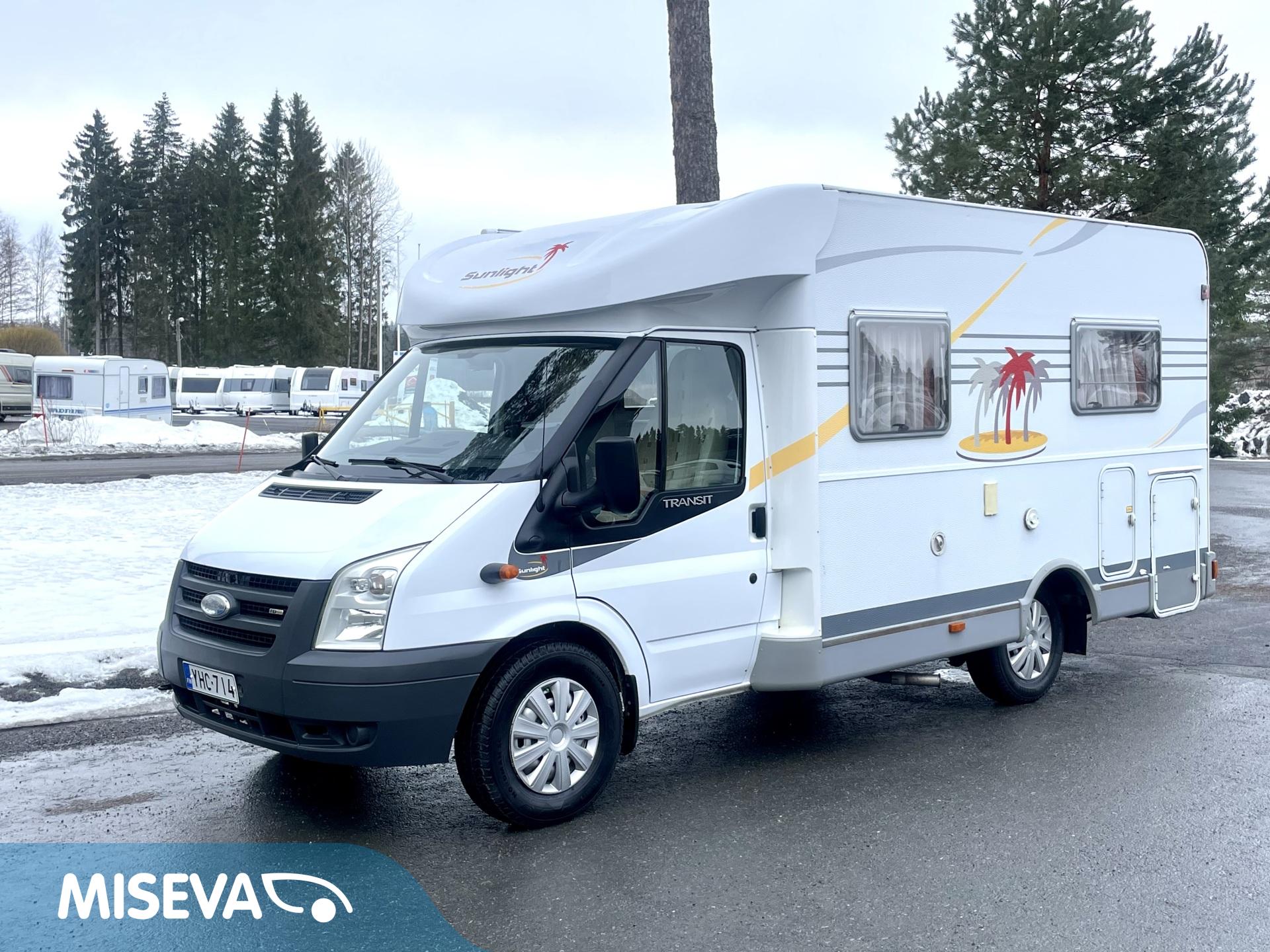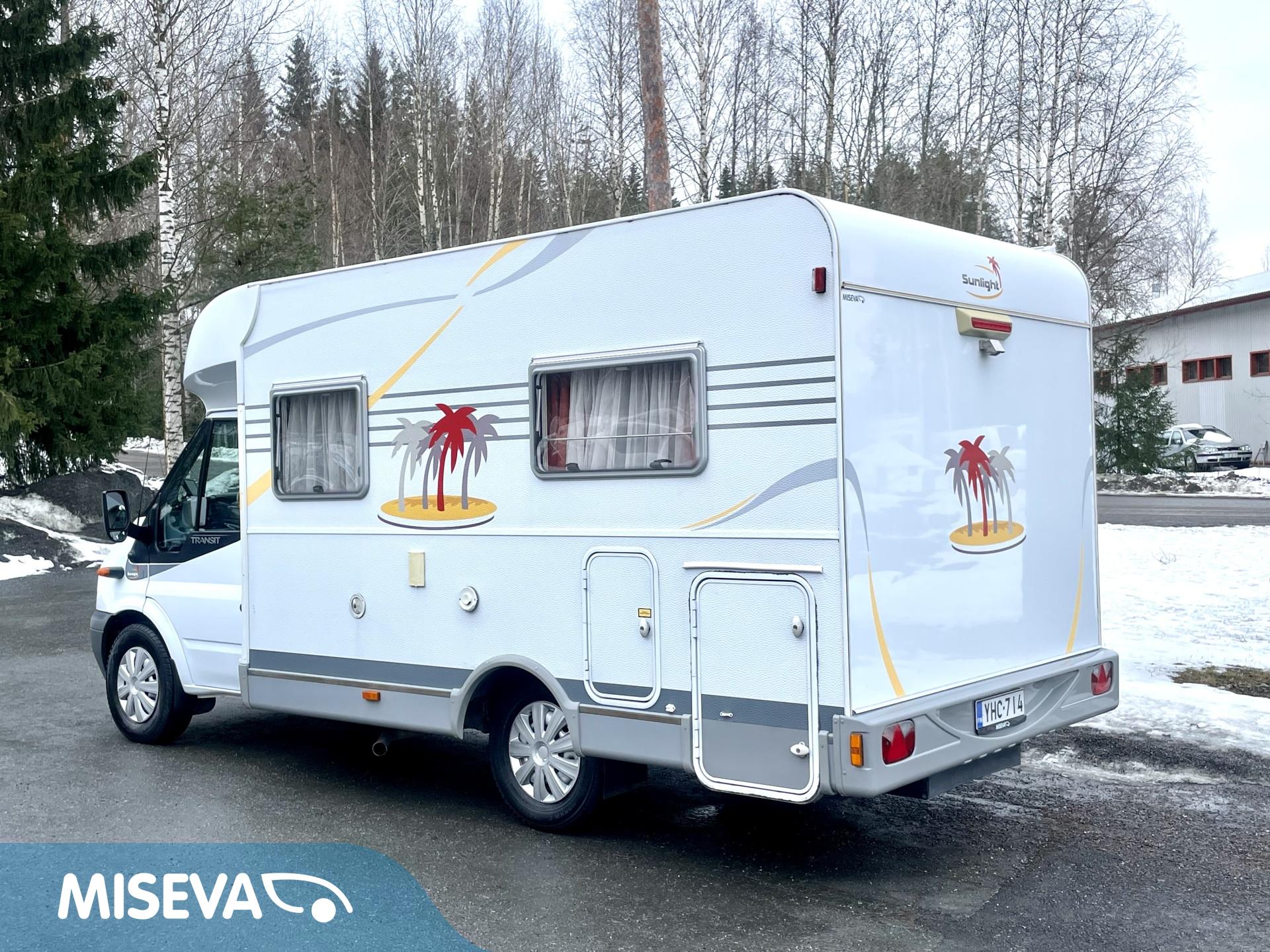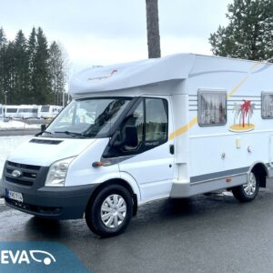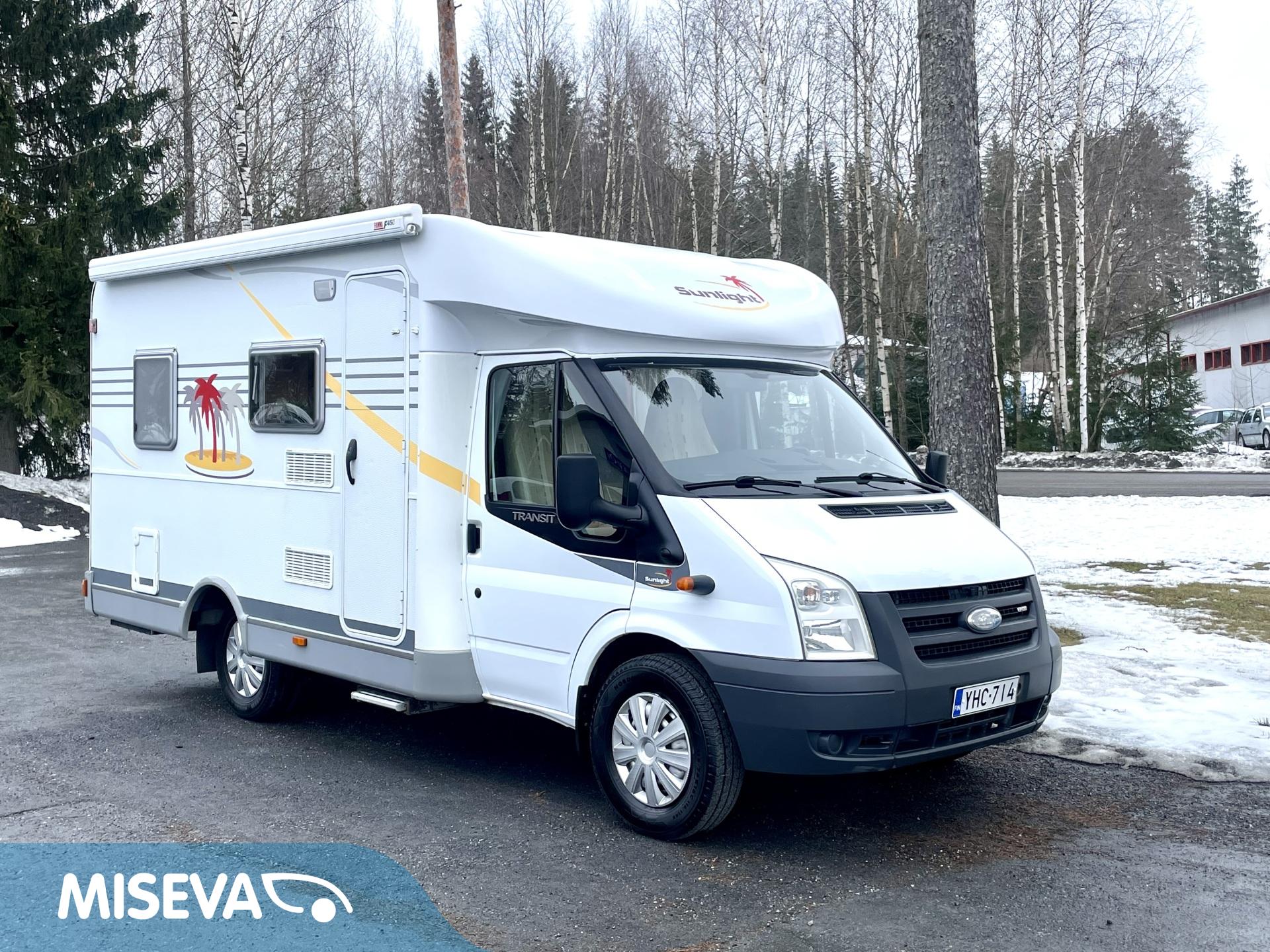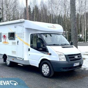Ilmastoitu Fordin ketjukoneella varustettu asuntoauto, mikä käy jopa ainoaksi käyttöautoksi lyhyen pituutensa puolesta.