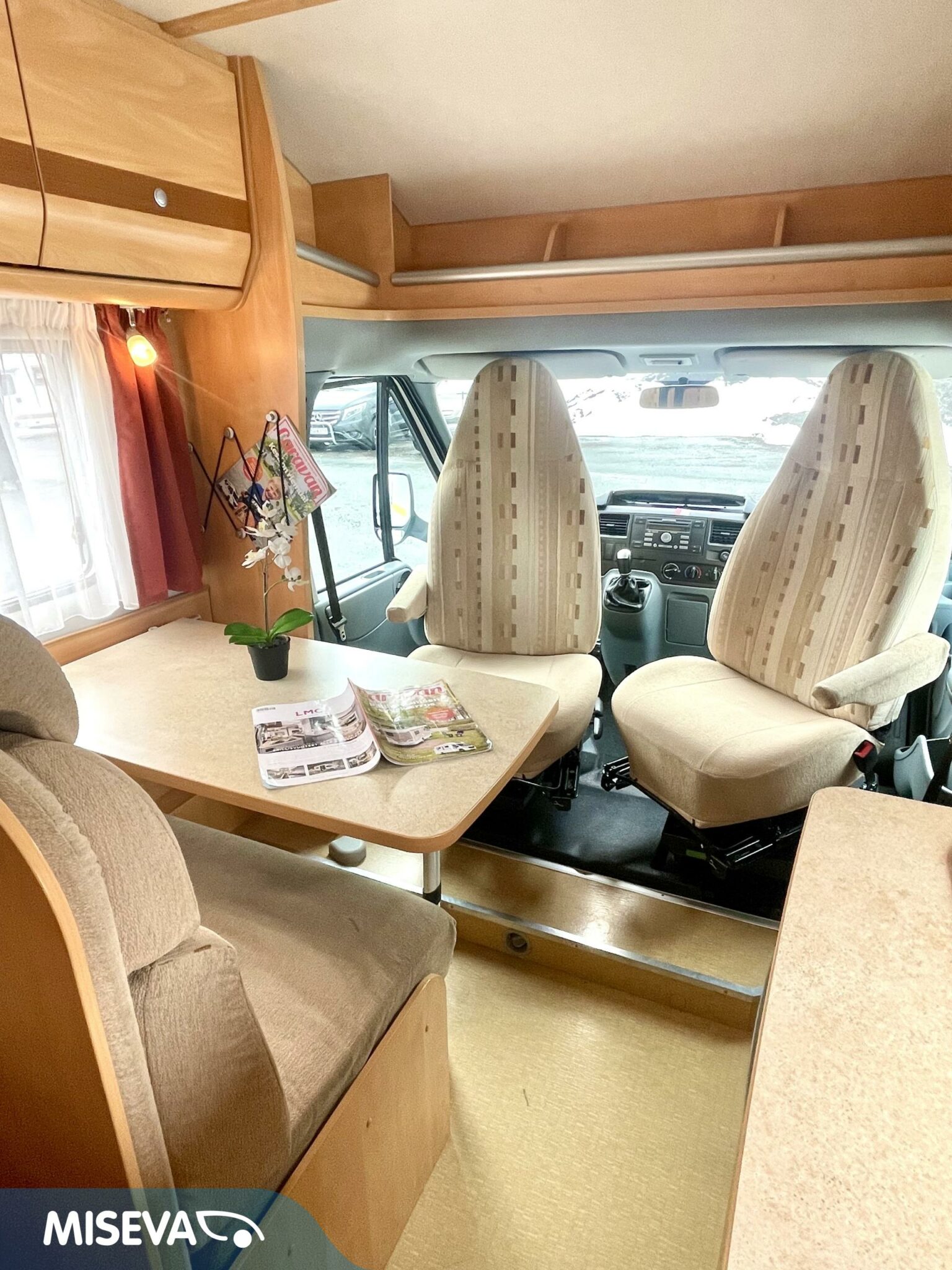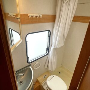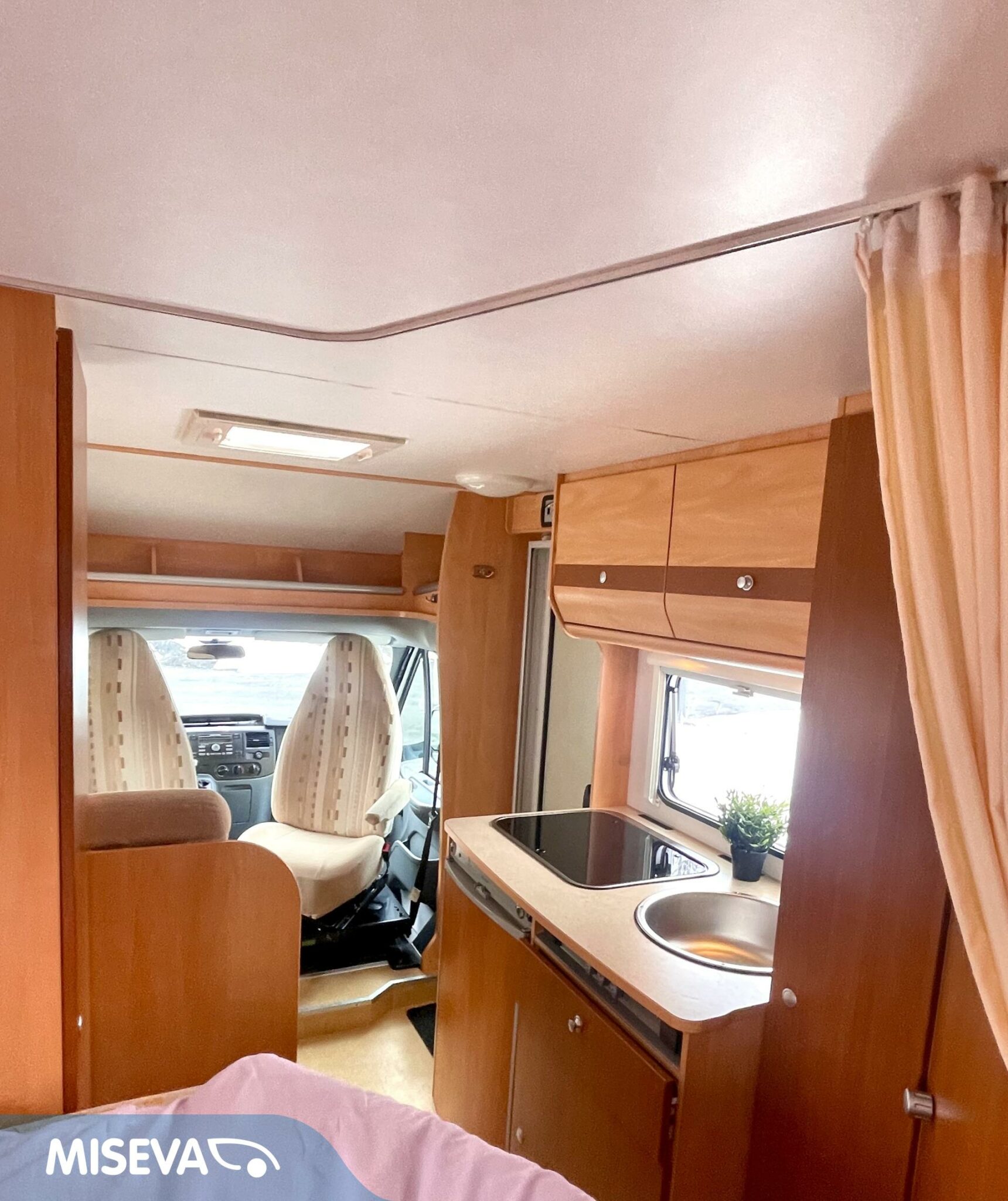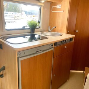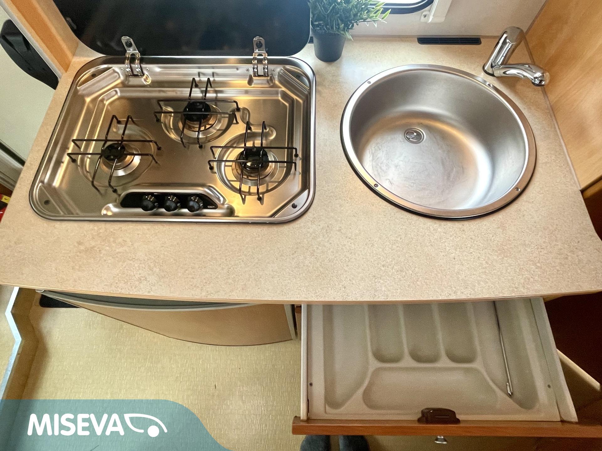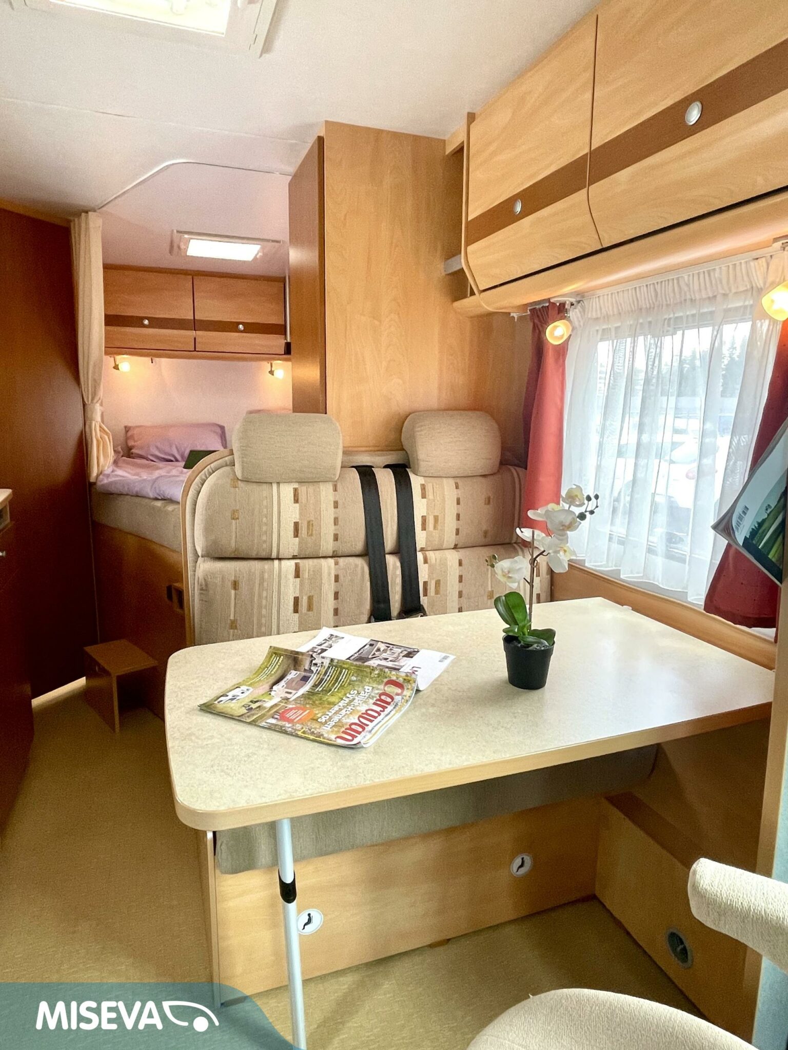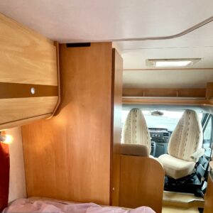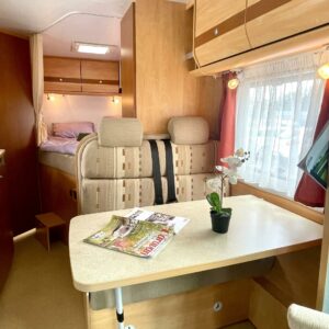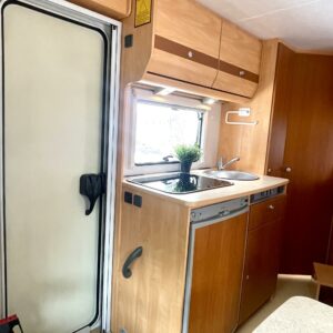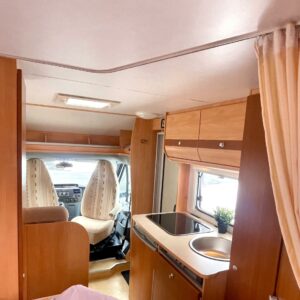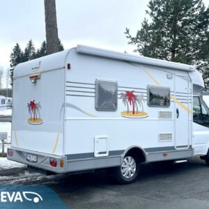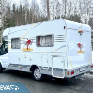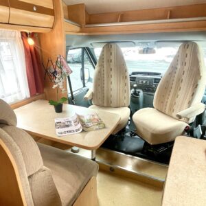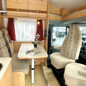 Auton etuosassa on istuinryhmä neljälle kääntyvine etupenkkeineen, keskiosassa keittiö ja takaosassa sijaitsee tilava WC/suihkutila sekä pitkittäinen parivuode.