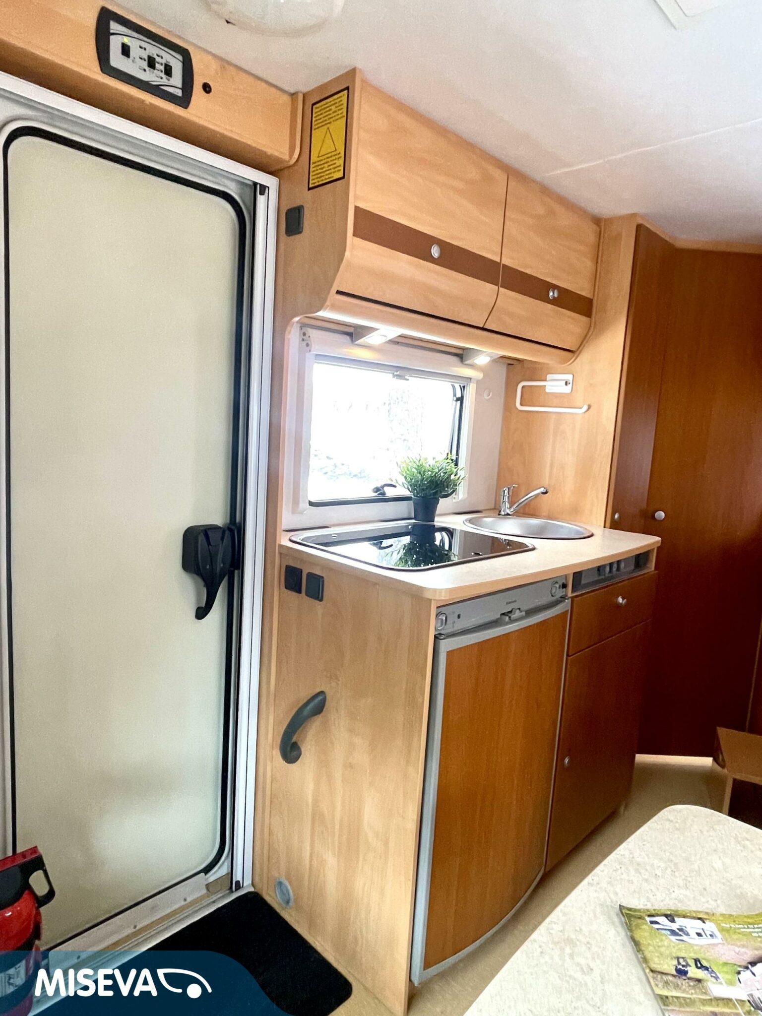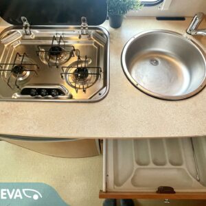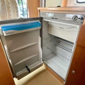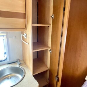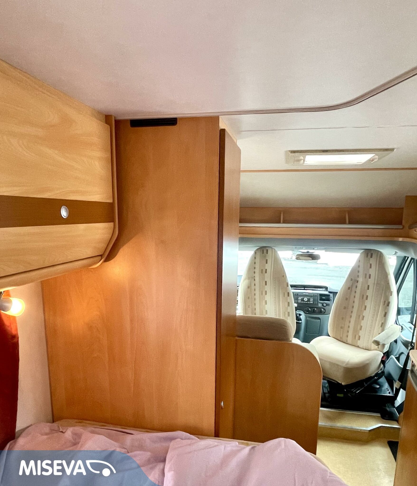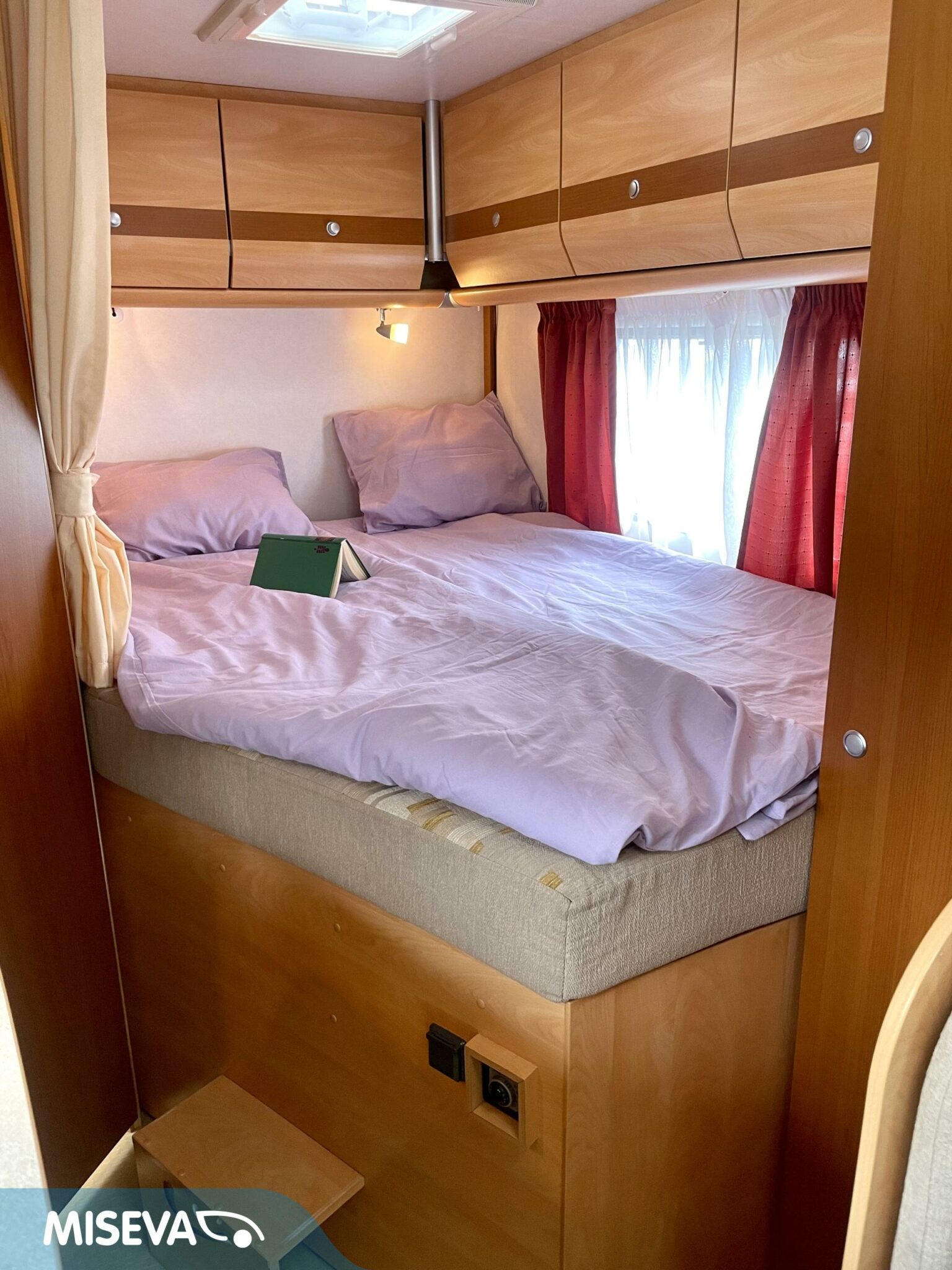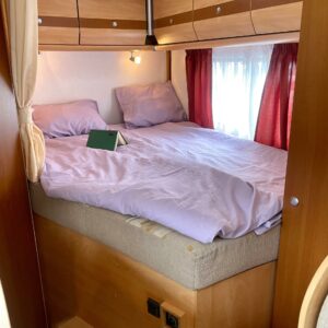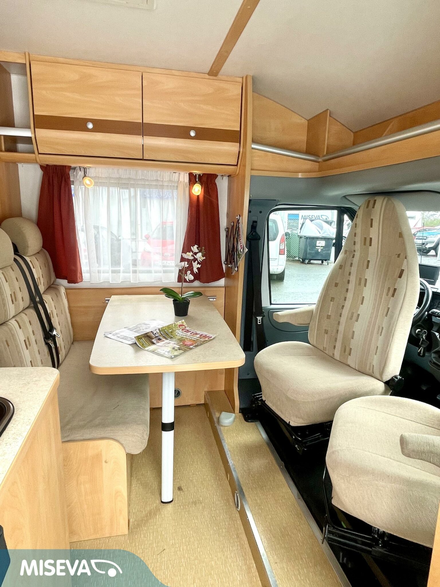 Auton etuosassa on istuinryhmä neljälle kääntyvine etupenkkeineen, keskiosassa keittiö ja takaosassa sijaitsee tilava WC/suihkutila sekä pitkittäinen parivuode.
