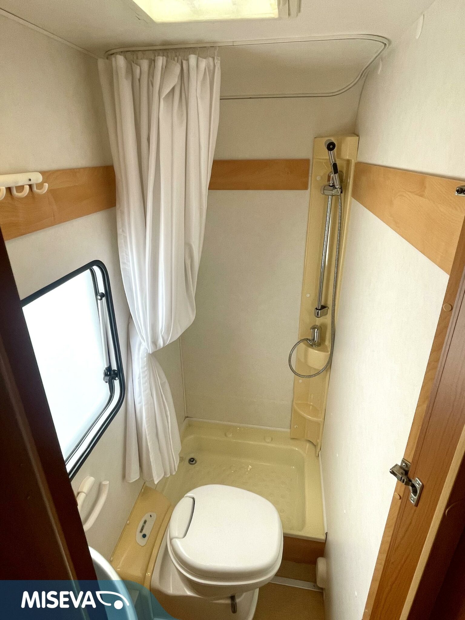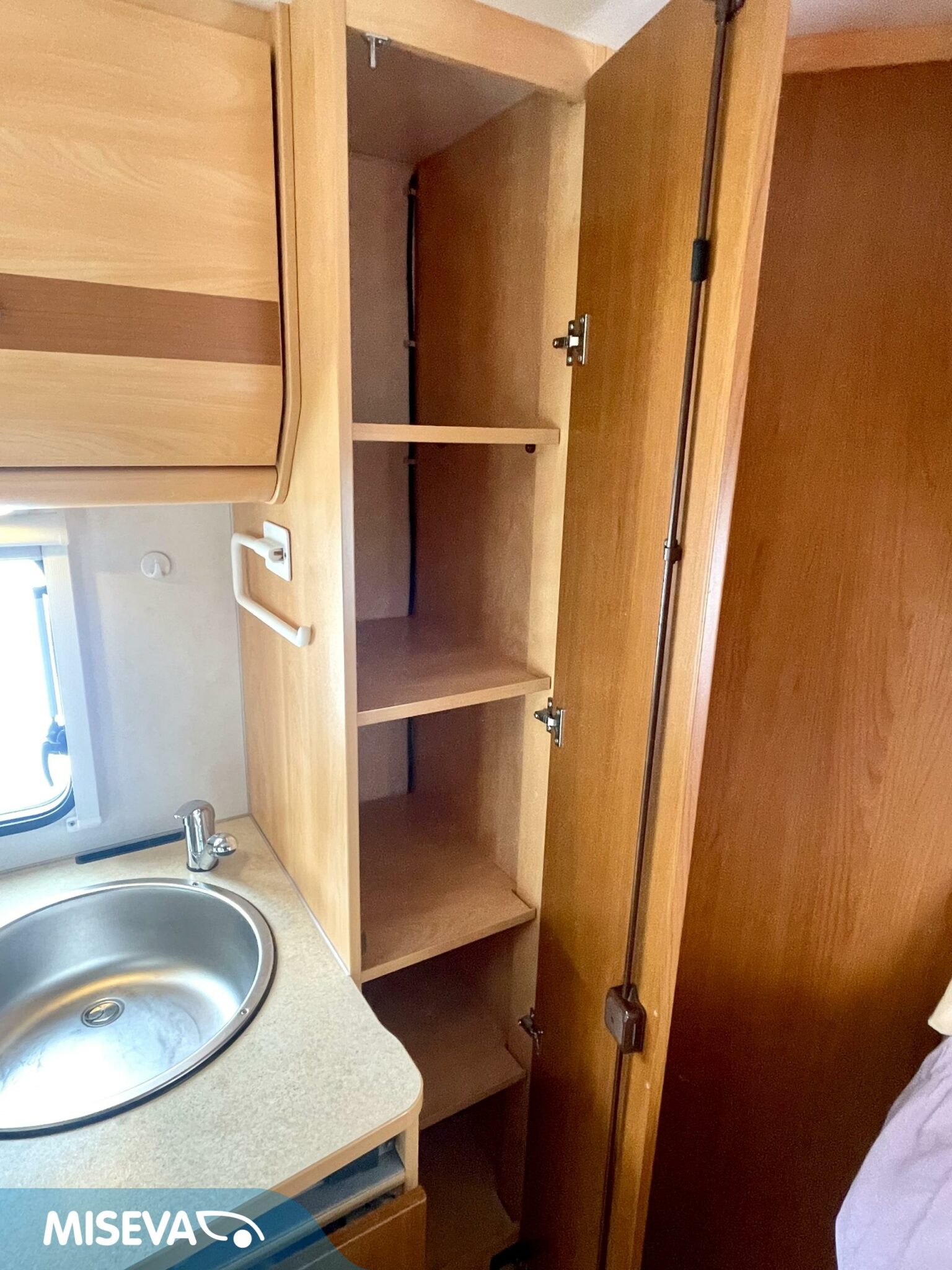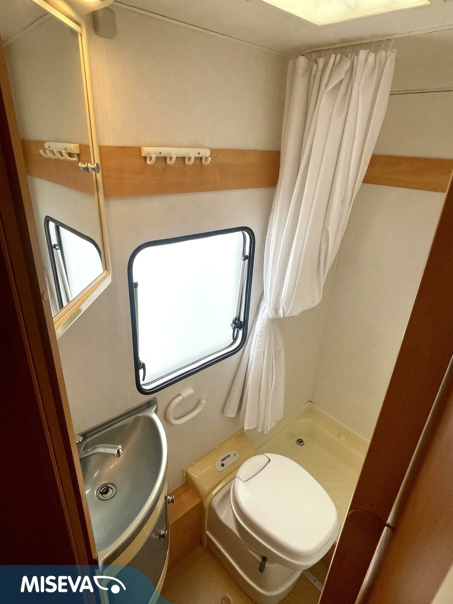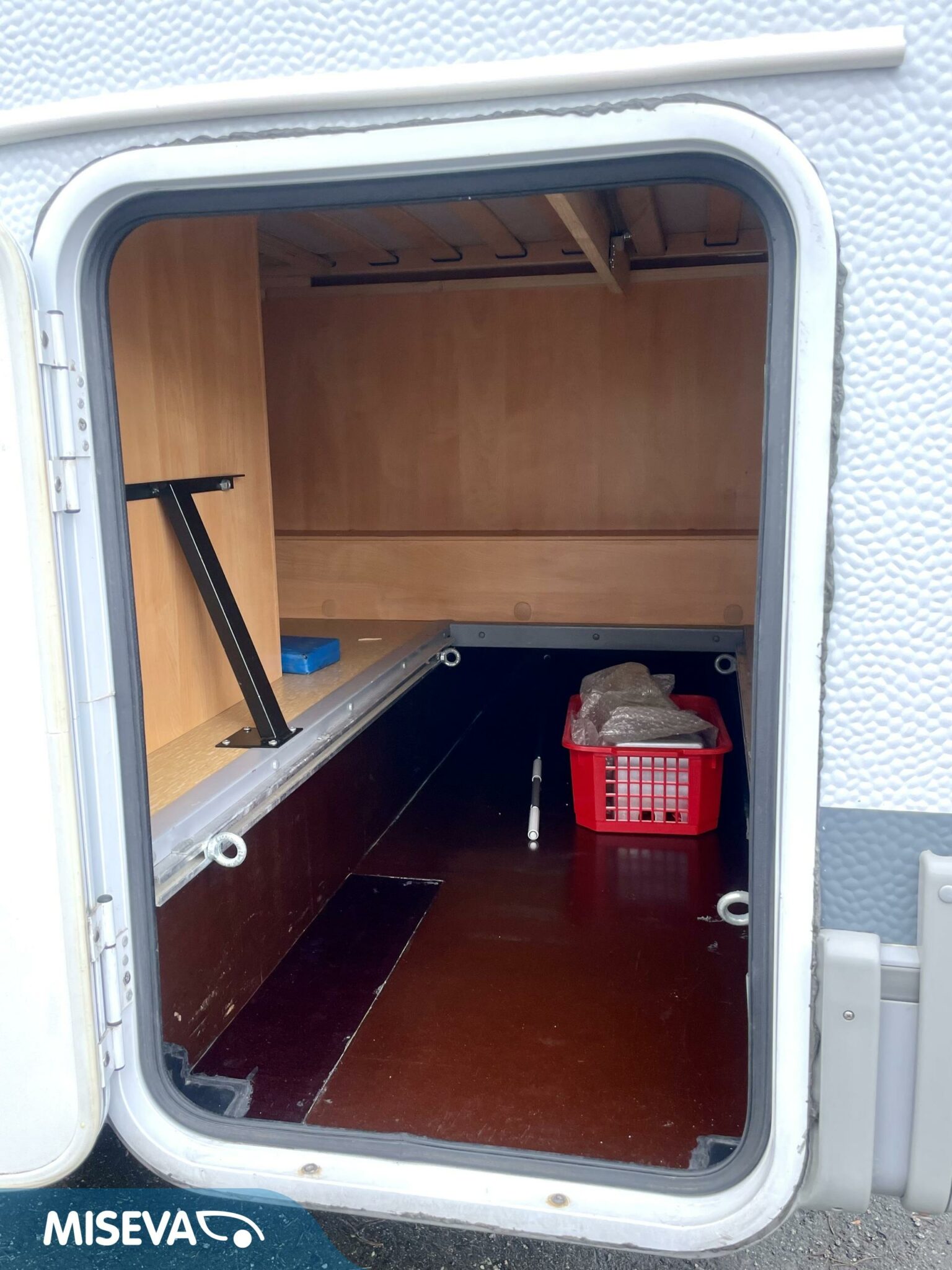 Auton etuosassa on istuinryhmä neljälle kääntyvine etupenkkeineen, keskiosassa keittiö ja takaosassa sijaitsee tilava WC/suihkutila sekä pitkittäinen parivuode.