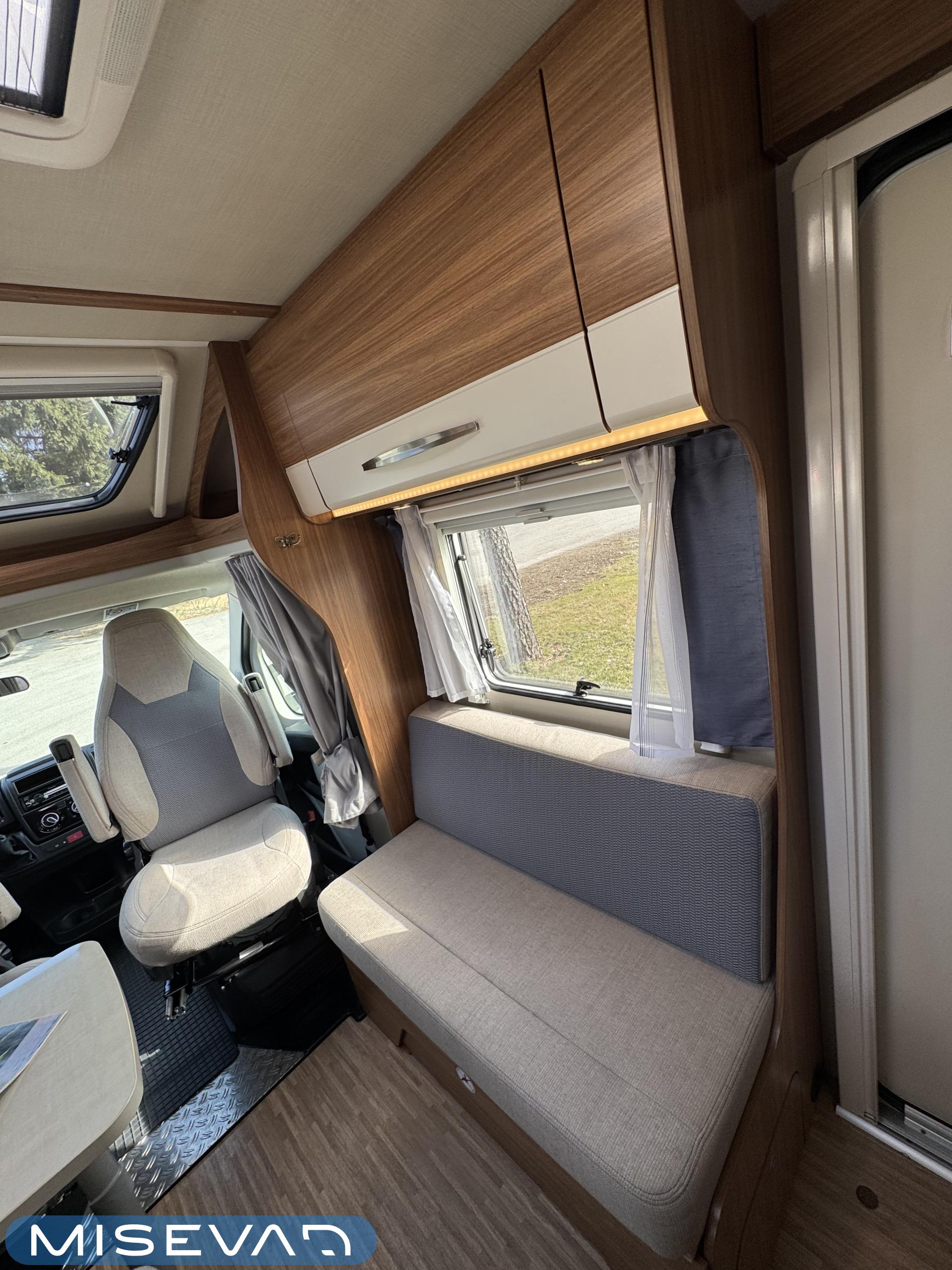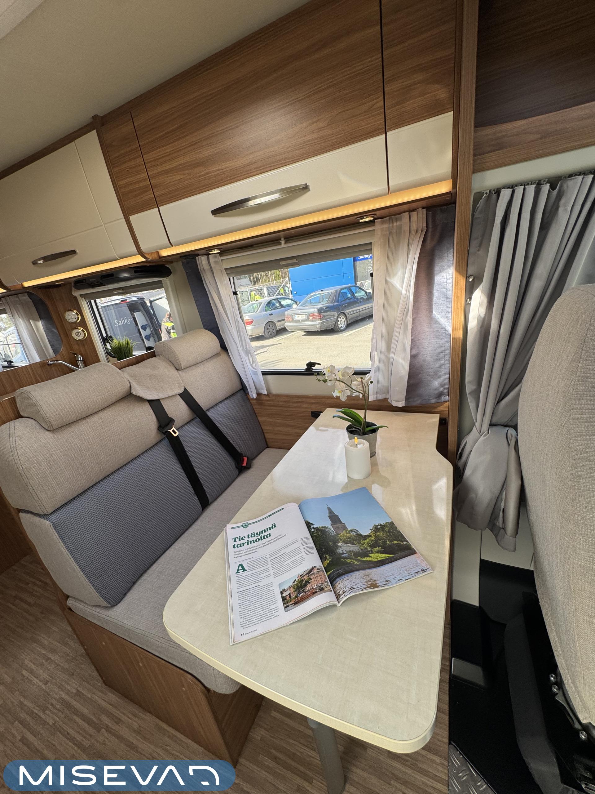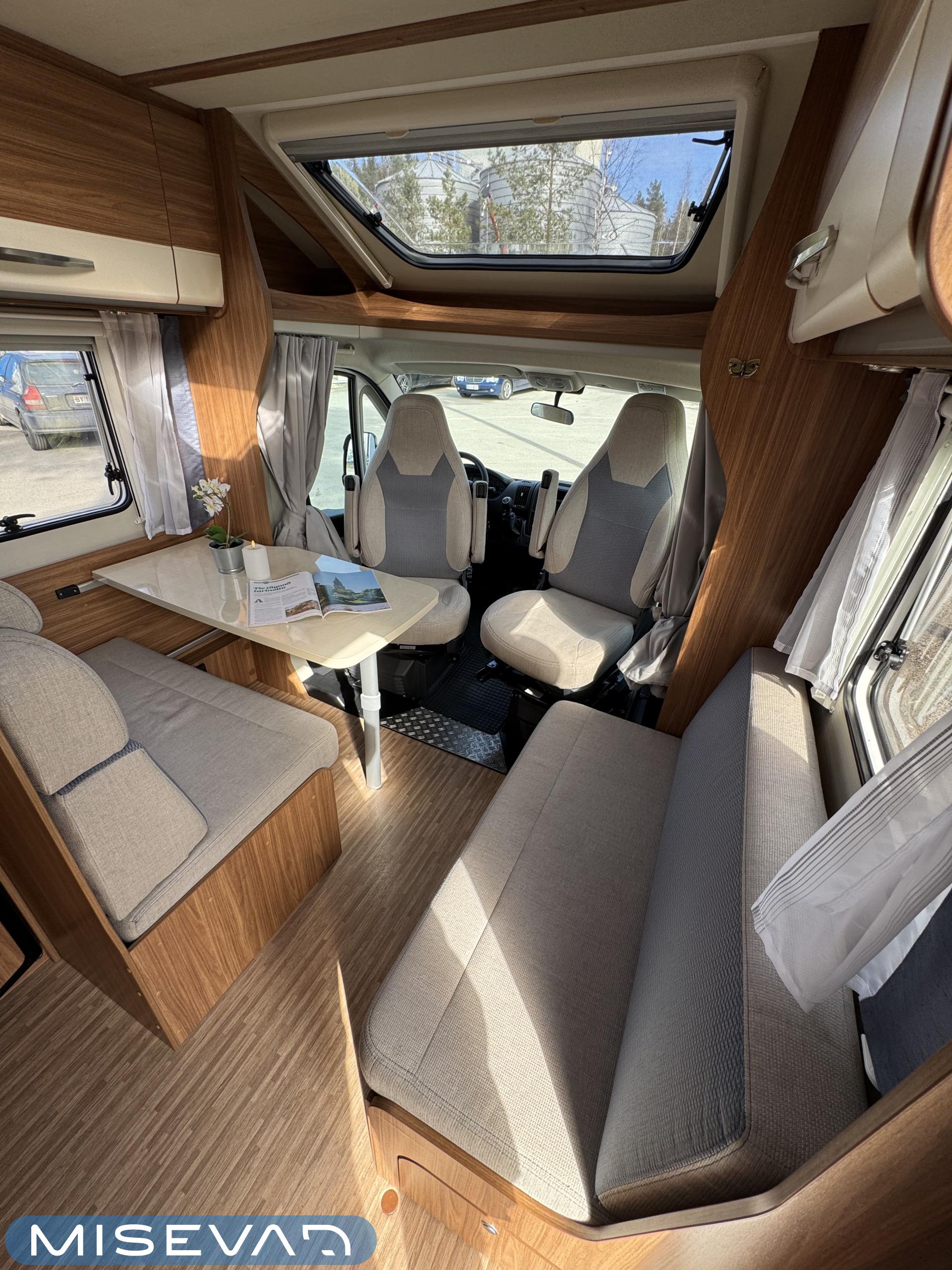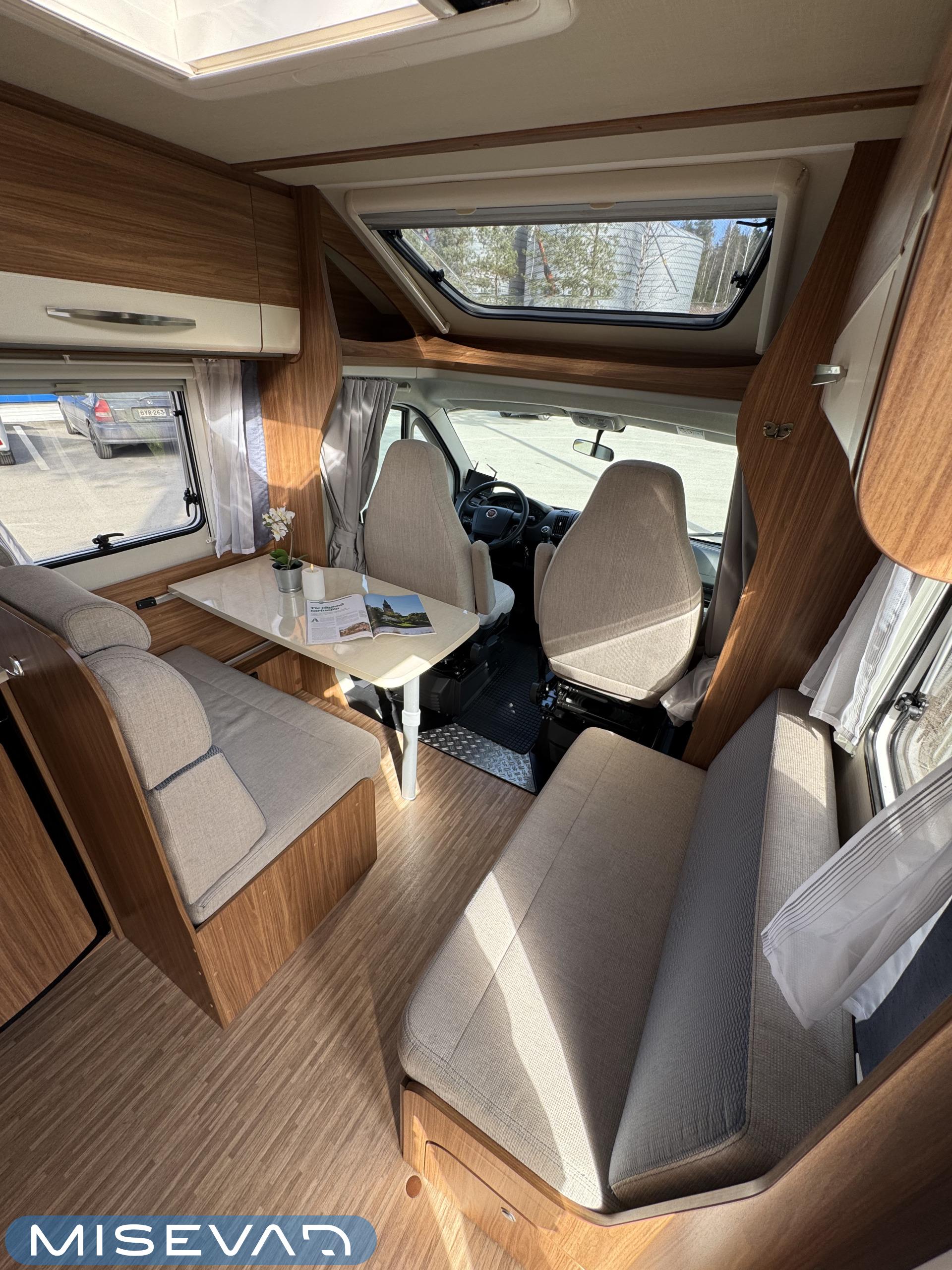 Onpas mukavasti lattiatilaa, on ensimmäinen havainto kun autoon sisään astuu. Ja todellakin, tässä autossa on poikkeuksellisen avaran oloinen pohjaratkaisu. Tämä voisi palvella hienosti esimerkiksi silloin, jos mukana matkustaa lemmikkejä mitkä viettävät aikaansa lattialla ollessaan sisätiloissa. Seuraava asia mikä tulee ajatuksiin on se, että onpas siisti pinnoiltaan. Ja totta tämäkin, auto on palvellut historiansa aikana vain kolmea käyttäjäomistajaa ja auto on selvästi ollut hyvällä pidolla. Auton takaosasta löytyy pitkittäinen parivuode. Vieressä sijaitsee kylppäritilat ja suihku. Keskelle sijoittuu keittiö ja säilytystiloja. Säilytystiloista mainittakoon erikseen vielä iso kaksiovinen vaatekaappi. Etuosa on ruokailu/seurustelutoimintoja varten. Kääntyvien etupenkkien ja leveän sivusohvan ansiosta tässä istuu mukavasti jopa kuusi henkilöä. Pöytäryhmästä saadaan tilapäisvuode (ehkä enemminkin lapselle). Lämmitysjärjestelmänä toimii Trumaticin ilmalämmitys. Ohjaamossa varusteina mm. ilmastointi ja vakionopeuden säädin. Auto on rekisteröity 4 henkilölle ja kaikille löytyy 3-piste turvavyöt. Ajaminen onnistuu ihan perus B-kortilla (henkilöauto).