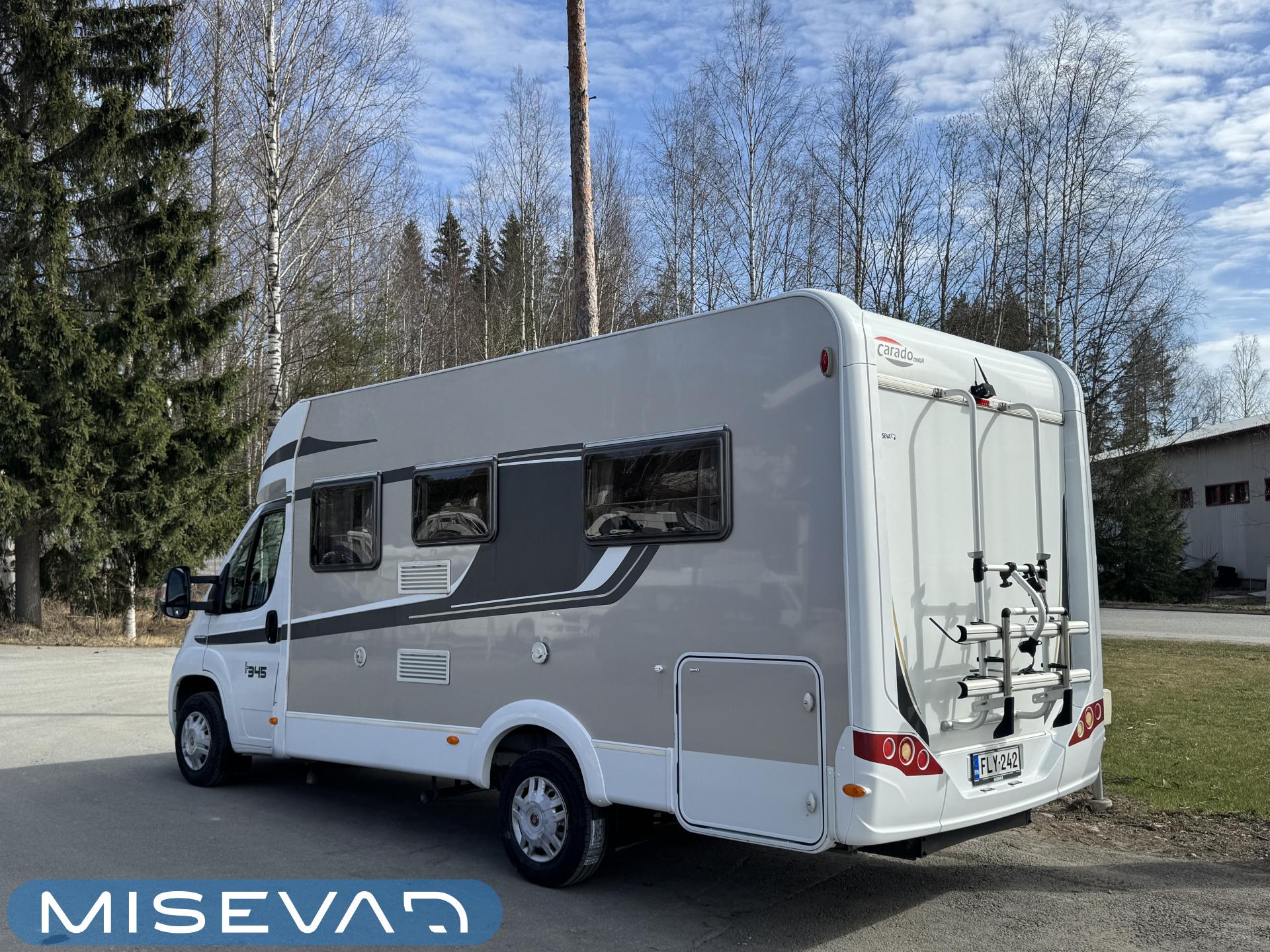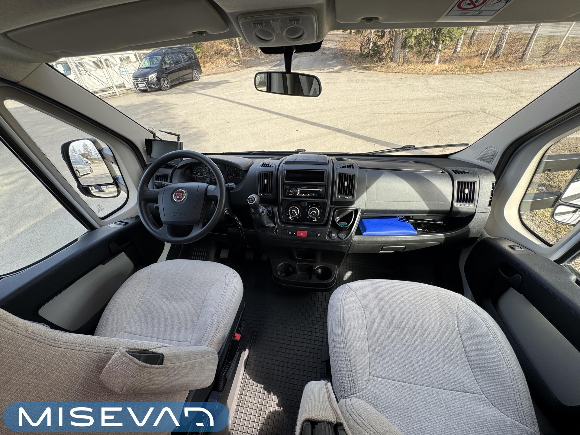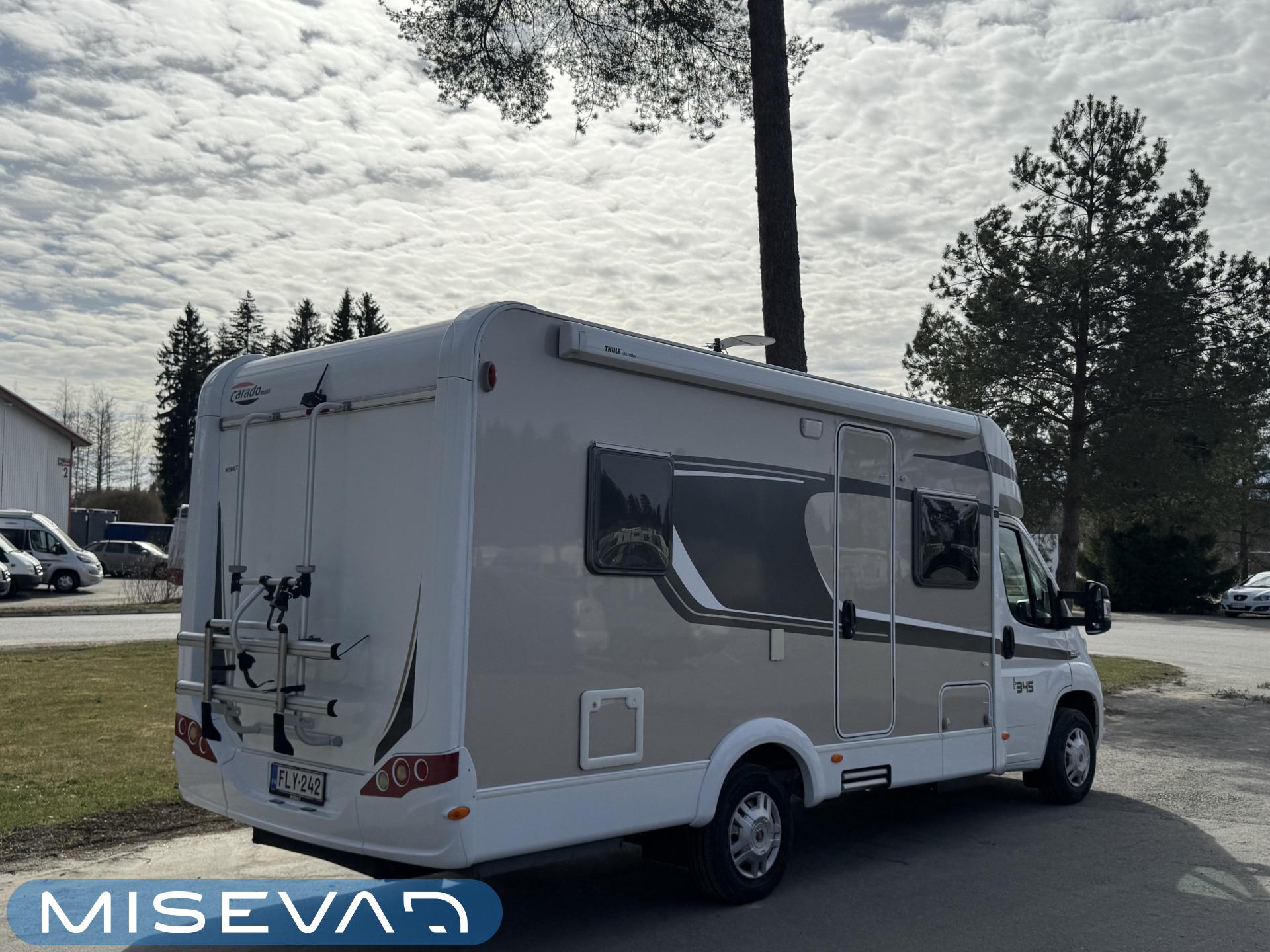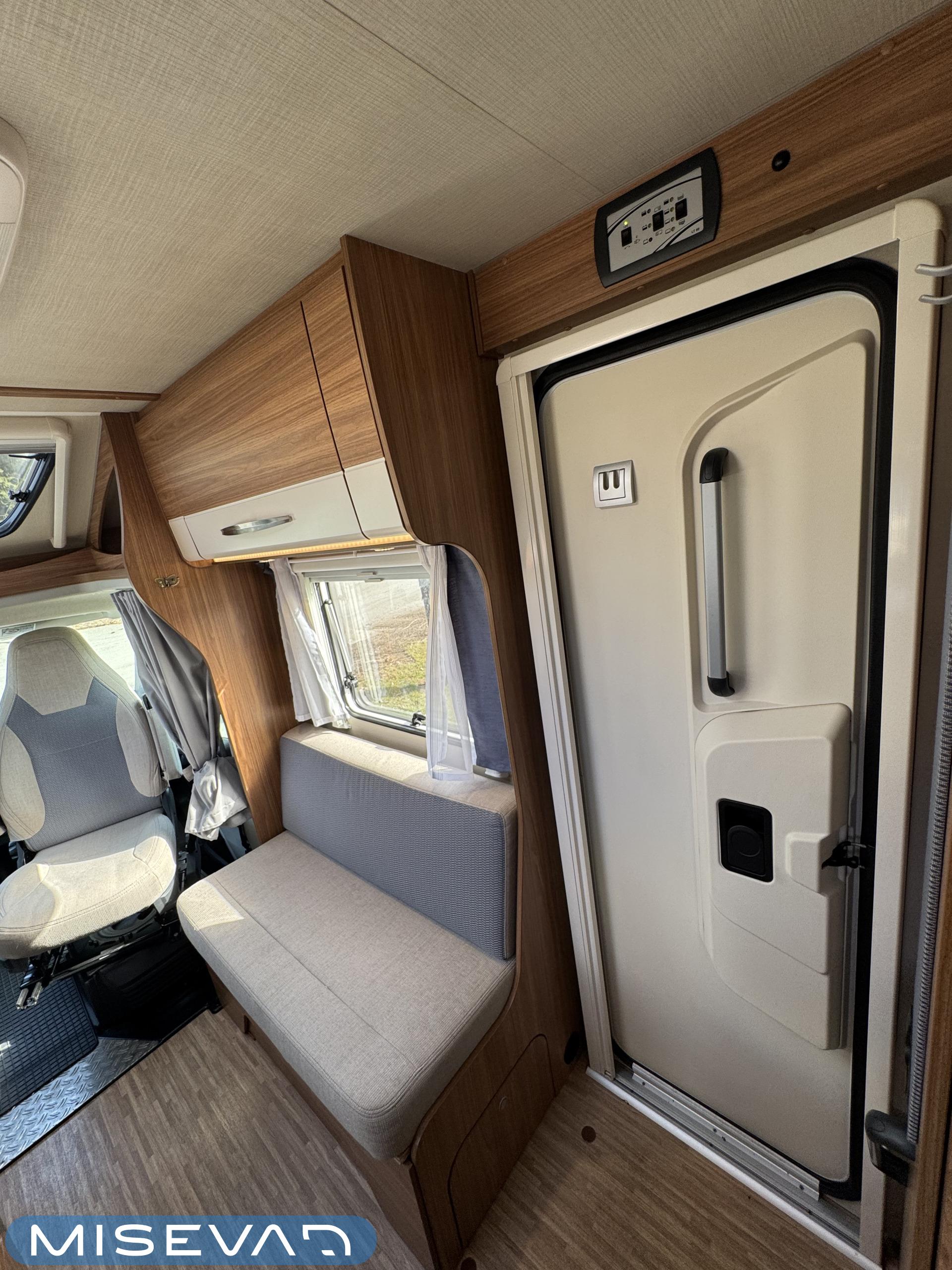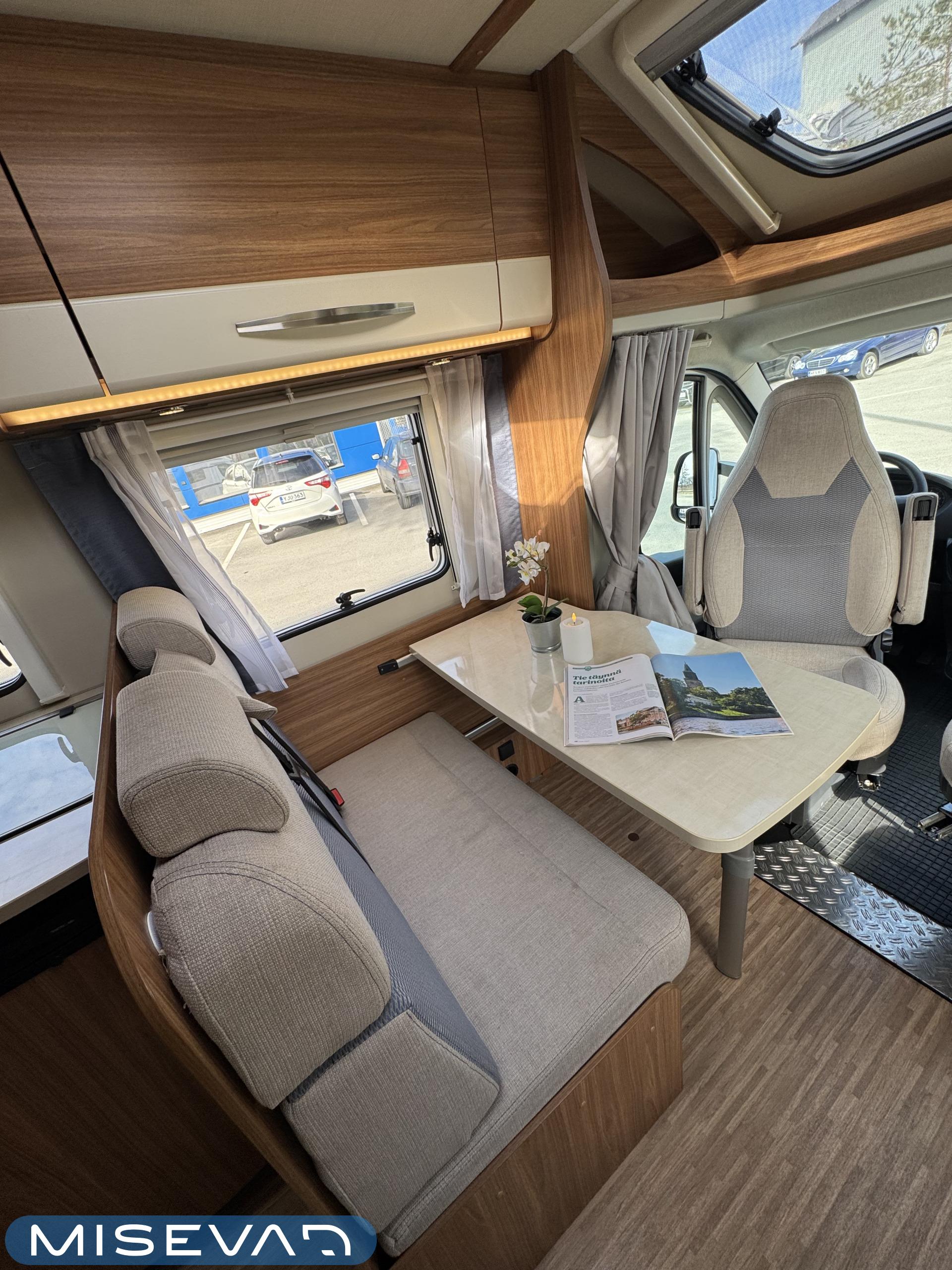 Onpas mukavasti lattiatilaa, on ensimmäinen havainto kun autoon sisään astuu. Ja todellakin, tässä autossa on poikkeuksellisen avaran oloinen pohjaratkaisu. Tämä voisi palvella hienosti esimerkiksi silloin, jos mukana matkustaa lemmikkejä mitkä viettävät aikaansa lattialla ollessaan sisätiloissa. Seuraava asia mikä tulee ajatuksiin on se, että onpas siisti pinnoiltaan. Ja totta tämäkin, auto on palvellut historiansa aikana vain kolmea käyttäjäomistajaa ja auto on selvästi ollut hyvällä pidolla. Auton takaosasta löytyy pitkittäinen parivuode. Vieressä sijaitsee kylppäritilat ja suihku. Keskelle sijoittuu keittiö ja säilytystiloja. Säilytystiloista mainittakoon erikseen vielä iso kaksiovinen vaatekaappi. Etuosa on ruokailu/seurustelutoimintoja varten. Kääntyvien etupenkkien ja leveän sivusohvan ansiosta tässä istuu mukavasti jopa kuusi henkilöä. Pöytäryhmästä saadaan tilapäisvuode (ehkä enemminkin lapselle). Lämmitysjärjestelmänä toimii Trumaticin ilmalämmitys. Ohjaamossa varusteina mm. ilmastointi ja vakionopeuden säädin. Auto on rekisteröity 4 henkilölle ja kaikille löytyy 3-piste turvavyöt. Ajaminen onnistuu ihan perus B-kortilla (henkilöauto).