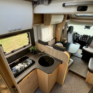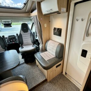 Auton etuosasta löytyy lyhyellä sivusohvalla ja kääntyvillä etuistuimilla ”ryyditetty” L- pöytäryhmä. Pöytäryhmän päälle laskeutuu tarpeen vaatiessa lisää makuupaikkoja nostovuoteen muodossa.