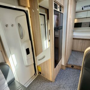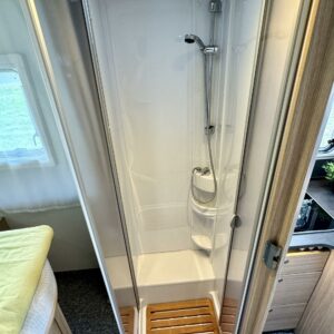 Auton takaosassa on muhkean saarekevuoteen lisäksi erilliset WC-/ suihkutilat. Takapään saa nerokkaan ovisysteemin ansiosta tarvittaessa eristytettyä muusta asunto- osasta.