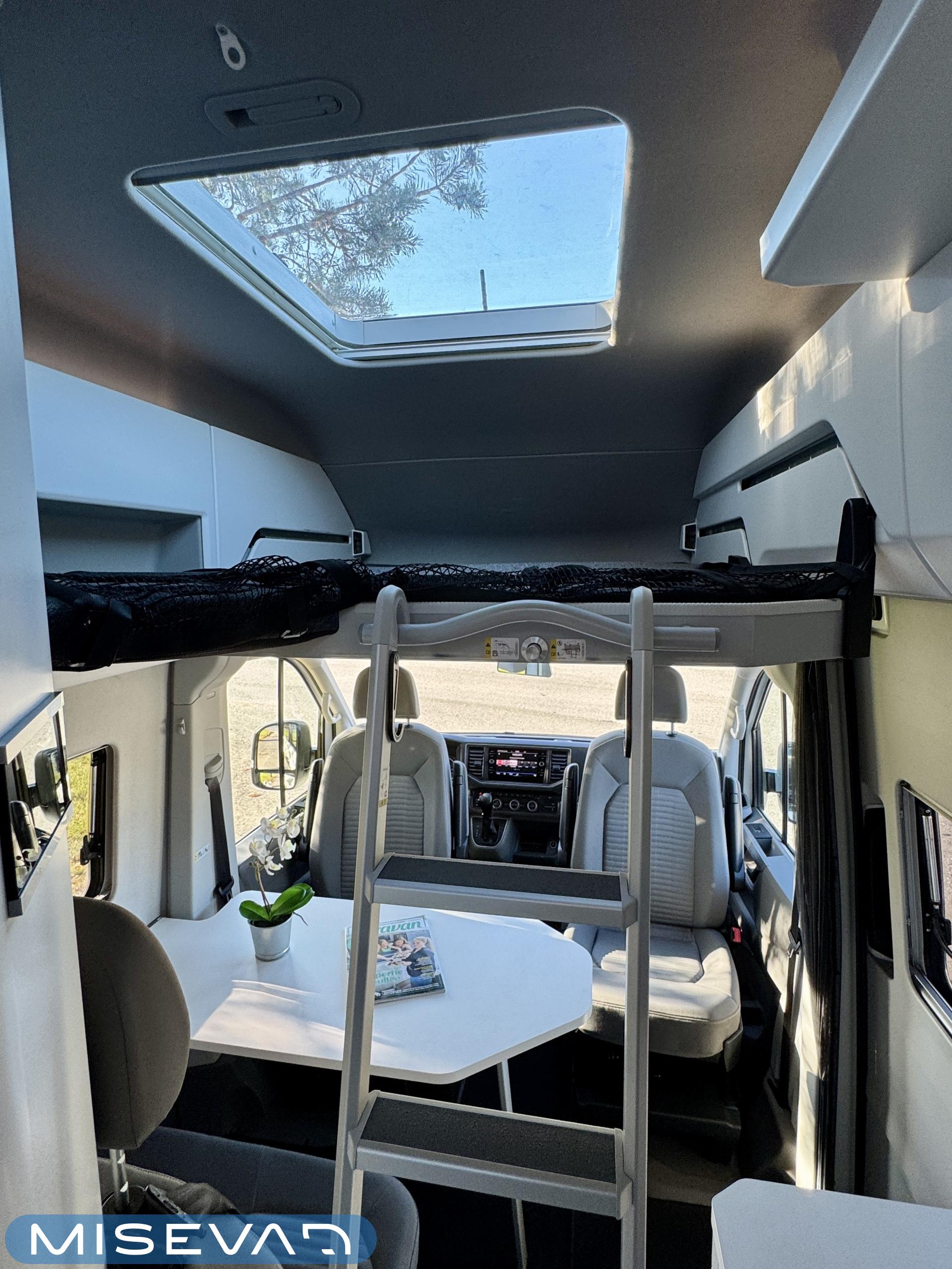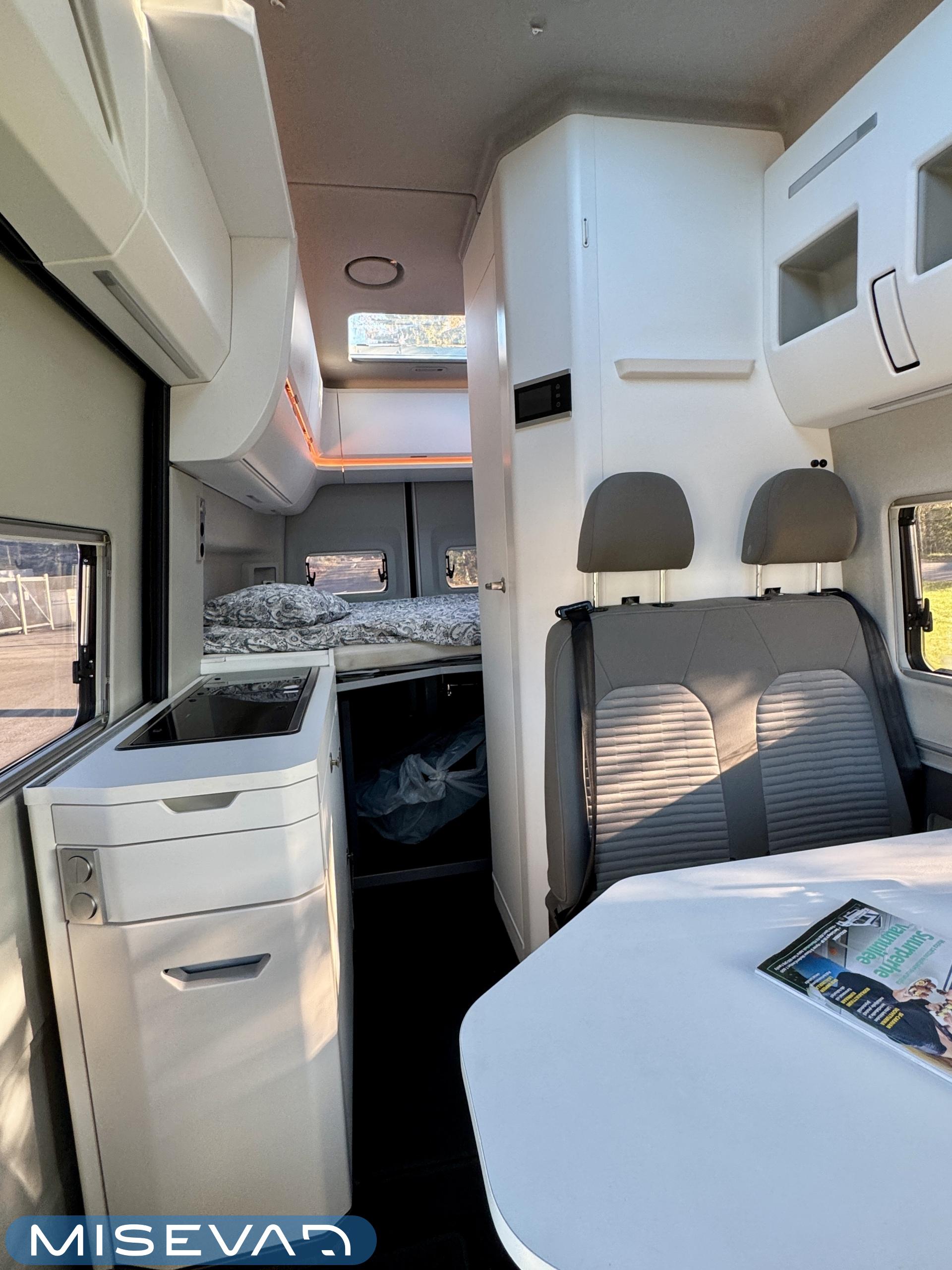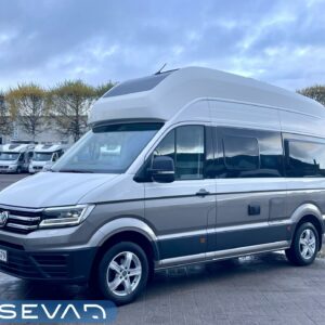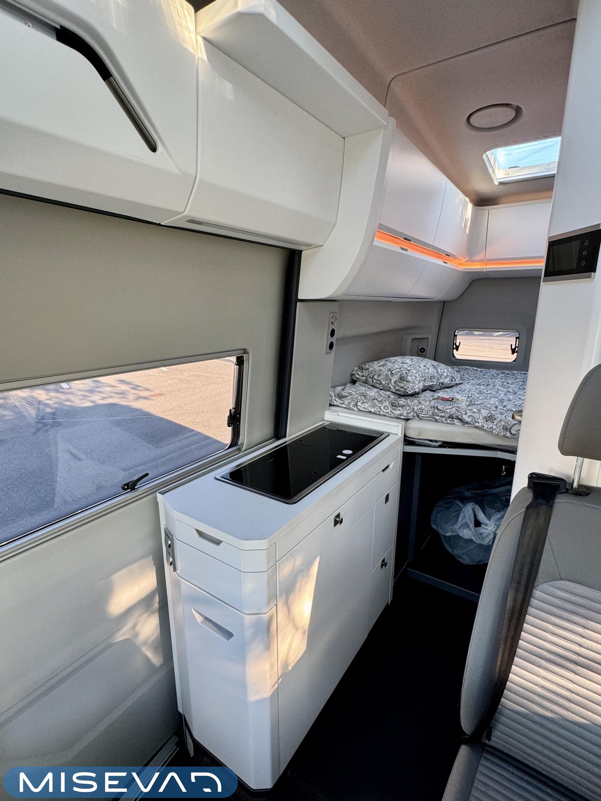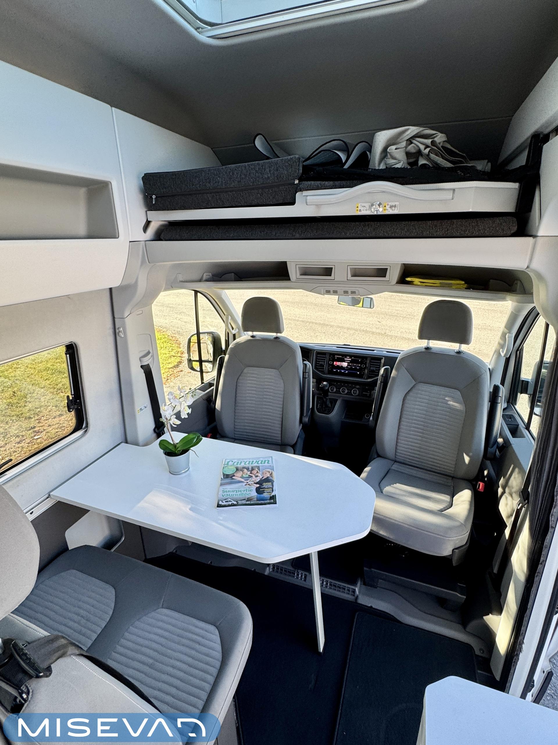 Ajomukavuus ja tyylikkyys on huipussaan tässä Crafterin alustalle tehdyssä Grand Californiassa. Kyseisessä mallissa on vielä aavistuksen harvinaisempi diesel-lämmitin. Eli talvireissaamiseen erityisen suosittu vaihtoehto. Makuupaikat löytyy neljälle, takana parisänky ja ohjaamon yläpuolella on tilaa kahdelle lisää. Keittiö on toteutettu samanlaisella minimalistisella tyylikkyydellä kuin muukin auto. Asuintilaa suunnitellessa on mietitty myös paljon sen toiminnallisuutta, jääkaappi on esimerkiksi suoraan oven vieressä, fiksusti pois asuintilaa viemästä. Kaupassa käynnit on helppo toteuttaa tämän ratkaisun kanssa. Ostoskärrystä saa ladattua suoraan ruoat kaappiin. Grand California on retkeilyautoista tyylikkäimmästä päästä ja jos ajomukavuus on sinulle tärkeä kriteeri, niin tämä kannattaa tulla koeajamaan. Tule Misevalle tutustumaan ja ihastumaan tähänkin upeaan retkeilyautoon!