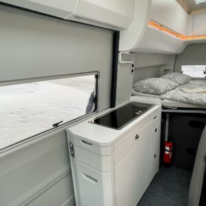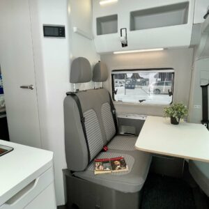 Takana poikittainen parivuode minkä alapuolella mukavasti säilytystilaa. Keskellä WC/kylpyhuonetilat sekä keittiö. Edessä pöytäryhmä minne yhdistyvät kääntyvät ohjaamon penkit. Pöytäryhmän yläpuolella camber ylävuode kahdelle henkilölle.