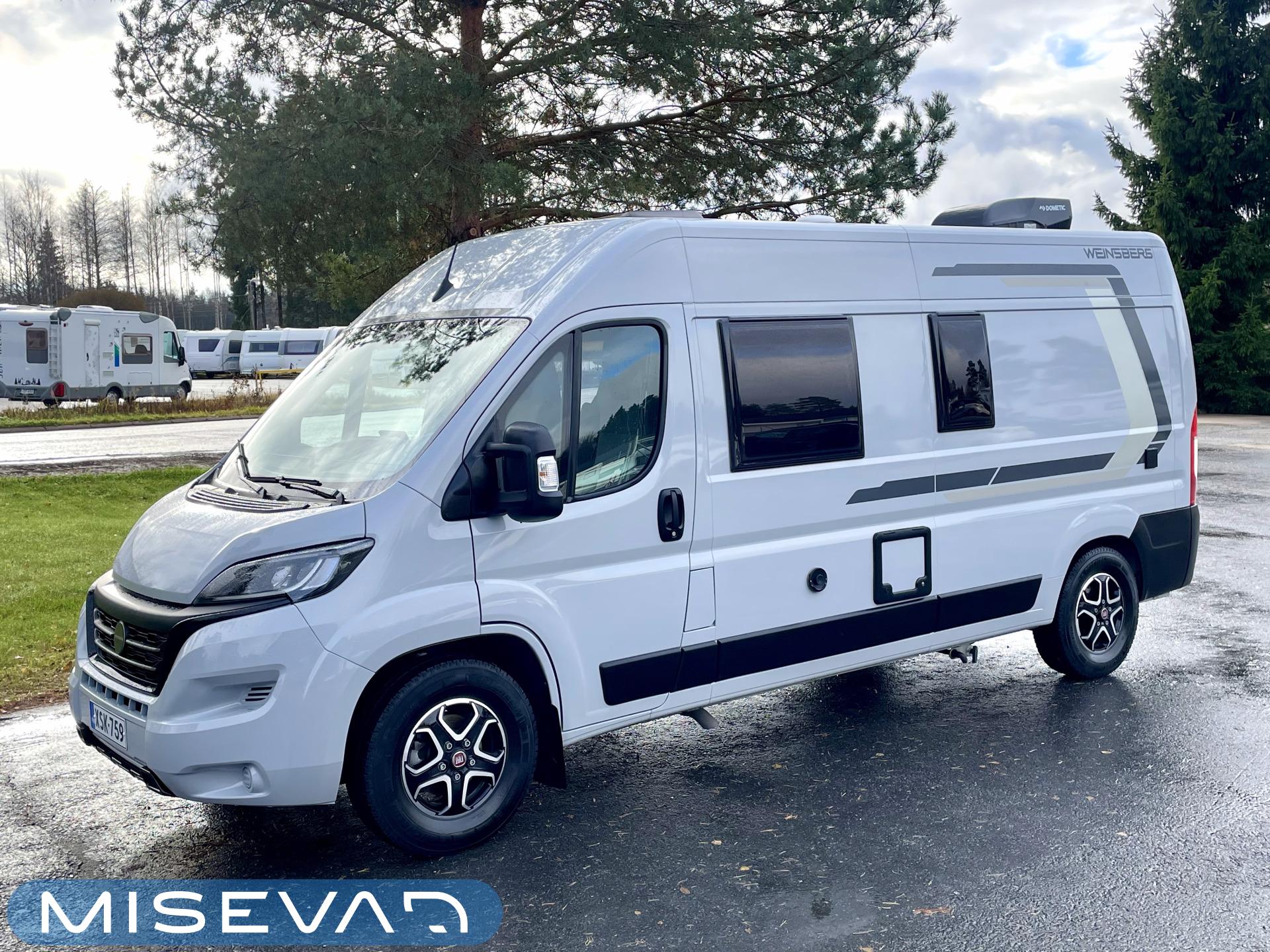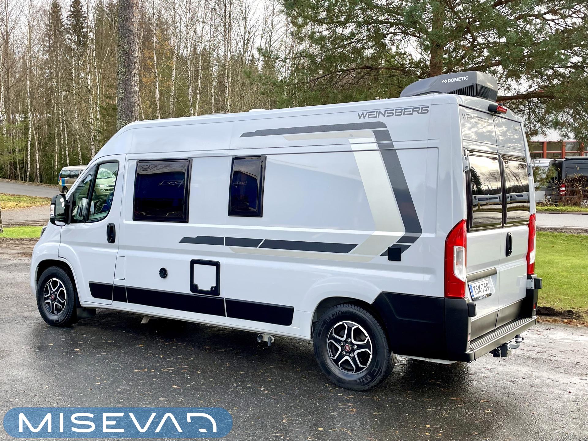 Weinsbergin retkis miellyttää silmää niin ulkoa, kuin sisältäkin. Tyylikkään harmaan eri sävyillä on saatu sisätilaan luotua hillittyä rauhallisuutta. Pinnat on upeassa kunnossa ja auto on juuri sisään ajettu kilometrien osalta. Tähän kuusi metriseen retkikseen on saatu mahtumaan pitkittäisvuoteet taakse. Samassa kokoluokassa harvinaisempi herkku. Toinen herkku on tupla ilmastointi, se löytyy sekä ohjaamosta, että asuinosasta. Ja jos kokkaaminen on lähellä sydäntäsi, niin tässä retkiksessä keittiön kokoon ja toiminnallisuuteen on panostettu. Yläkaappi on iso, vaikkapa kuivamuonan säilytykseen ja vetolaatikostoihin mahtuu kipot, kupit, harukat ja veitset. Sekä kompaktiin jääkaappiin tarvittavat ruoka-ainekset. Laskutilaa on mukavasti lisäpöydän ansiosta. Ruokapöydästä saa väliaikaisen sängyn ja pienen kokonsa ansiosta se ei vie liikaa tilaa ruokapöytänä. Etupenkit on tottakai kääntyvää sorttia. Potkua Fiatissa riittää ja tämä auto odottaakin vain seuraavia, suuria seikkailuita. Tule tutustumaan ja koeajolle, tällä on mukavia kilometrejä vielä runsaasti edessä.
