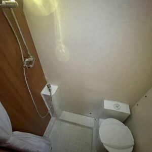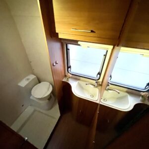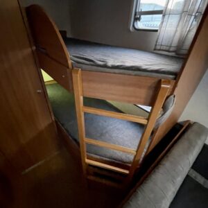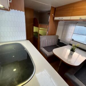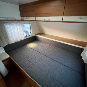Tämä vaunu tarjoaa loistavan pohjaratkaisun koko perheelle. Etuosassa mukava poikittainen parivuode ja takana lapsille käytännöllinen kerrossänky. Takaosassa erillinen WC- ja suihkutila tuo arkeen ja reissuun helppoutta.