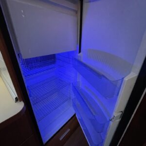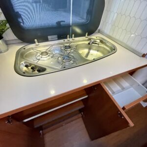 Vaunun keskellä on toimiva keittiö ja vastakkain istuttava ruokailuryhmä, josta saa tarvittaessa lisävuoteen vieraalle. Keittiöstä löytyy iso jääkaappi reilulla pakastelokerolla, liesi sekä pesuallas kaikki mitä matkalla tarvitset.