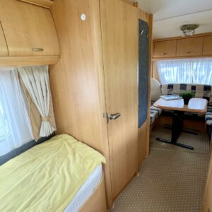 Erillisvuoteet, Jääkaappi, Kasetti WC, Kasettiverhot, Kattoluukku, Lattiamatot asunto-osassa, Liesi, Lämminvesiboileri, Markiisi, Pakastelokero, Pesuallas, Sähköpatruuna, Trumatic, Tukijalat, Kesärenkaat, kwh-mittari, Asuinosan hyttysovi/verho