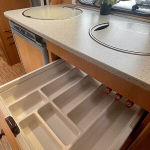 Truma, Sähköpatruuna, Asuinosan hyttysovi/verho, ohjaamon kasettiverhot, Polkupyöräteline, Ilmastointi ajotilassa, Jääkaappi, Kasetti WC, Kasettiverhot, Kattoluukku, Liesi, Markiisi, Pakastelokero, Parivuode, Pesuallas, Pyöräteline, Suihku, Sähkörappu, ABS-jarrut, televisioteline, televisio, Keskuslämmitys, Lämminvesiboileri, Ohjaustehostin, Pysäköintikamera, Radio, Sähkökäyttöiset ikkunat, Sähköpeilit, Turbo, Vakionopeudensäädin