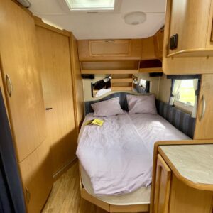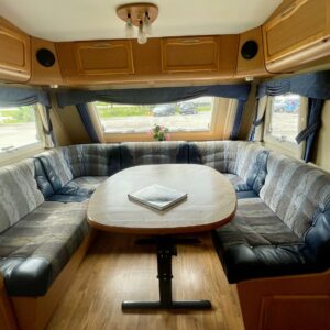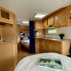 Alde, Jääkaappi, Kasetti WC, Kasettiverhot, Kattoluukku, Nestekiertolämmitys, Pakastelokero, Parivuode, Pesuallas, Radio, Sähköpatruuna, Tukijalat, TV-antenni tai lautasantenni