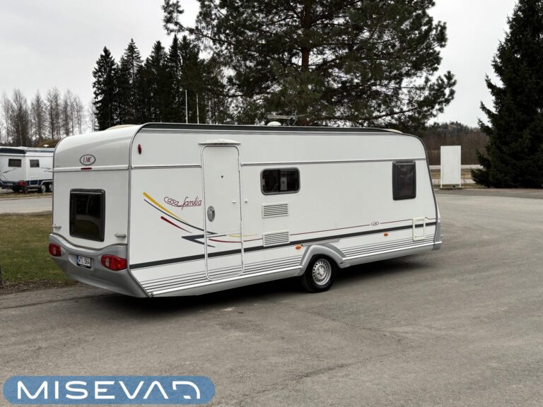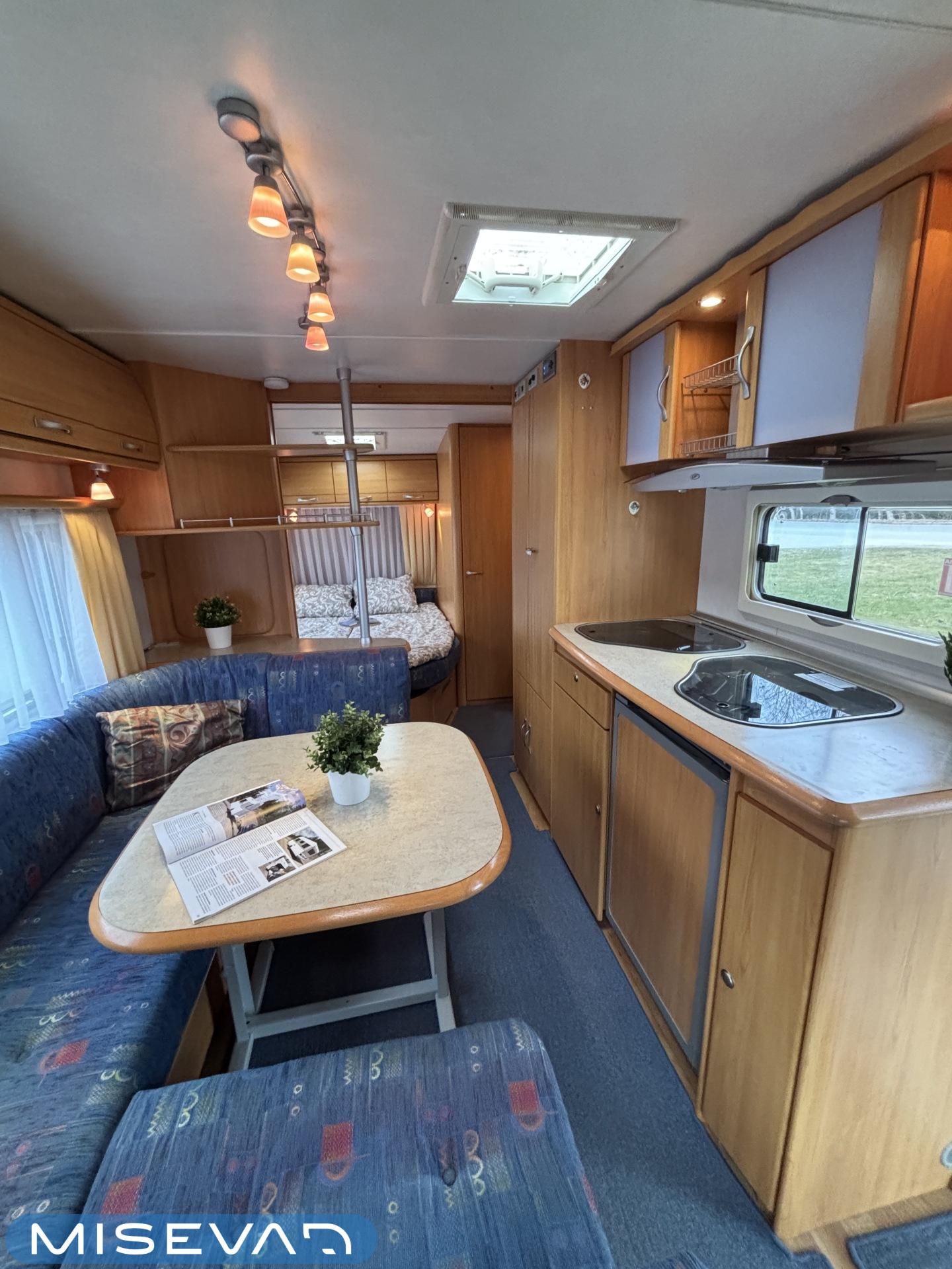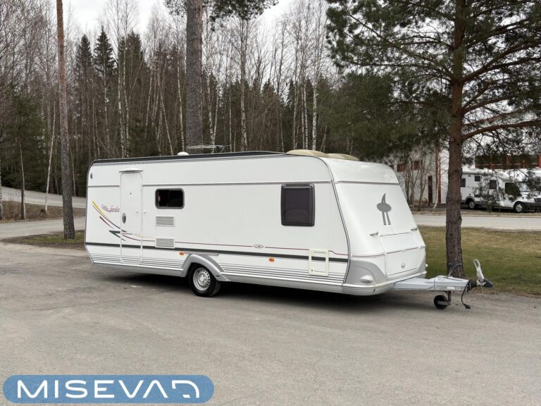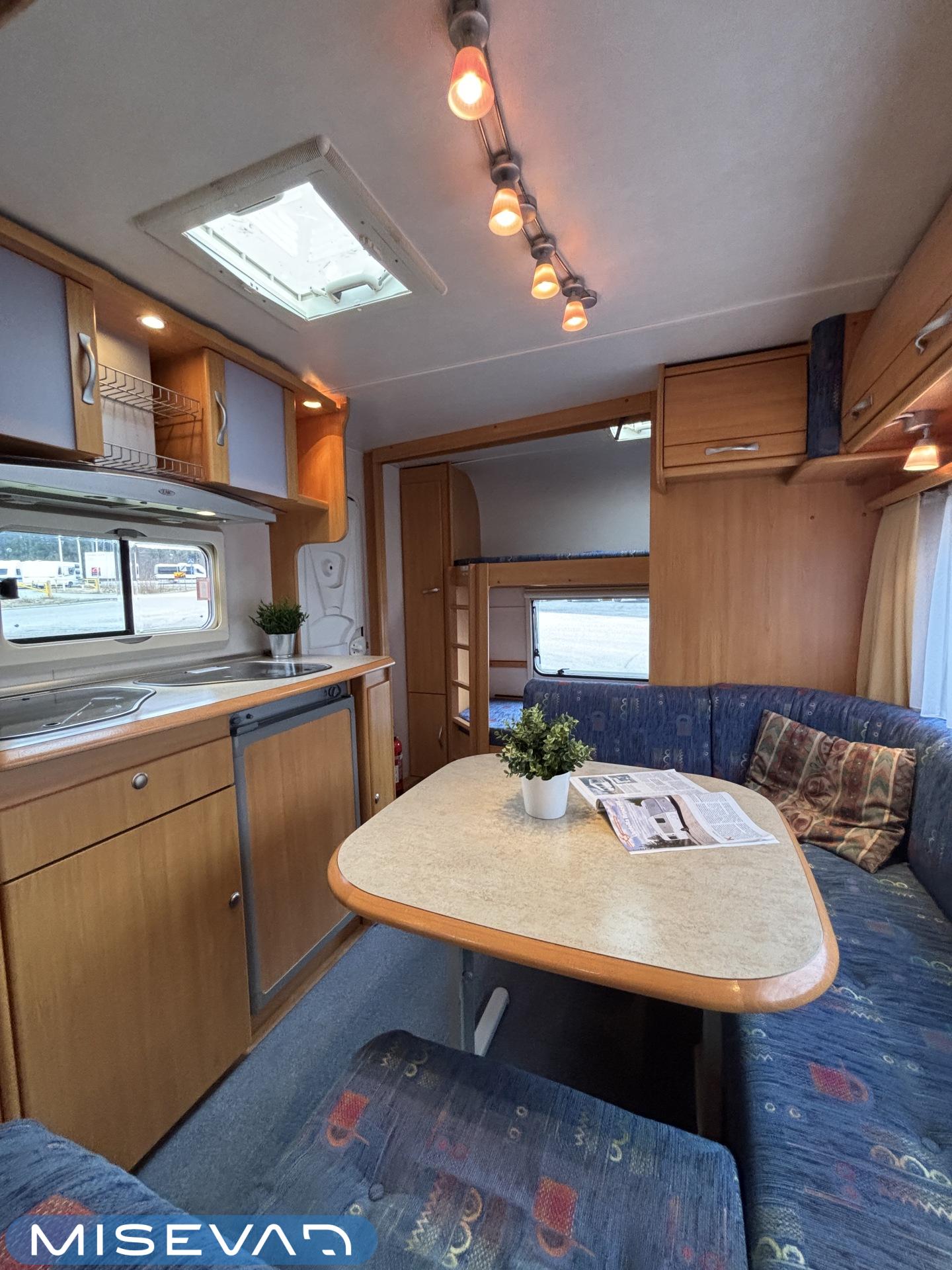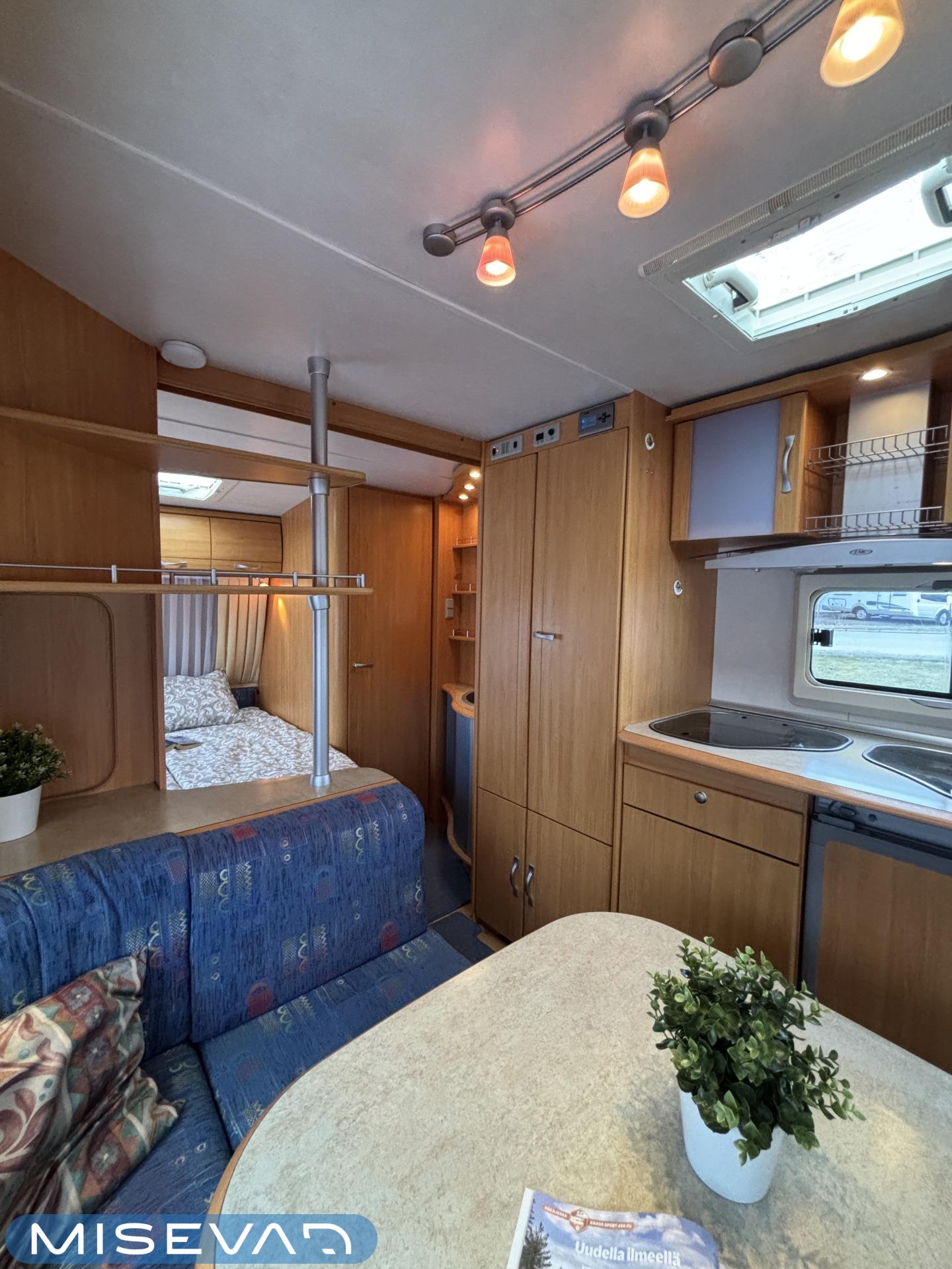 Jääkaappi, Kasetti WC, Kasettiverhot, Kattoluukku, Liesi, Lämminvesiboileri, Pakastelokero, Parivuode, Pesuallas, Sähköpatruuna, Trumatic, Tukijalat, Kesärenkaat, kwh-mittari, Asuinosan hyttysovi/verho, jenkkijääkaappi
