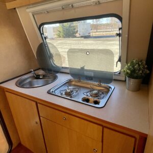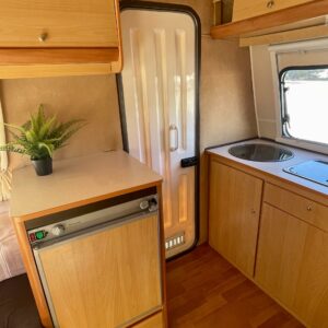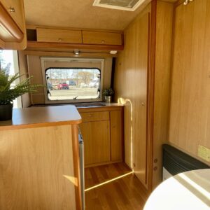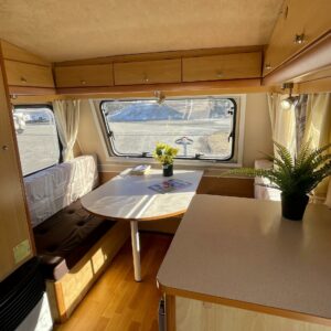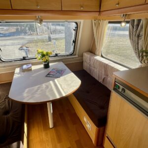 Lattialämmitys (sähkö), Jääkaappi, Kasetti WC, Kasettiverhot, Kattoluukku, Liesi, Pakastelokero, Parivuode, Pesuallas, Takakeittiö, Tukijalat