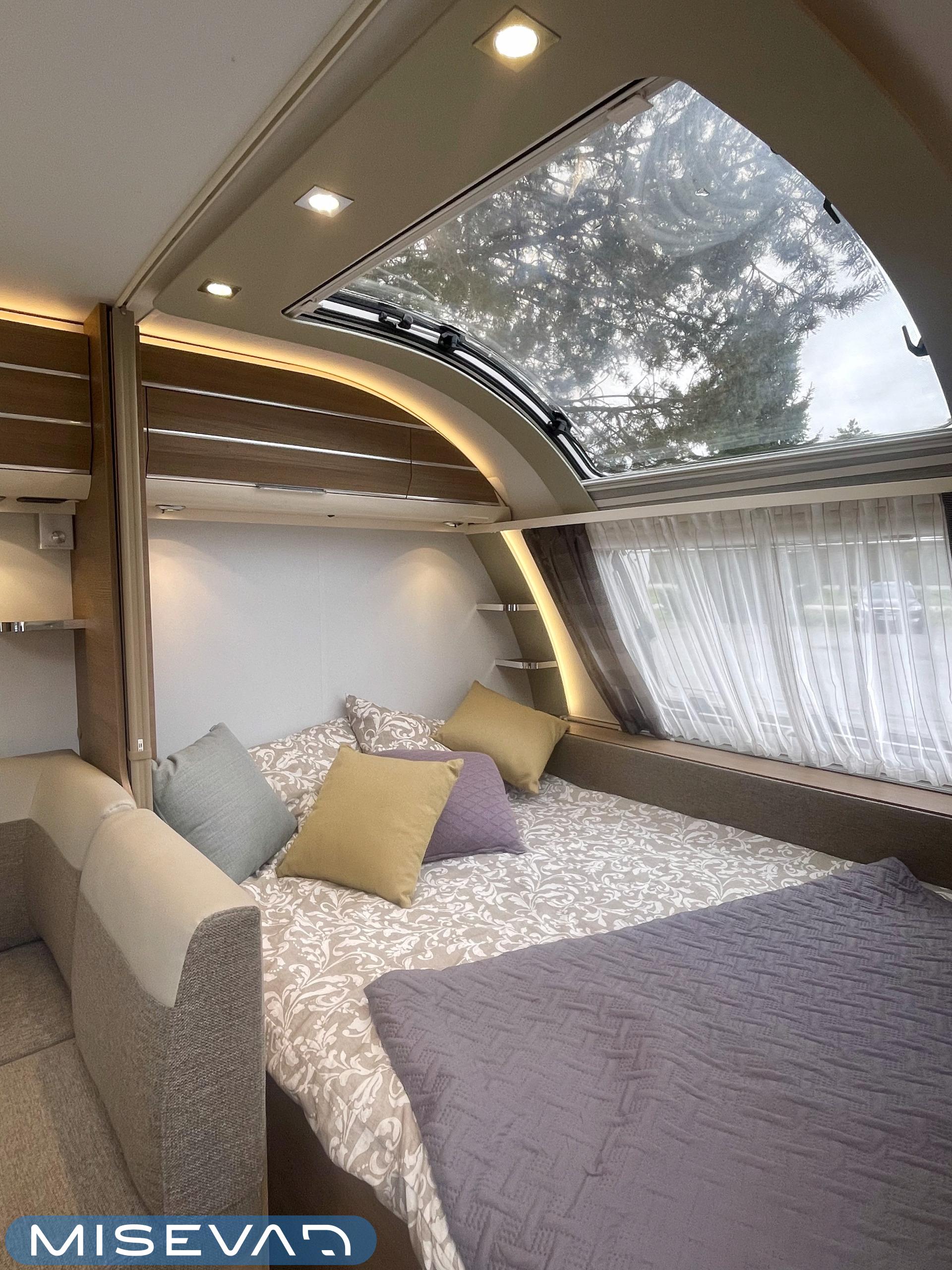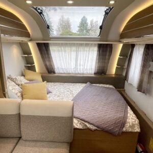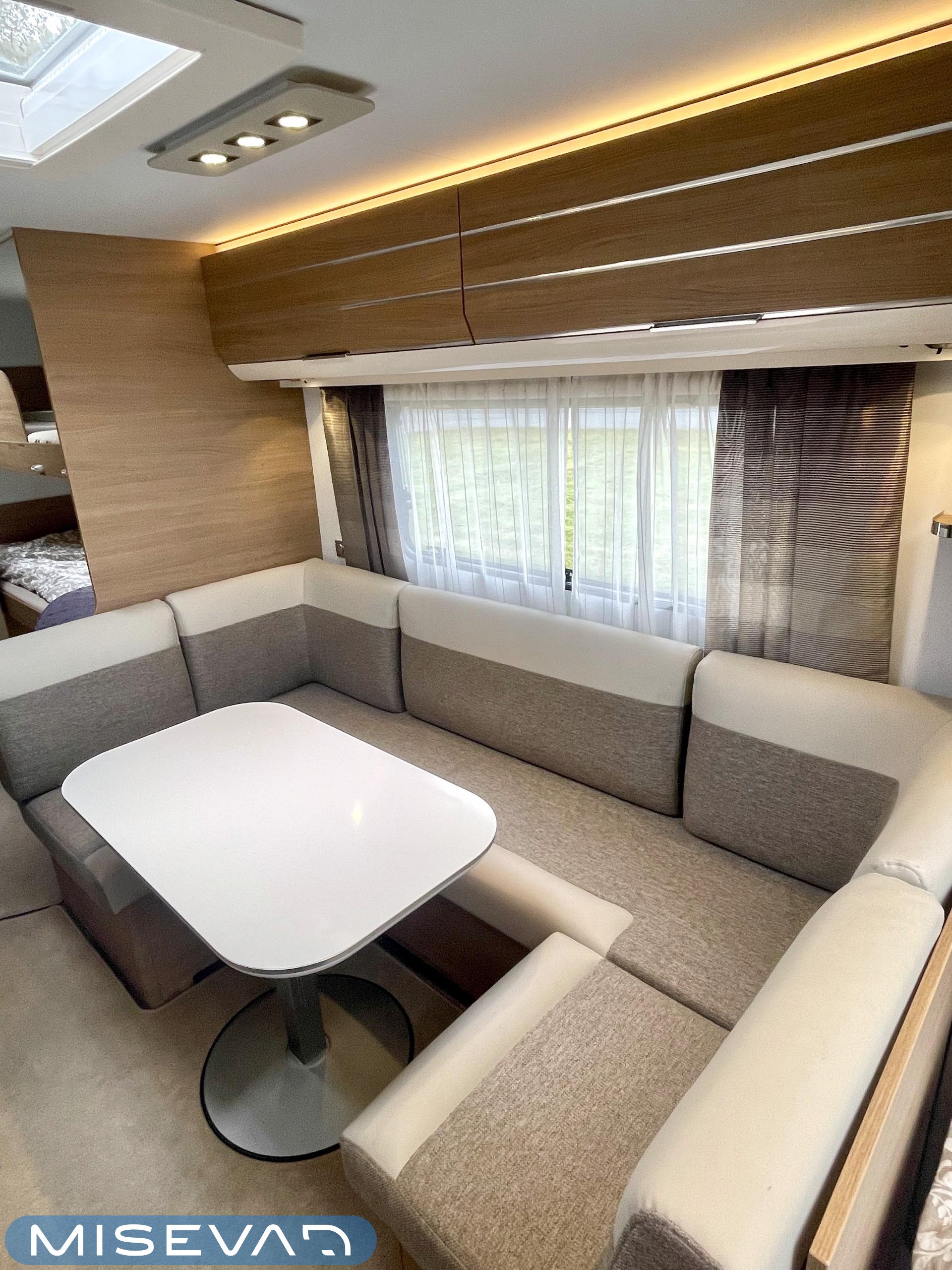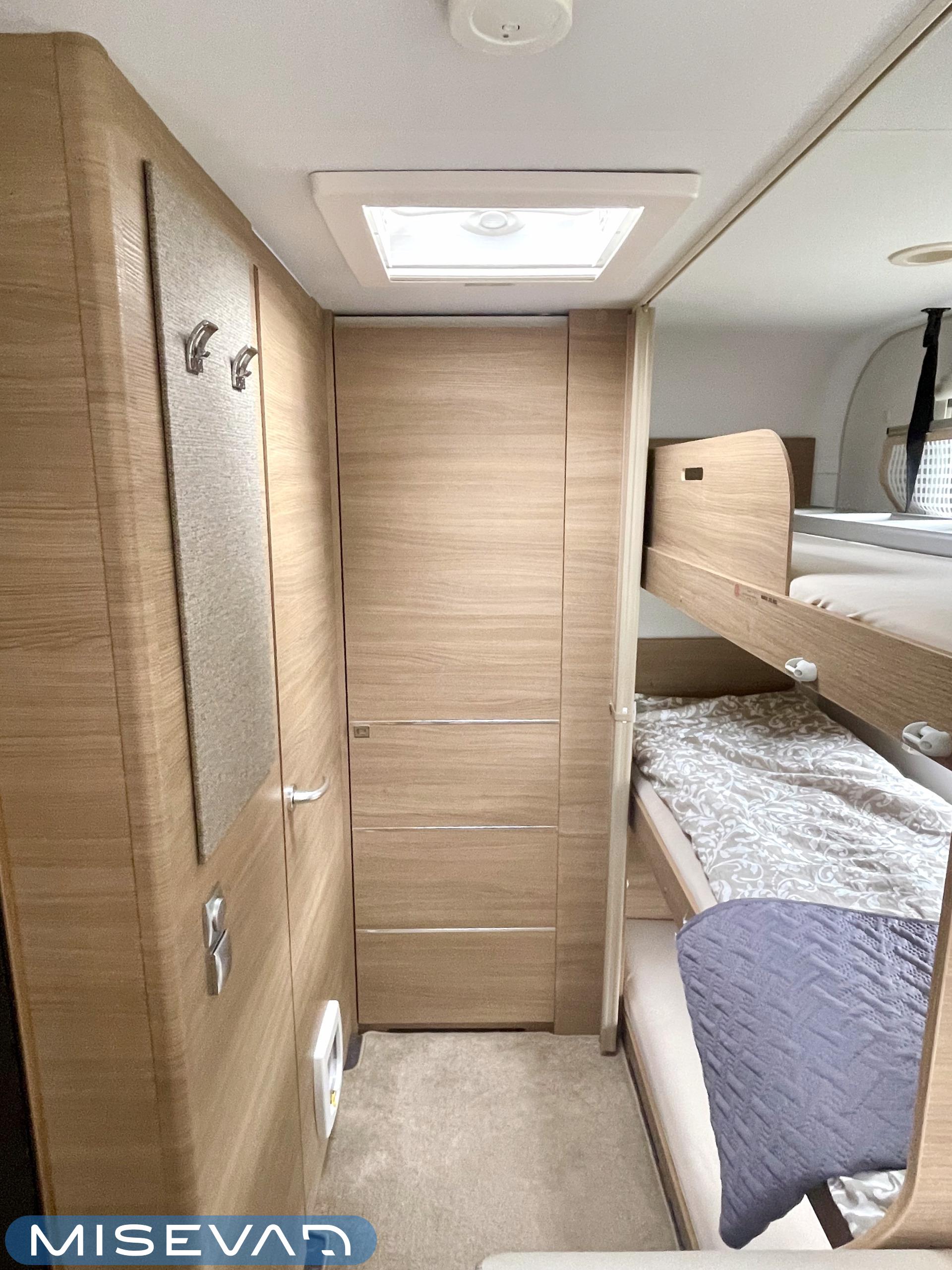 Alde, Electric heating cartridge, Floor heating, Lattialämmitys (sähkö), Fridge, Cassette blinds, Cassette WC, Roof hatch, Bunk bed, Bicycle rack, Stove, liesituuletin, Radio, Support legs