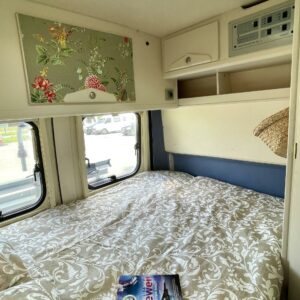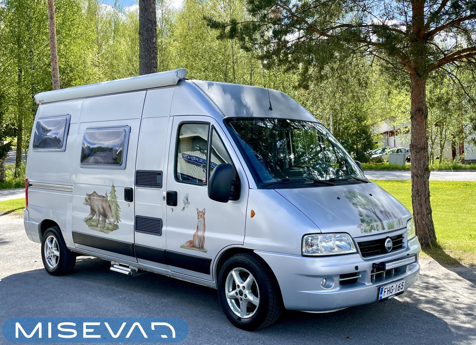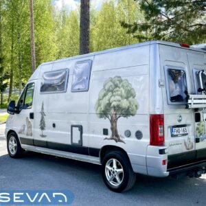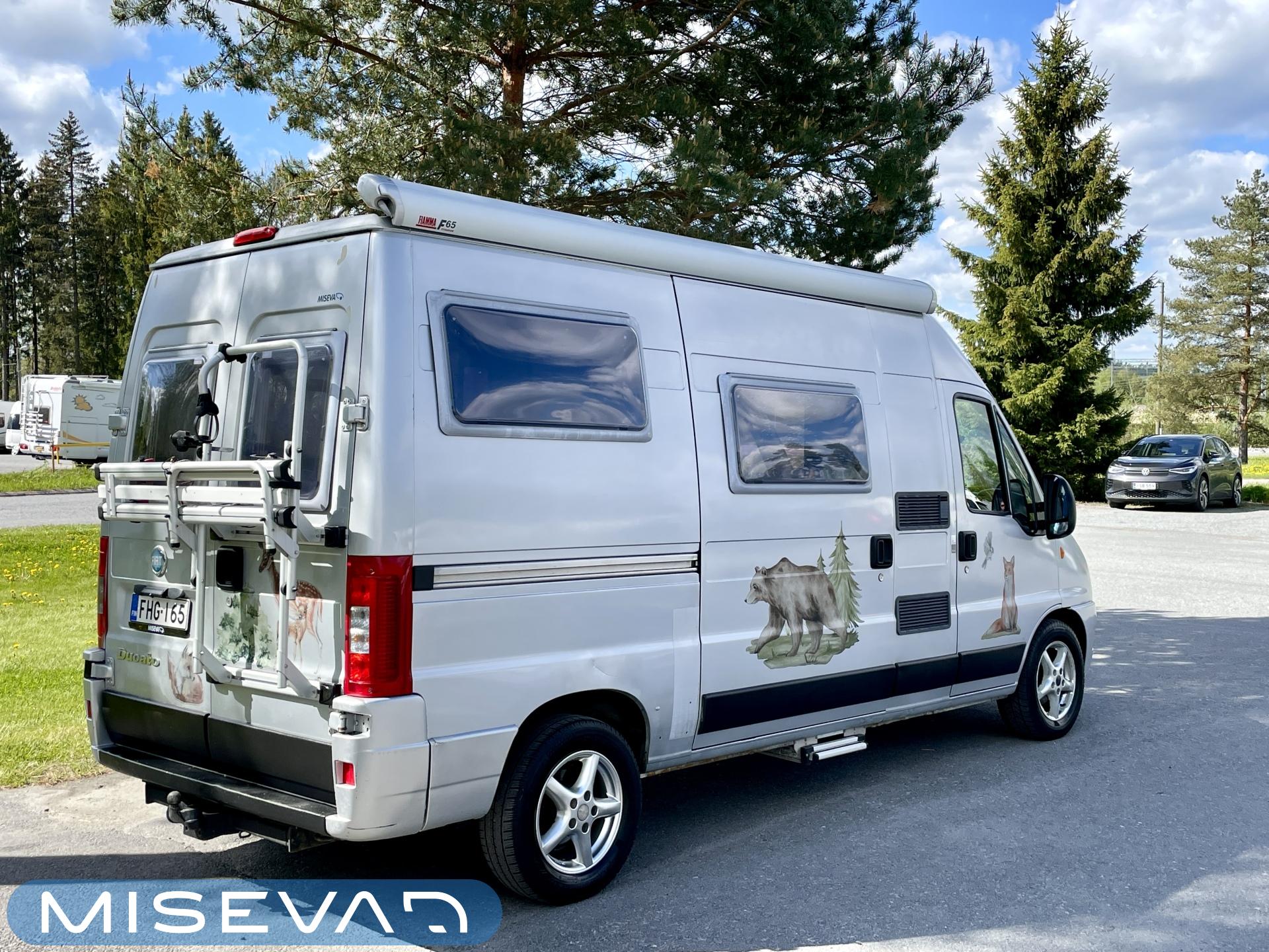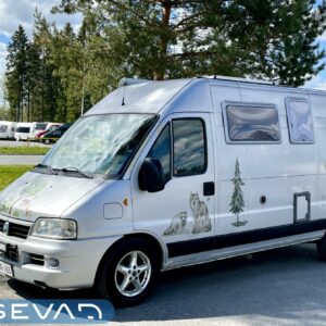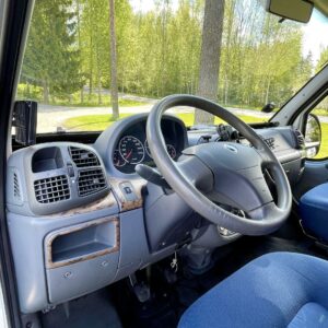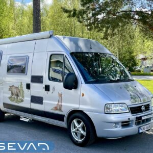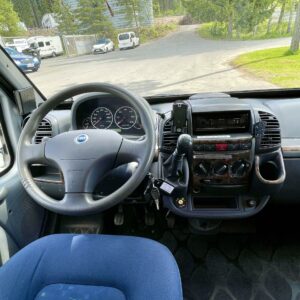 Towing hook, Bicycle rack, Sun shade, Engine heater, Solar panel, Trumatic, Service history, Cab air conditioning, Fridge, Two tyre sets, Cassette WC, Cassette blinds, Roof hatch, Stove, Electric steps, Hot water boiler, Radio, Lisävalo