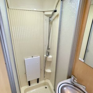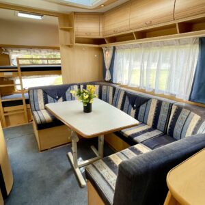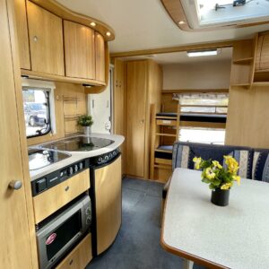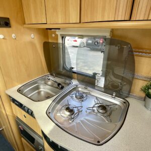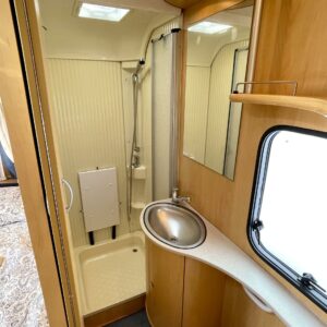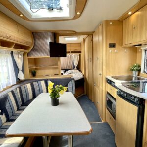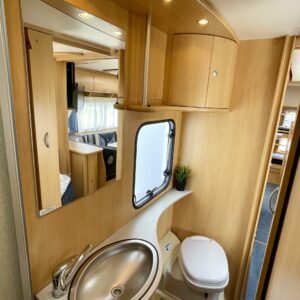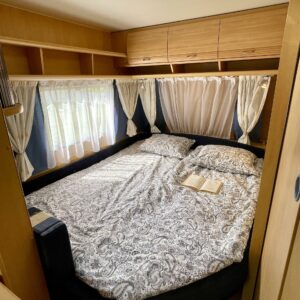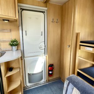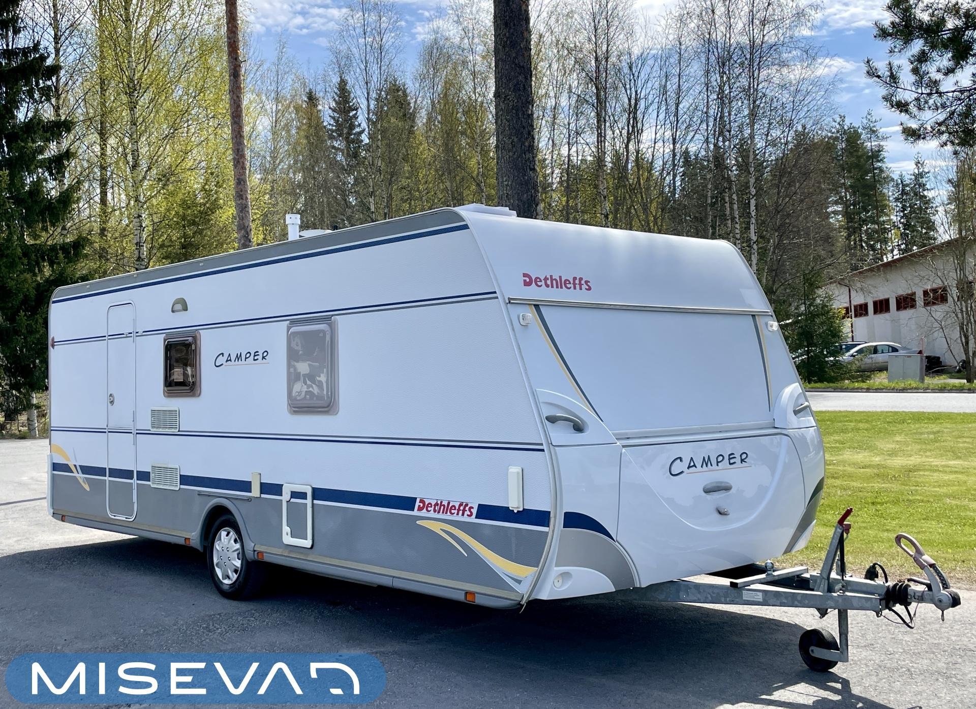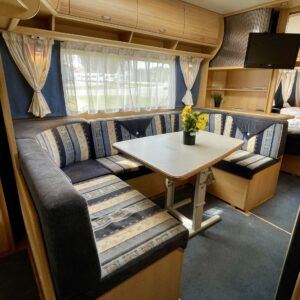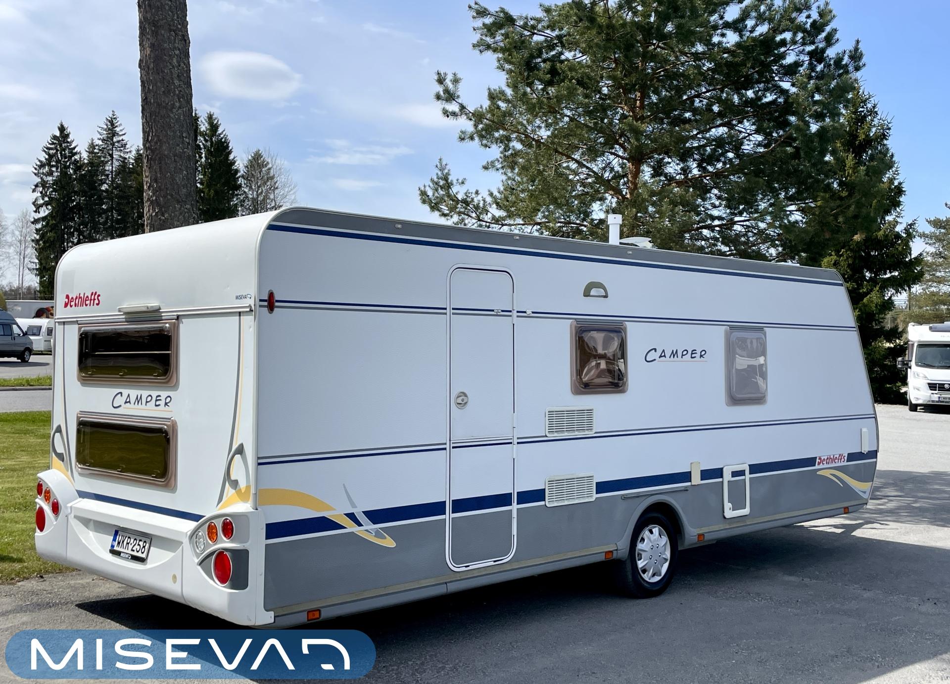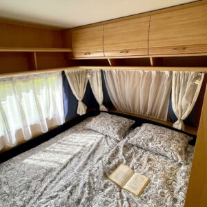 Alde, Electric heating cartridge, Lattialämmitys (sähkö), Support legs, Double bed, Sink, Stove, Fridge, Freezer compartment, Cassette WC, Cassette blinds
