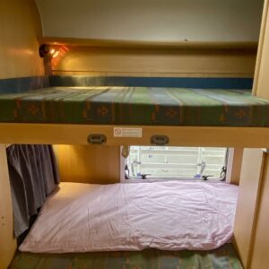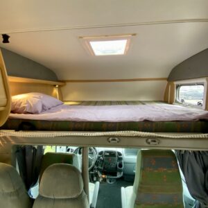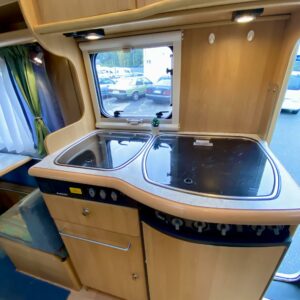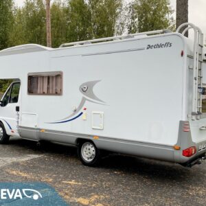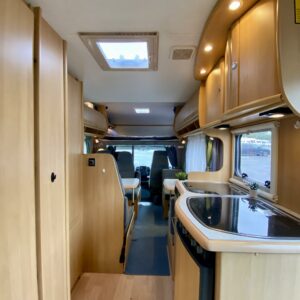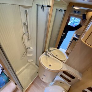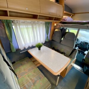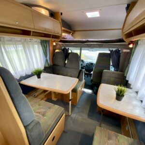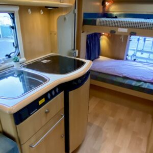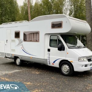 Fridge, Cassette WC, Cassette blinds, Bunk bed, Stove, Hot water boiler, Bicycle rack, Shower, Trumatic, Turbo, TV antenna/satellite dish, Towing hook, Player, Cab air conditioning, Roof railing/ladder, Roof hatch, Central heating, Power steering, Freezer compartment, Double bed, Sink, Pysäköintikamera, Radio, Electric steps, Truma, Webasto/Eber