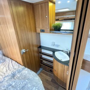 Alde, Fridge, Cassette WC, Cassette blinds, Roof hatch, Central heating, Floor heating, Passenger area carpets, Stove, Hot water boiler, Fluid circulation heating, Freezer compartment, Double bed, Sink, Stereo system, Shower, Electric heating cartridge, Support legs