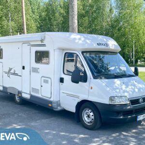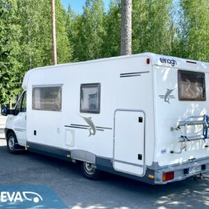Fridge, Cassette WC, Cassette blinds, Roof hatch, Central heating, Ignition interlock, Stove, Engine heater, Hot water boiler, Sun shade, Power steering, Freezer compartment, Double bed, Sink, Bicycle rack, Trumatic, Turbo