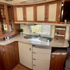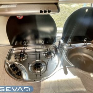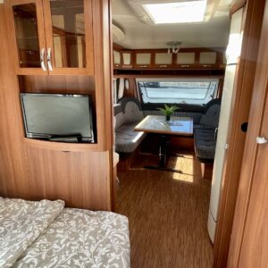 Alde, Sun shade, Bicycle rack, Support legs, Fridge, Cassette WC, Roof hatch, Electric heating cartridge, Fluid circulation heating, Floor heating, Double bed