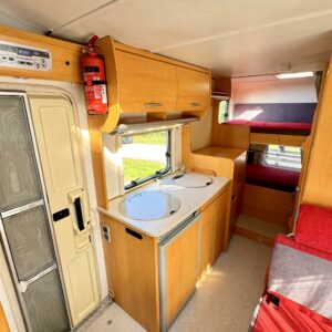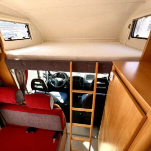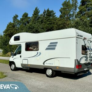 Cab air conditioning, Fridge, Two tyre sets, Cassette WC, Cassette blinds, Roof hatch, Bunk bed, Central heating, Ignition interlock, Passenger area carpets, Stove, Engine heater, Hot water boiler, Sun shade, Power steering, Freezer compartment, Double bed, Bicycle rack, Radio, Shower, Trumatic, Turbo
