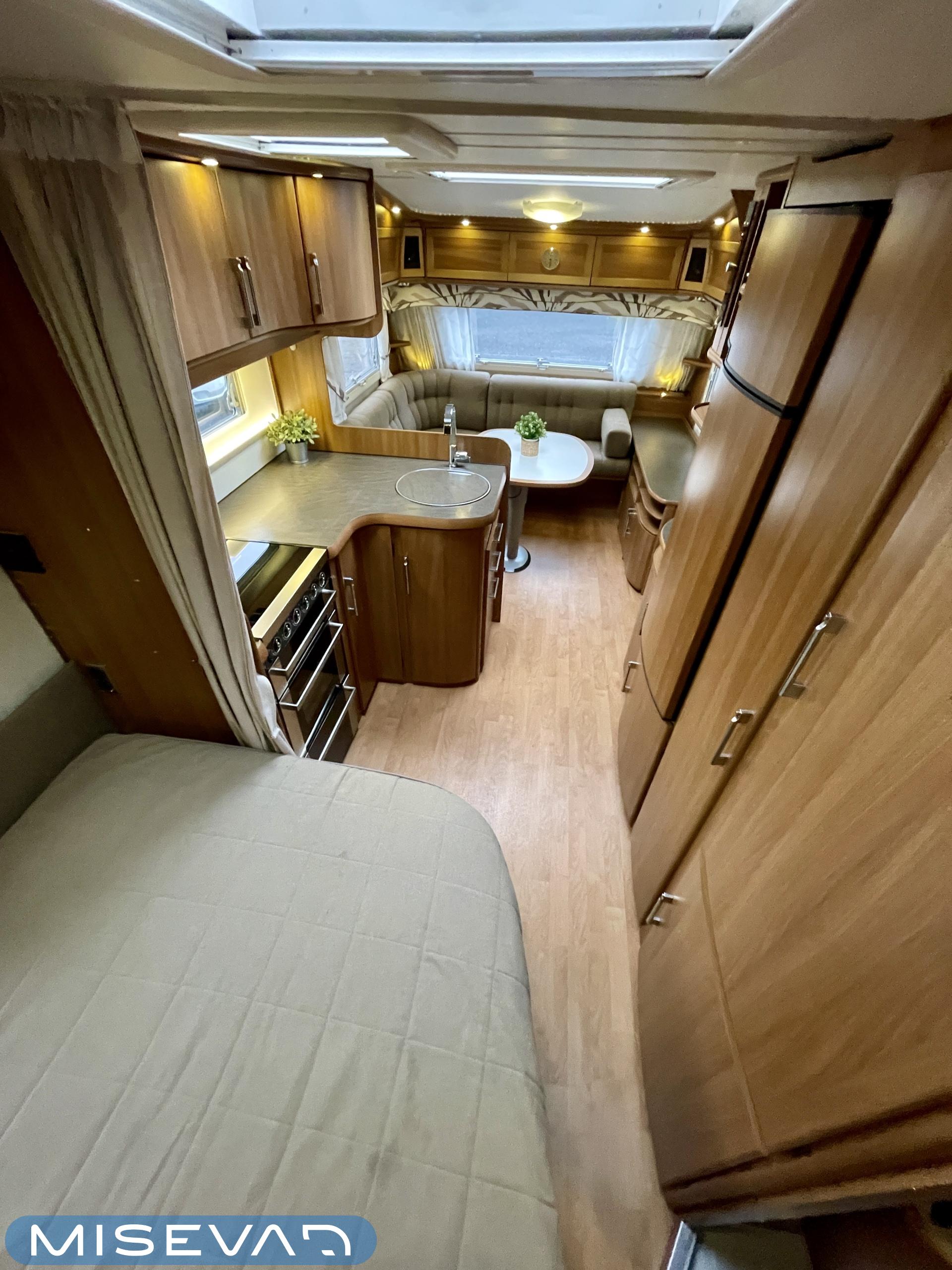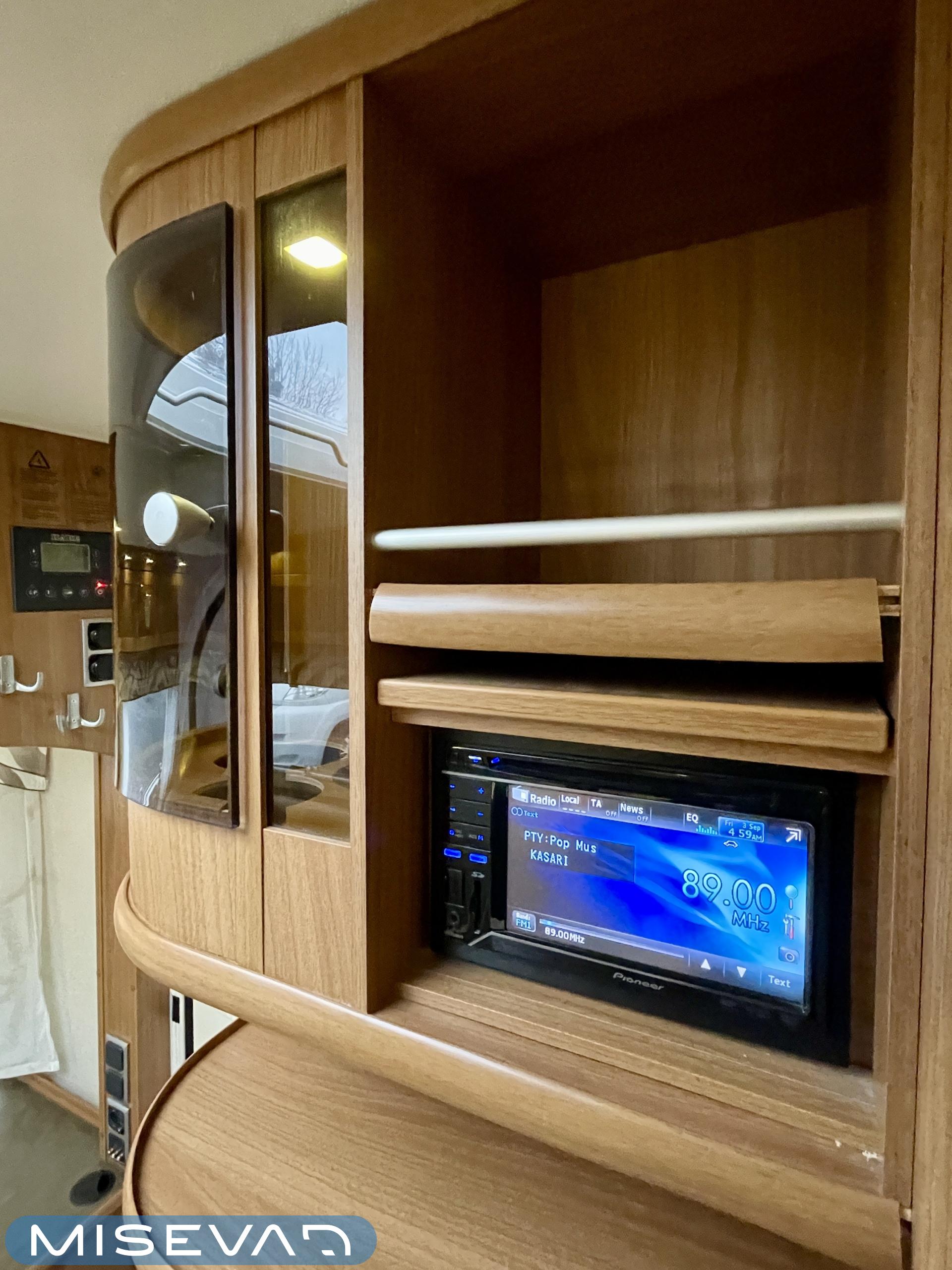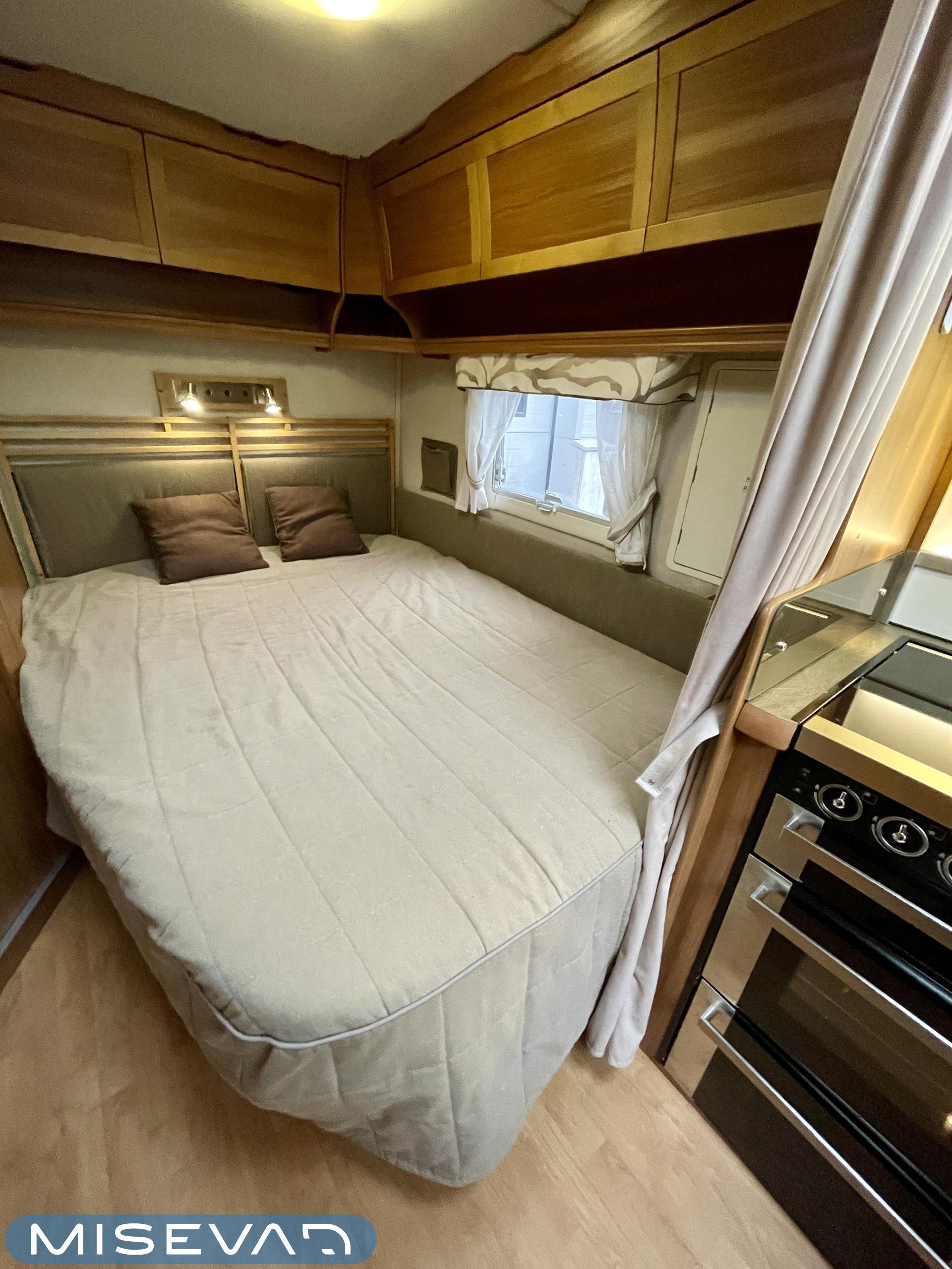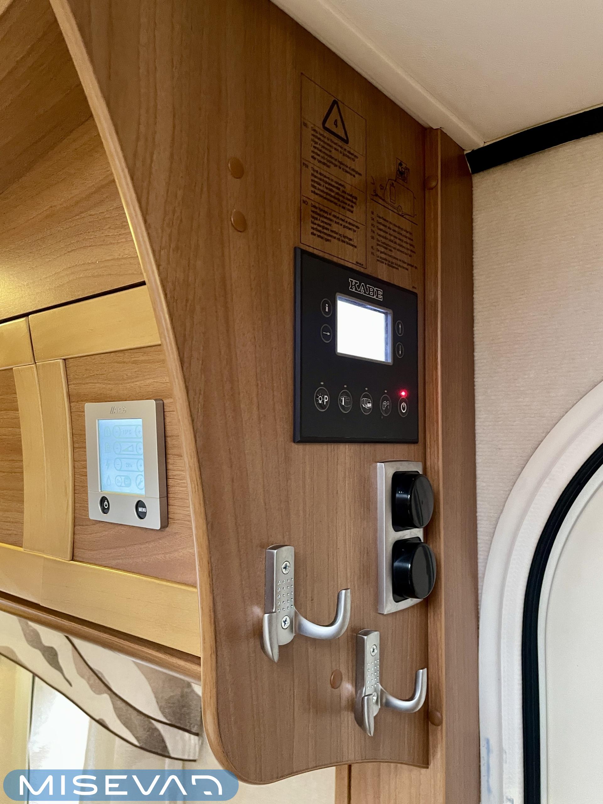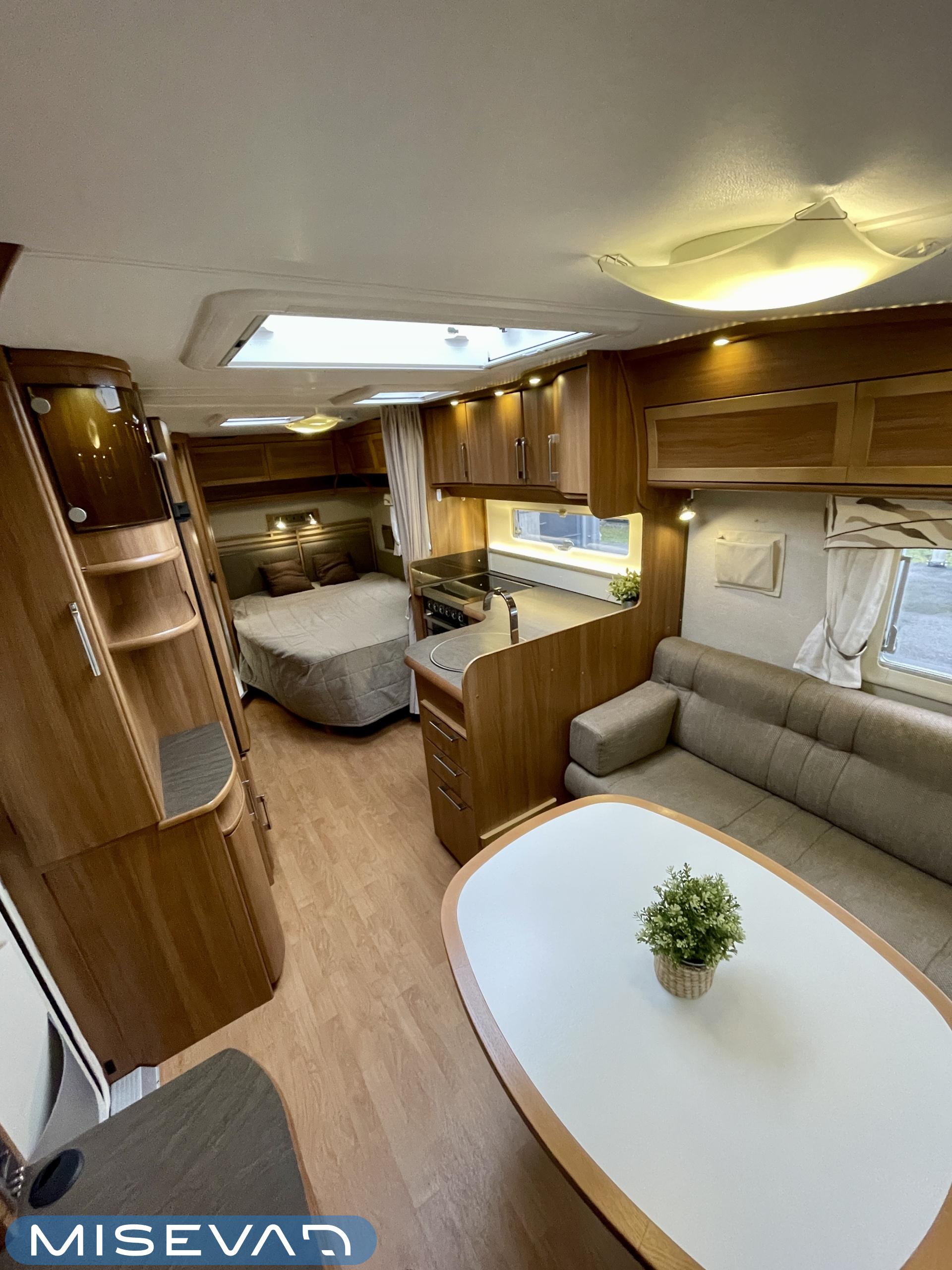 Alde, Insulated grey water tank, Cassette WC, Floor heating, Hot water boiler, Fluid circulation heating, Electric heating cartridge, TV-antenni tai lautasantenni, CD-soitin, Special wheels, Fridge, Cassette blinds, Roof hatch, Freezer compartment, Double bed, Radio