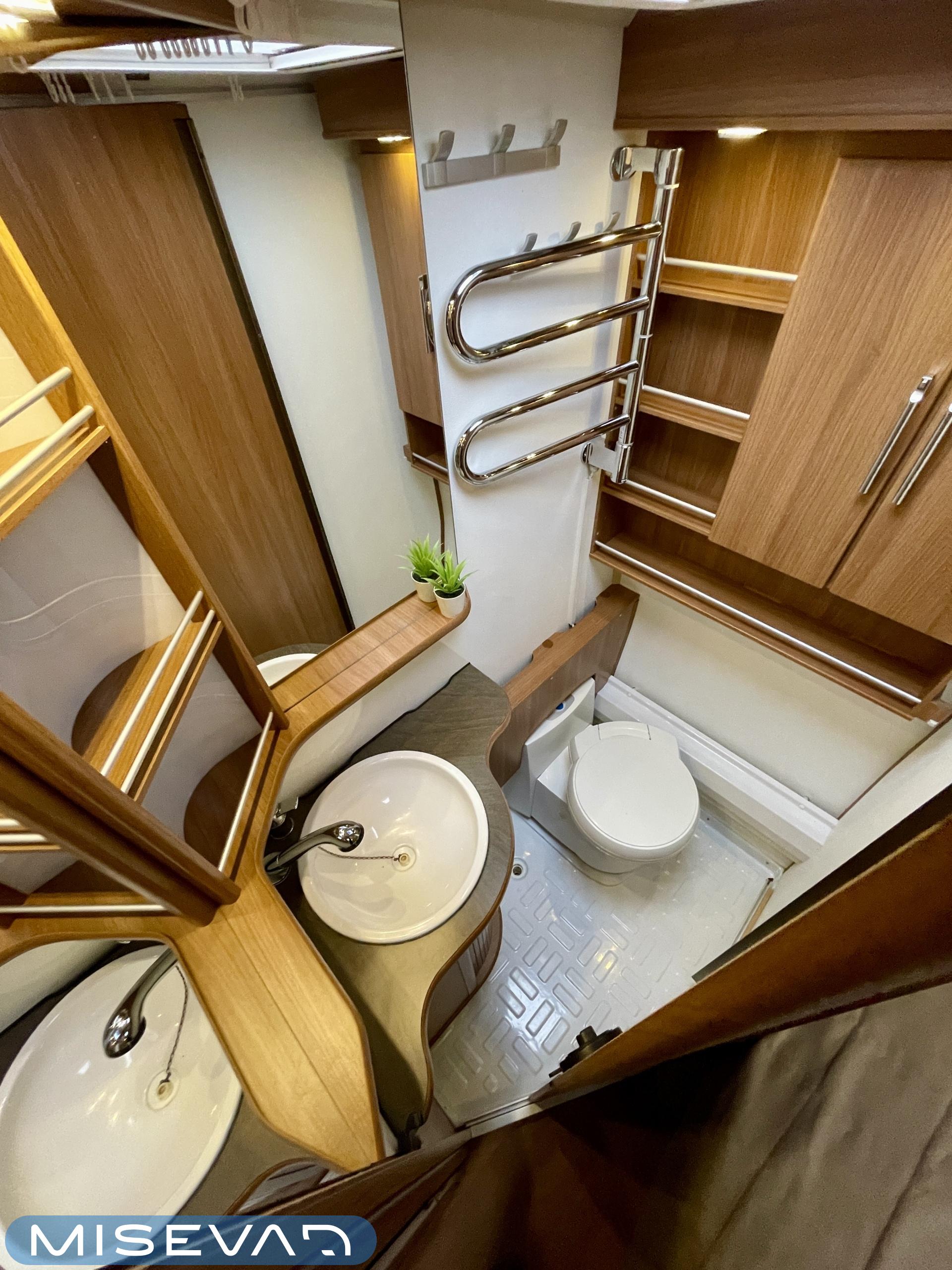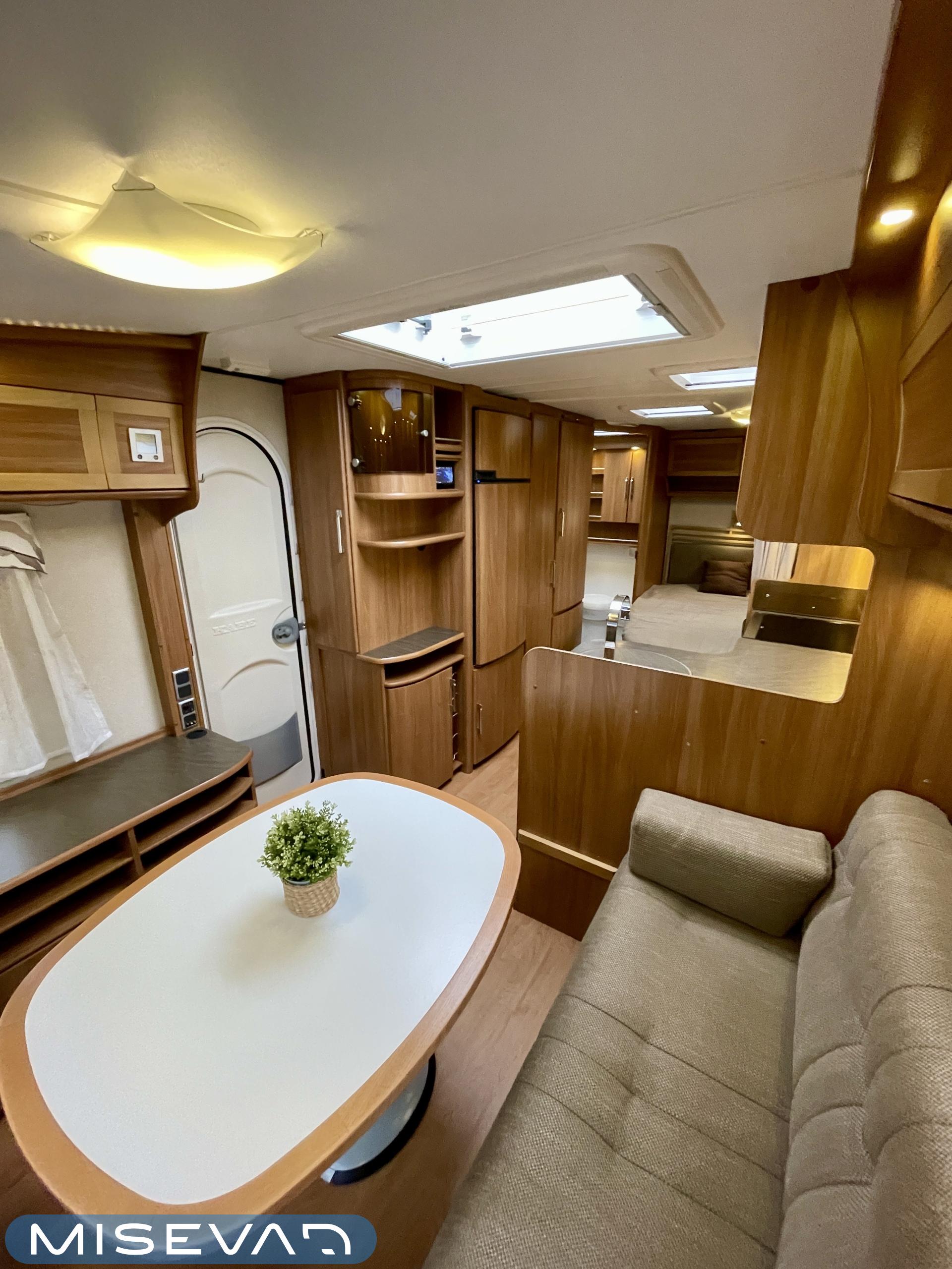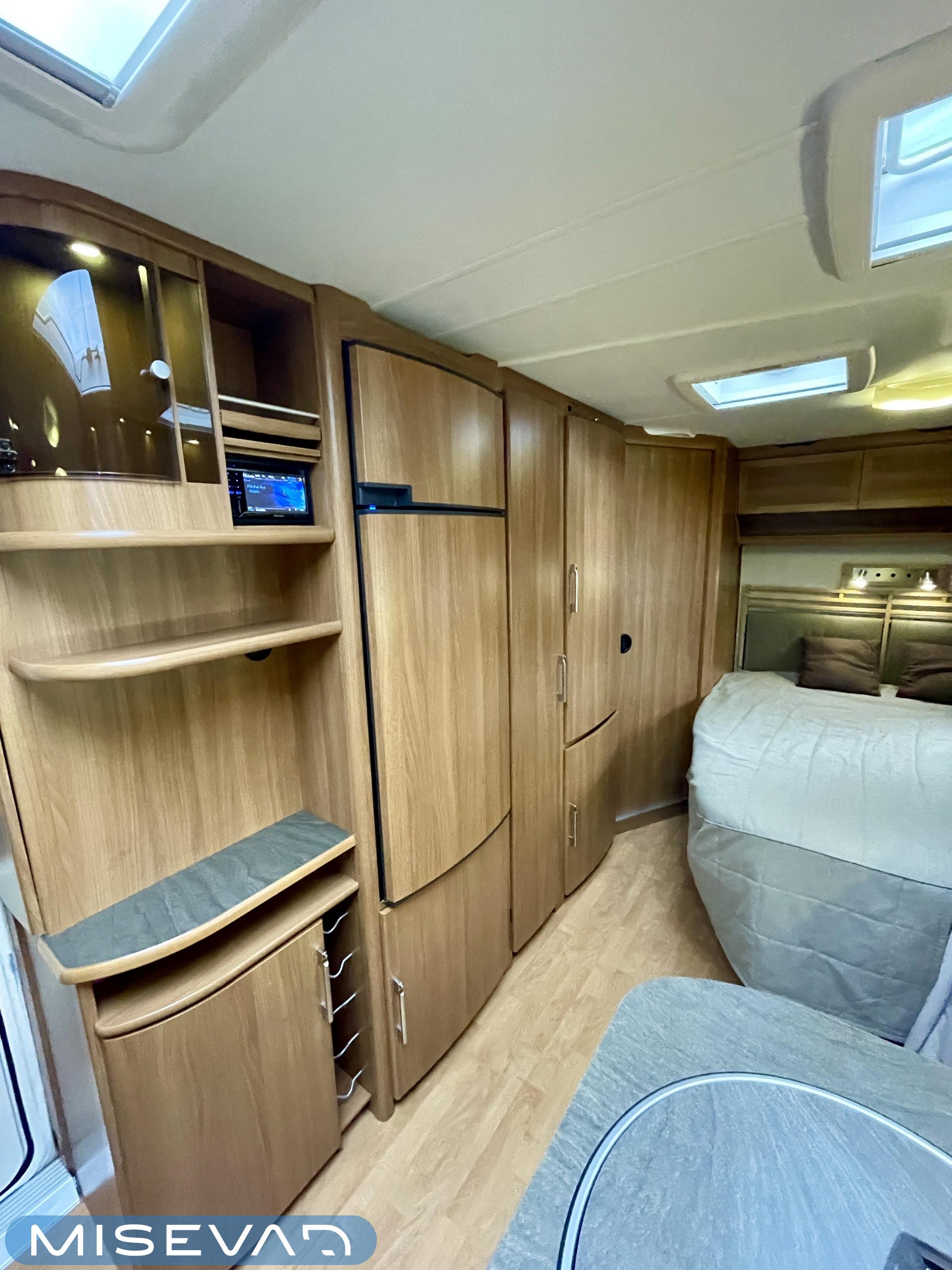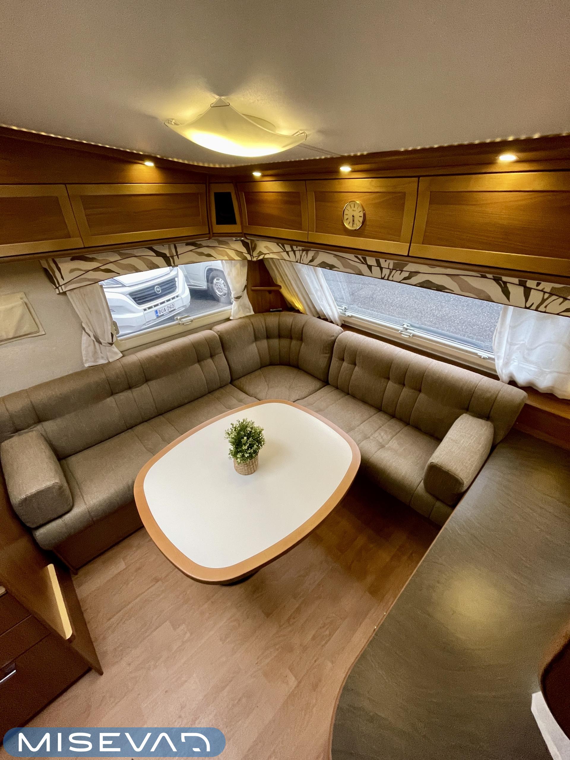 Alde, Insulated grey water tank, Cassette WC, Floor heating, Hot water boiler, Fluid circulation heating, Electric heating cartridge, TV-antenni tai lautasantenni, CD-soitin, Special wheels, Fridge, Cassette blinds, Roof hatch, Freezer compartment, Double bed, Radio