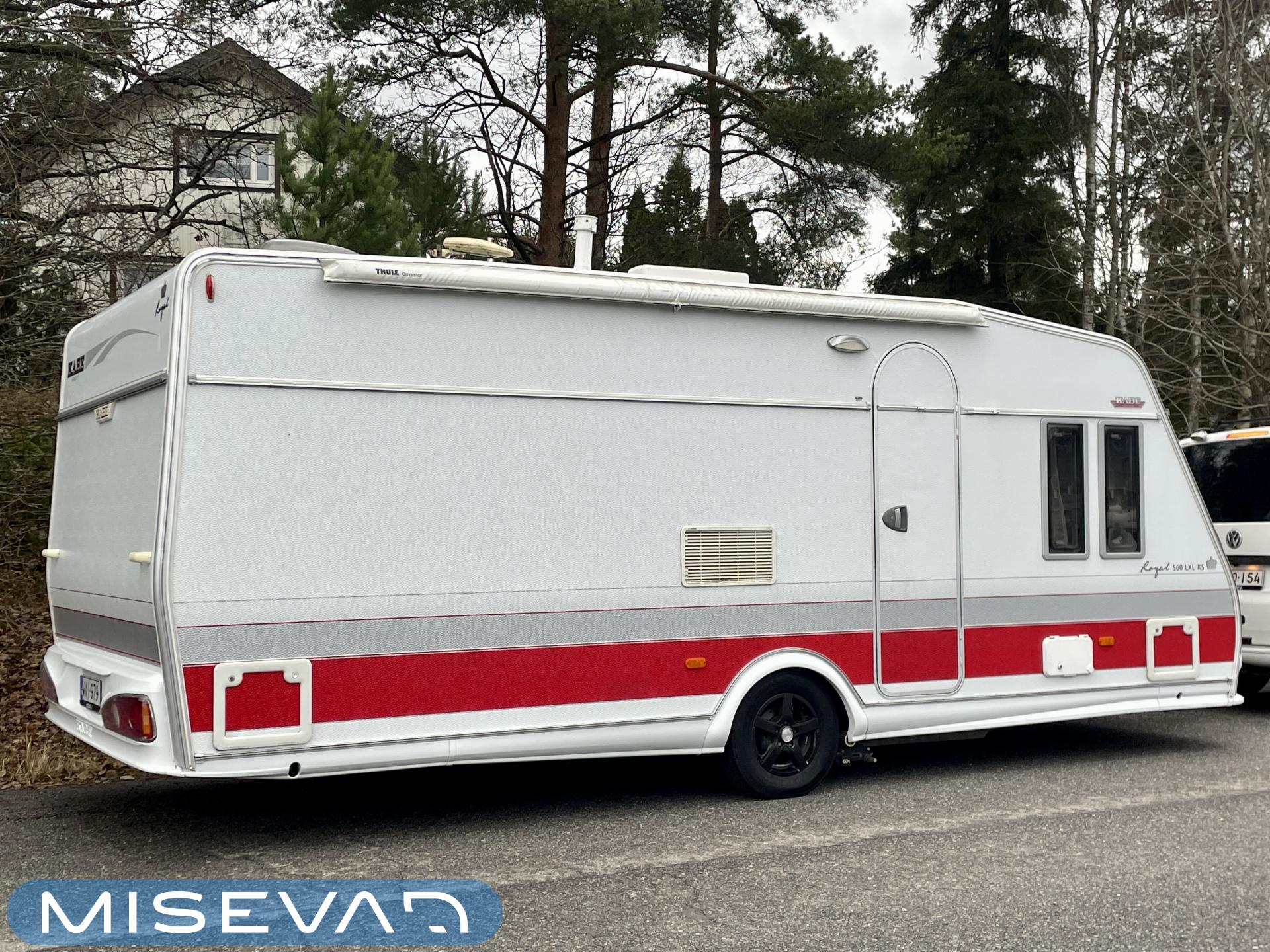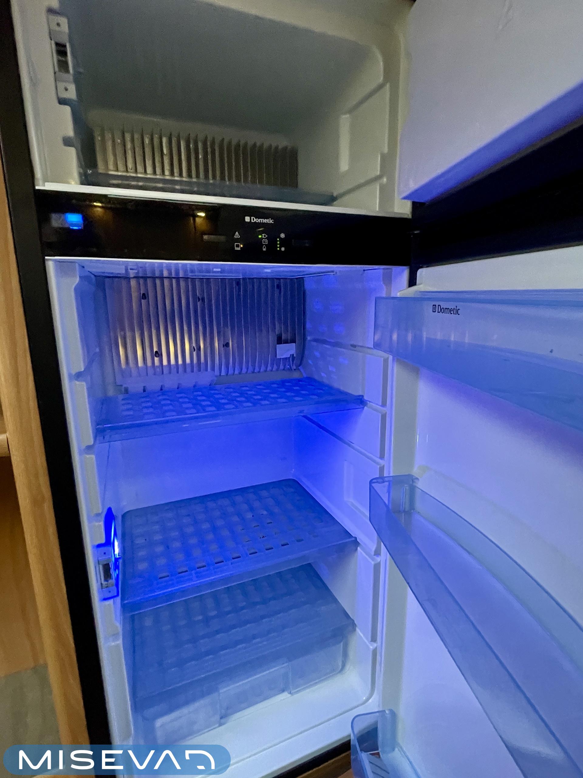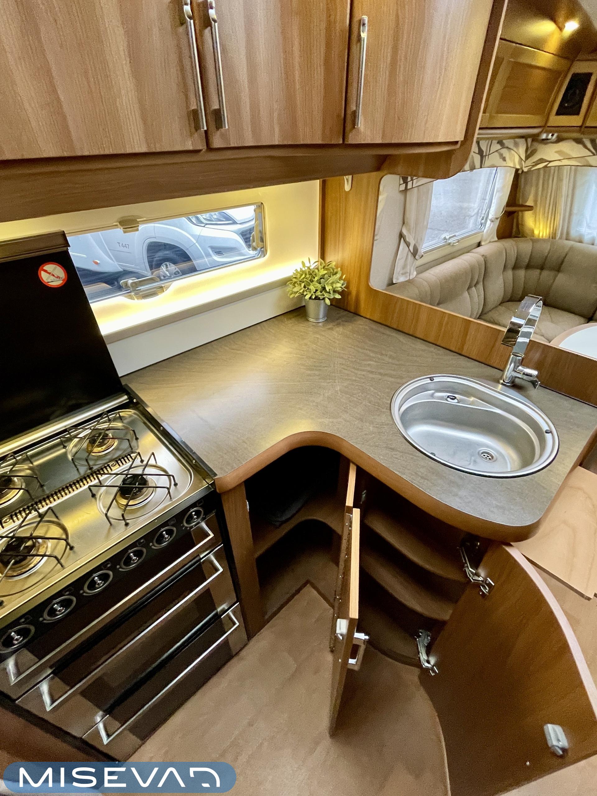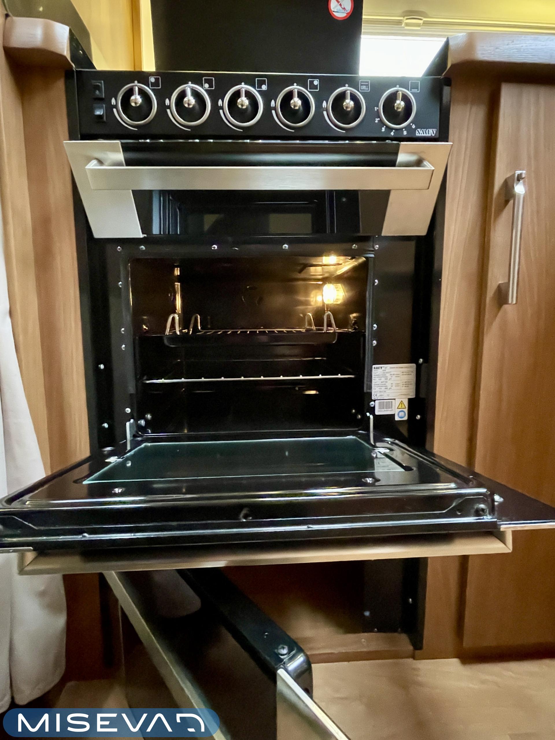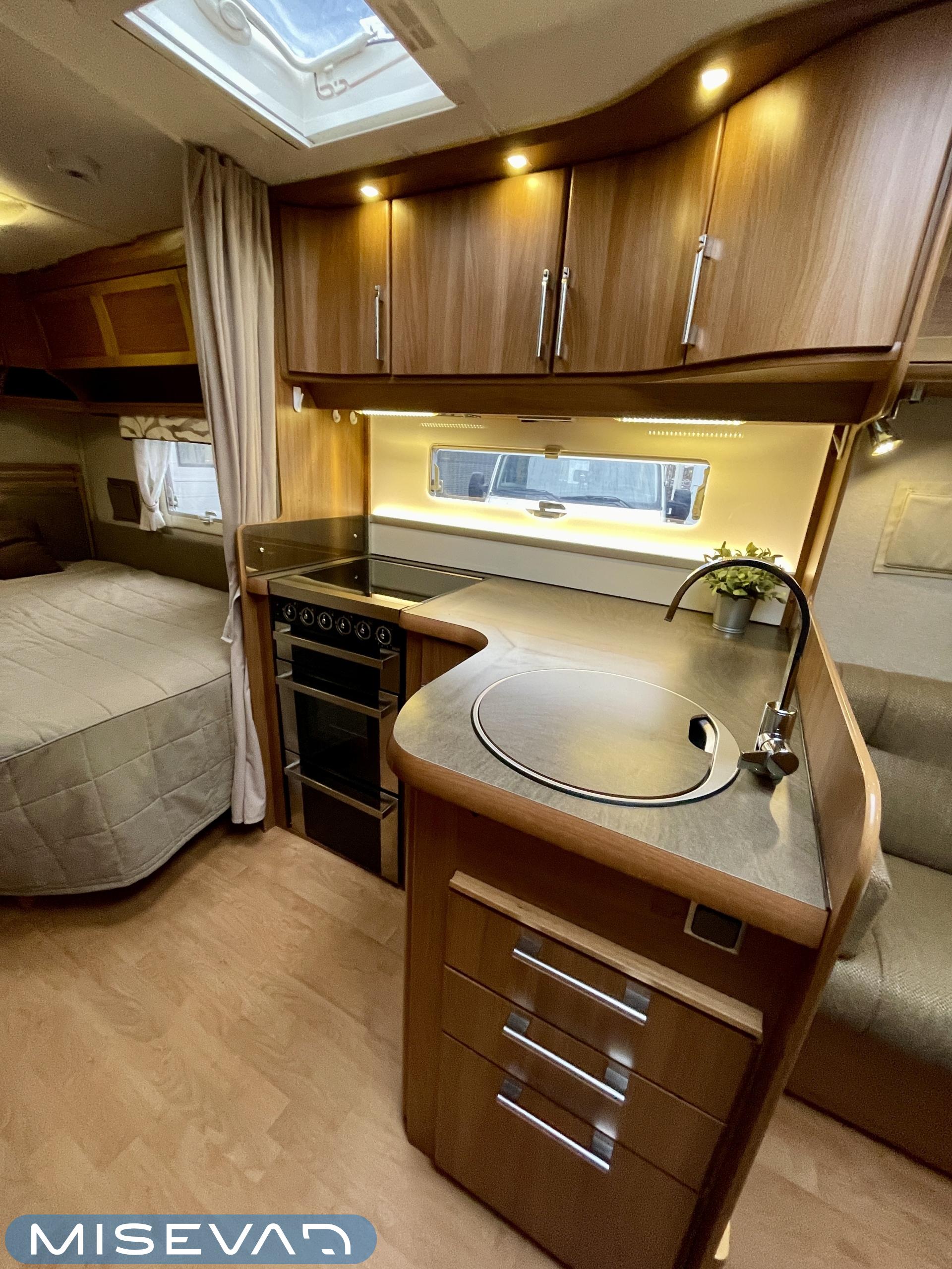 Alde, Insulated grey water tank, Cassette WC, Floor heating, Hot water boiler, Fluid circulation heating, Electric heating cartridge, TV-antenni tai lautasantenni, CD-soitin, Special wheels, Fridge, Cassette blinds, Roof hatch, Freezer compartment, Double bed, Radio