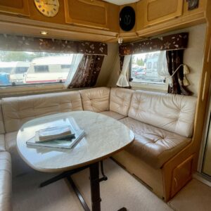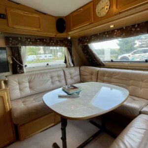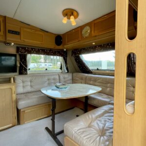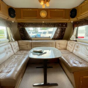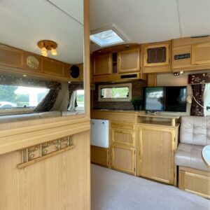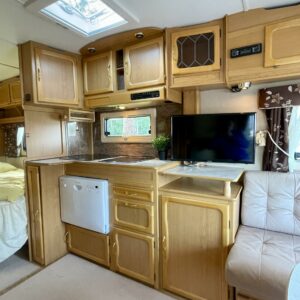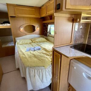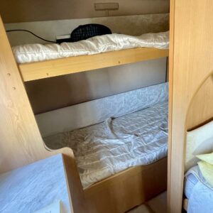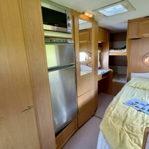 Alde, Hardwood decoration, Fridge, Cassette WC, Cassette blinds, Roof hatch, Bunk bed, Floor heating, Stove, Microwave oven, Leather interior, Fluid circulation heating, Freezer compartment, Double bed, Bicycle rack, Radio, Shower, Electric heating cartridge, TV-antenni tai lautasantenni
