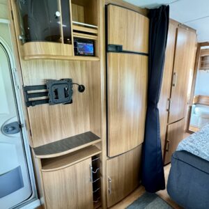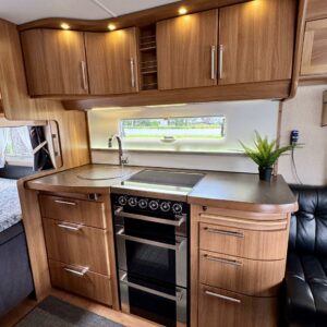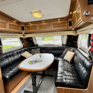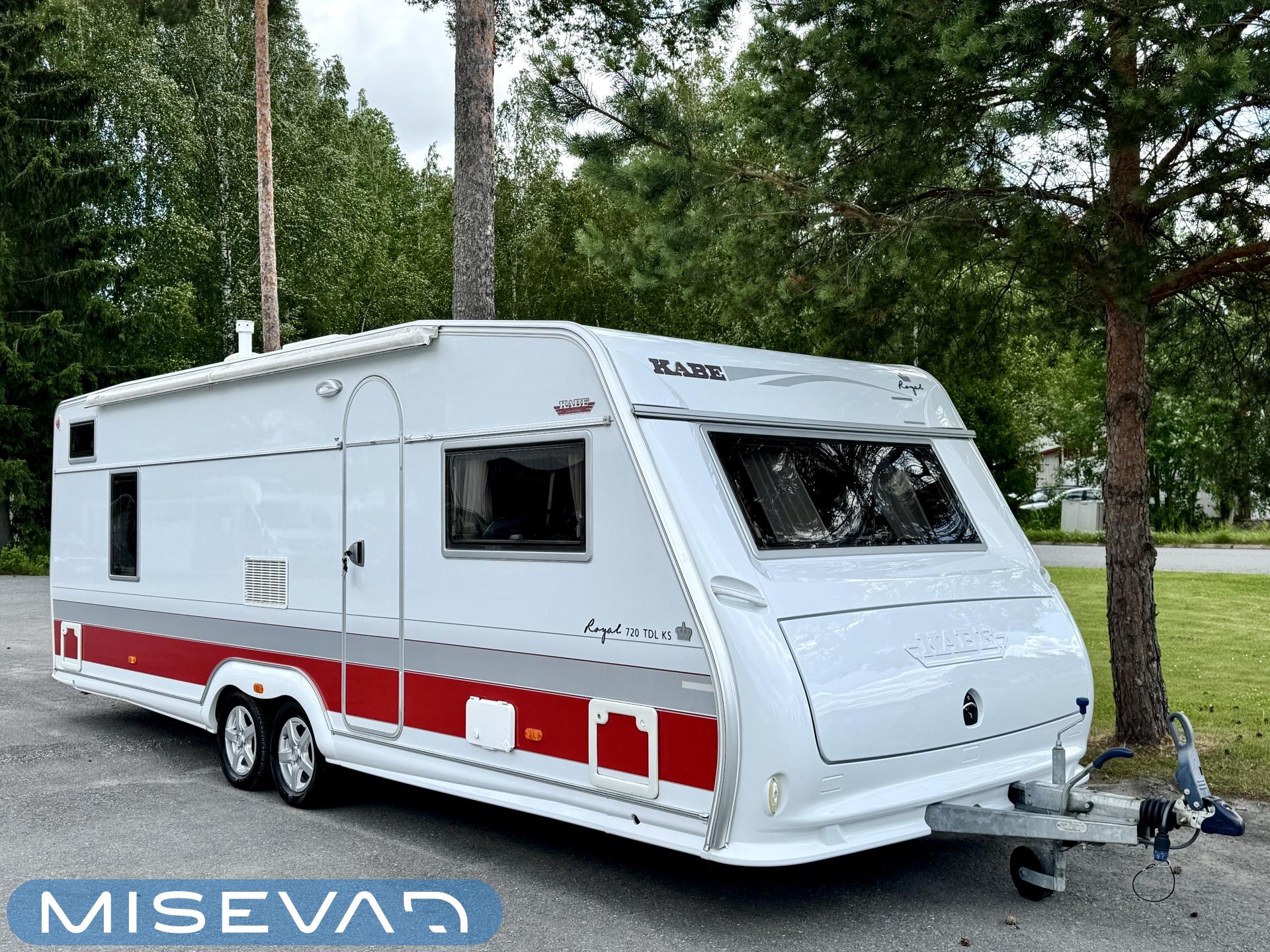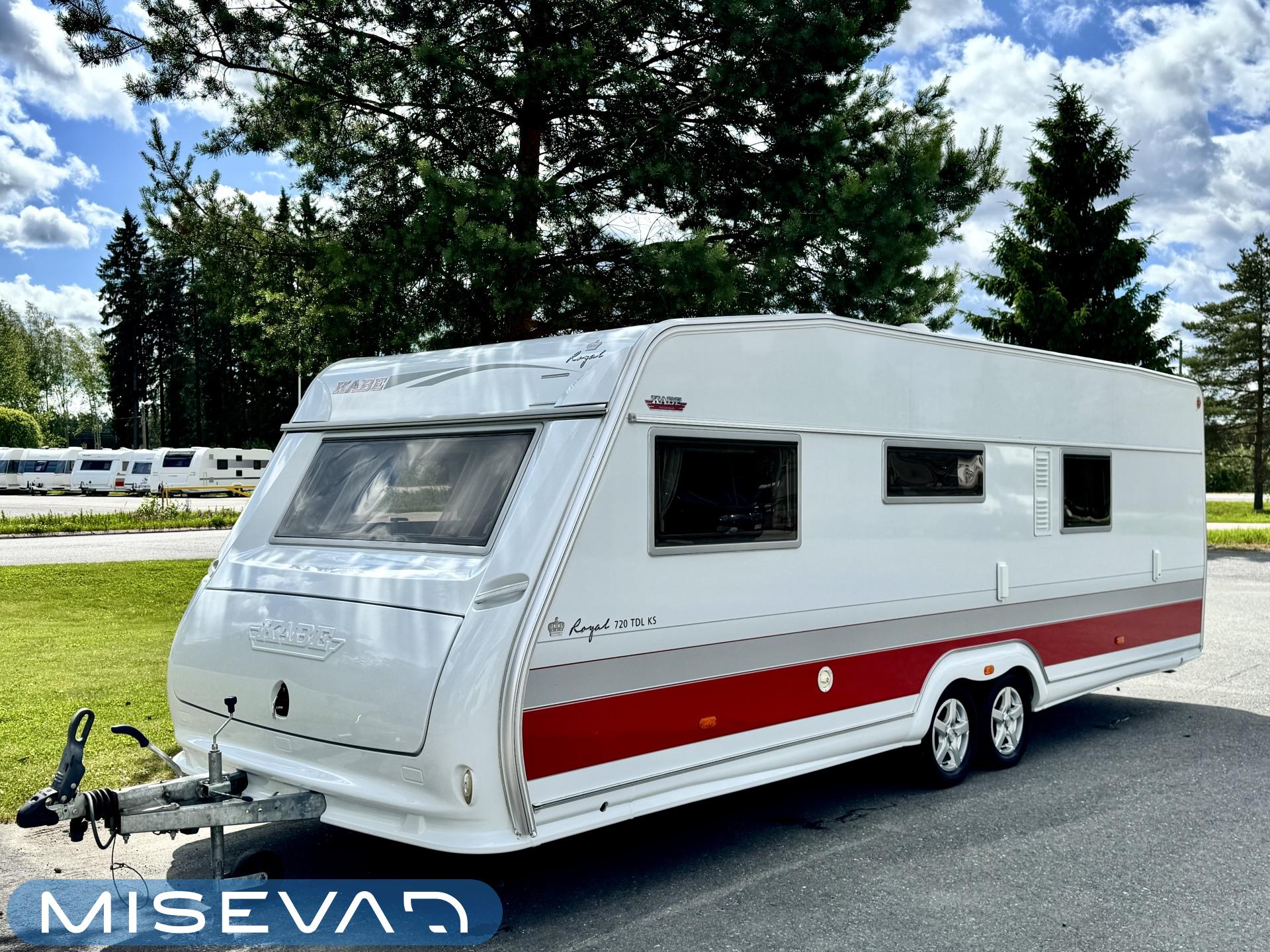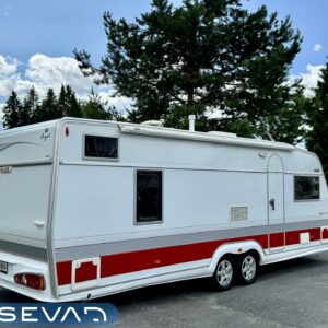 Alde, Electric heating cartridge, Lattialämmitys (nestekierto), Stove, Gas oven, Cassette WC, Cassette blinds, Roof hatch, Double bed, Leather interior, Radio, Freezer compartment, Shower, Sun shade, liesituuletin, Sink, Hot water boiler, Fridge