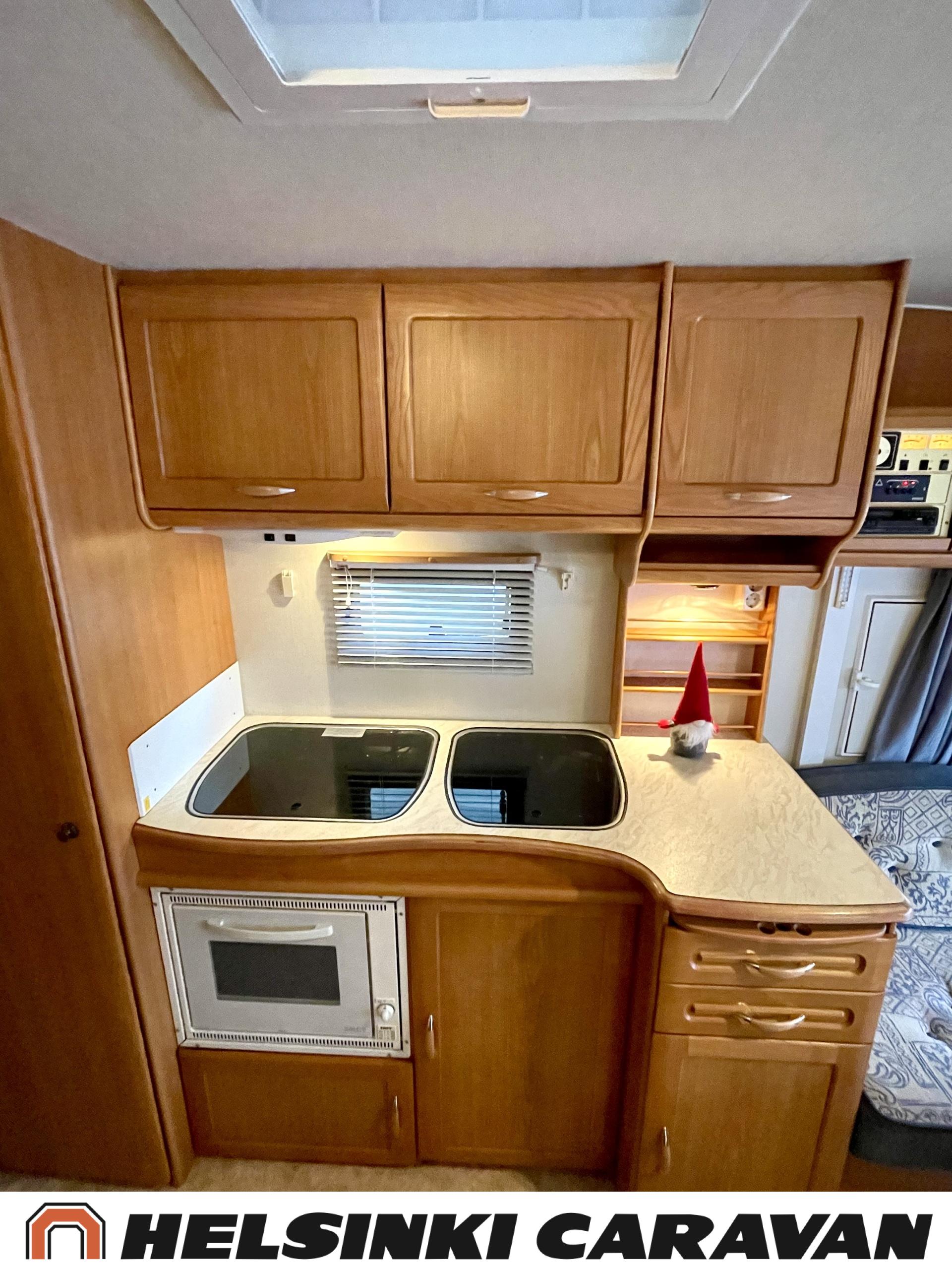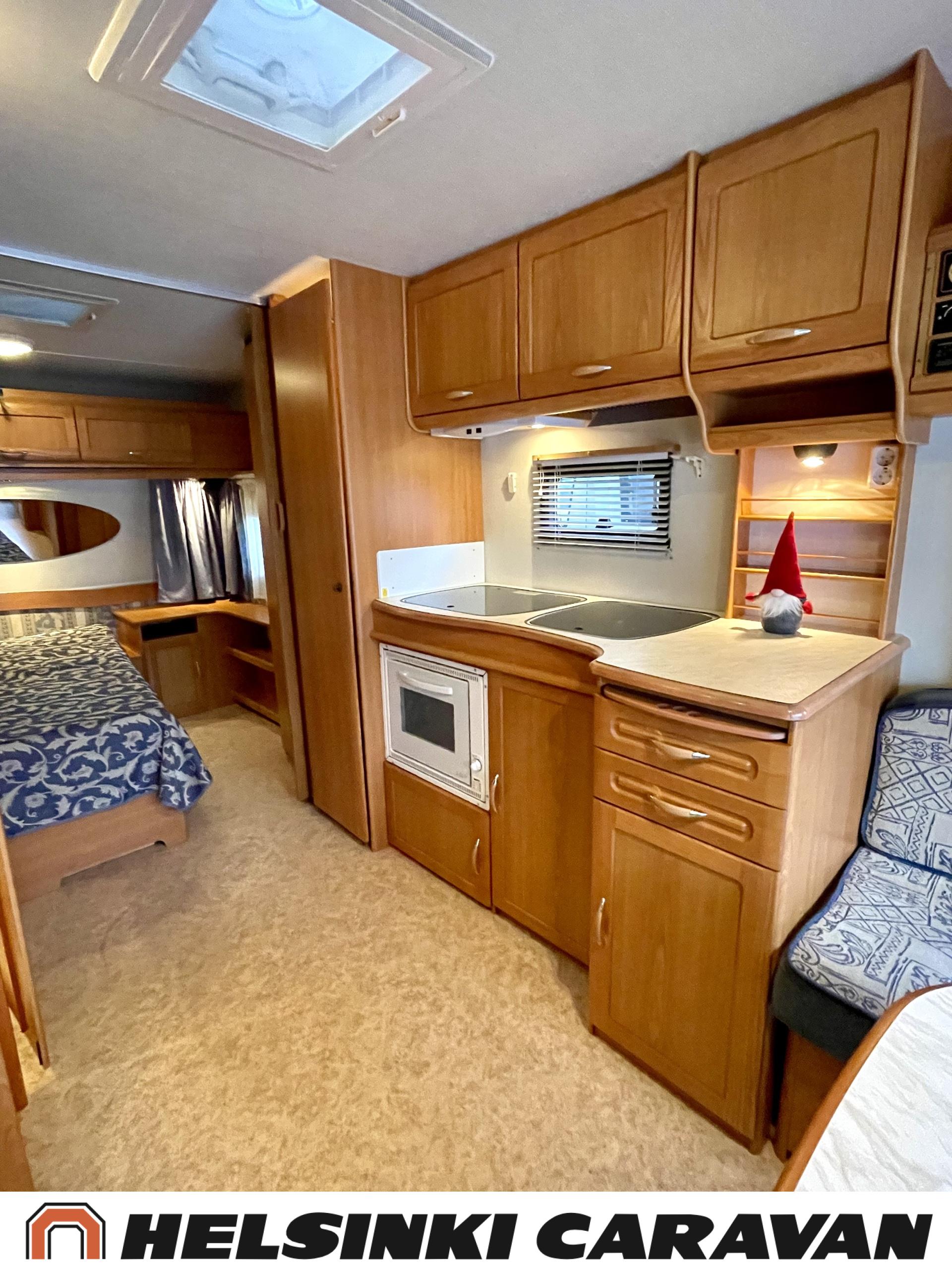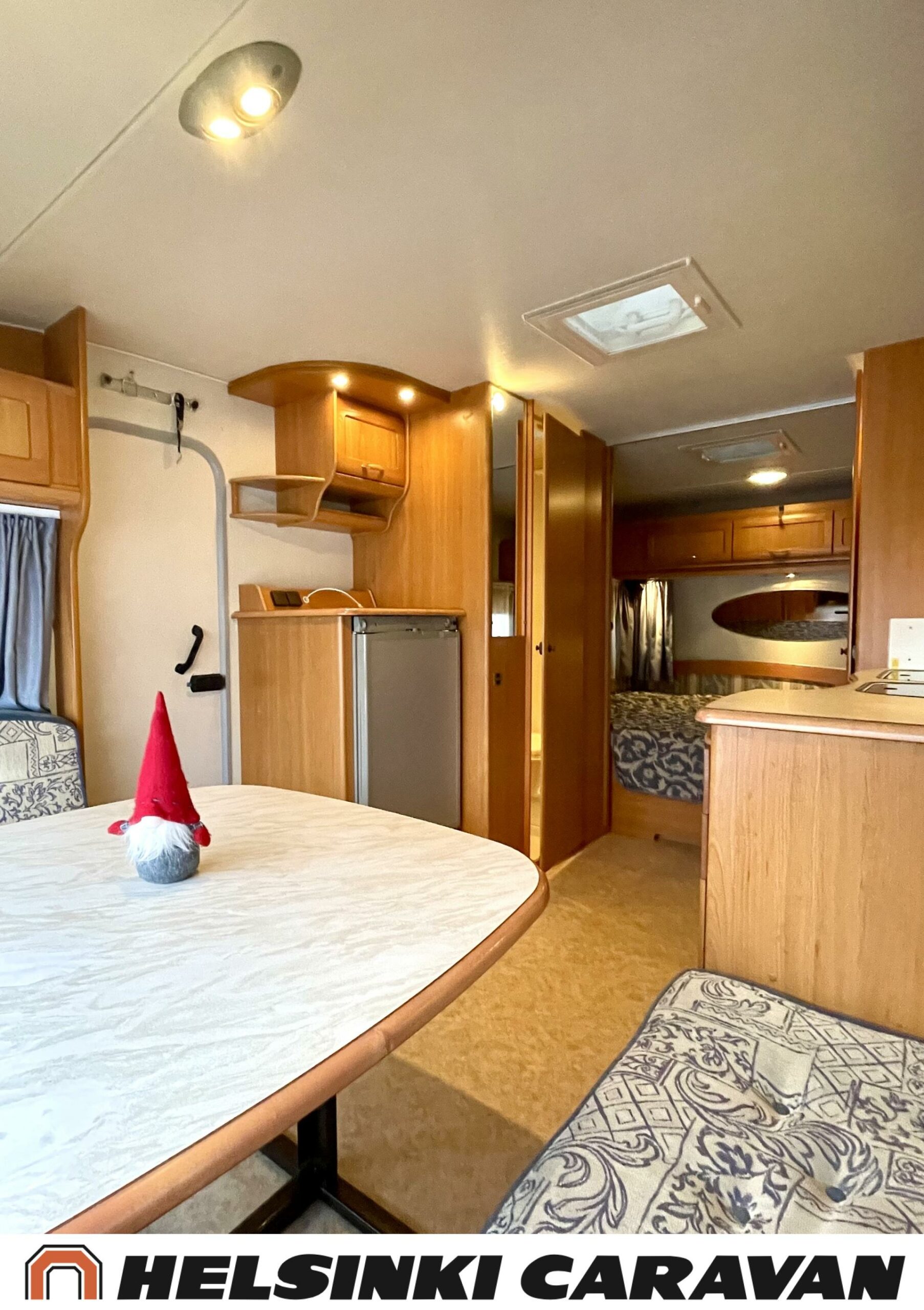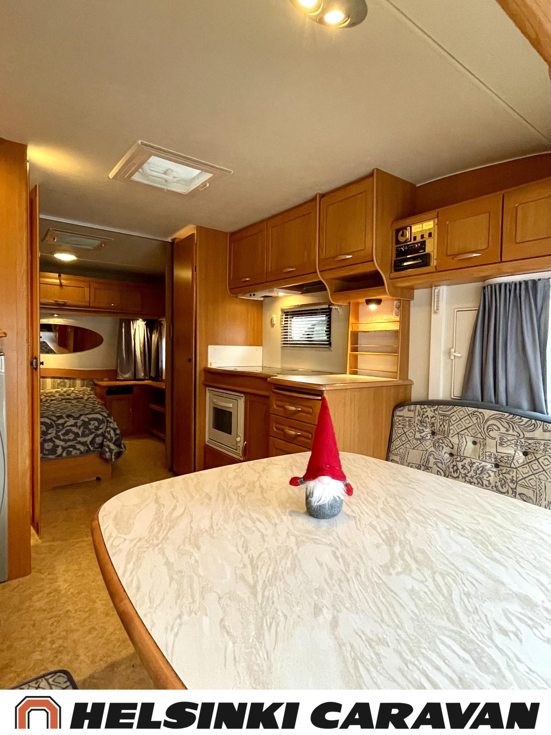 Alde, Separate beds, Hardwood decoration, Fridge, Cassette WC, Roof hatch, Stove, Hot water boiler, Fluid circulation heating, Bicycle rack, Radio, Electric heating cartridge, TV-antenni tai lautasantenni, Support legs, Cassette blinds, Floor heating, Freezer compartment, Sink