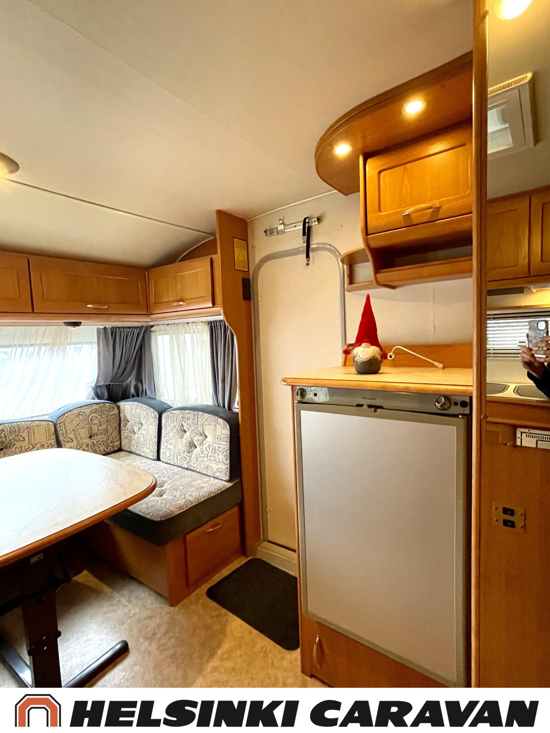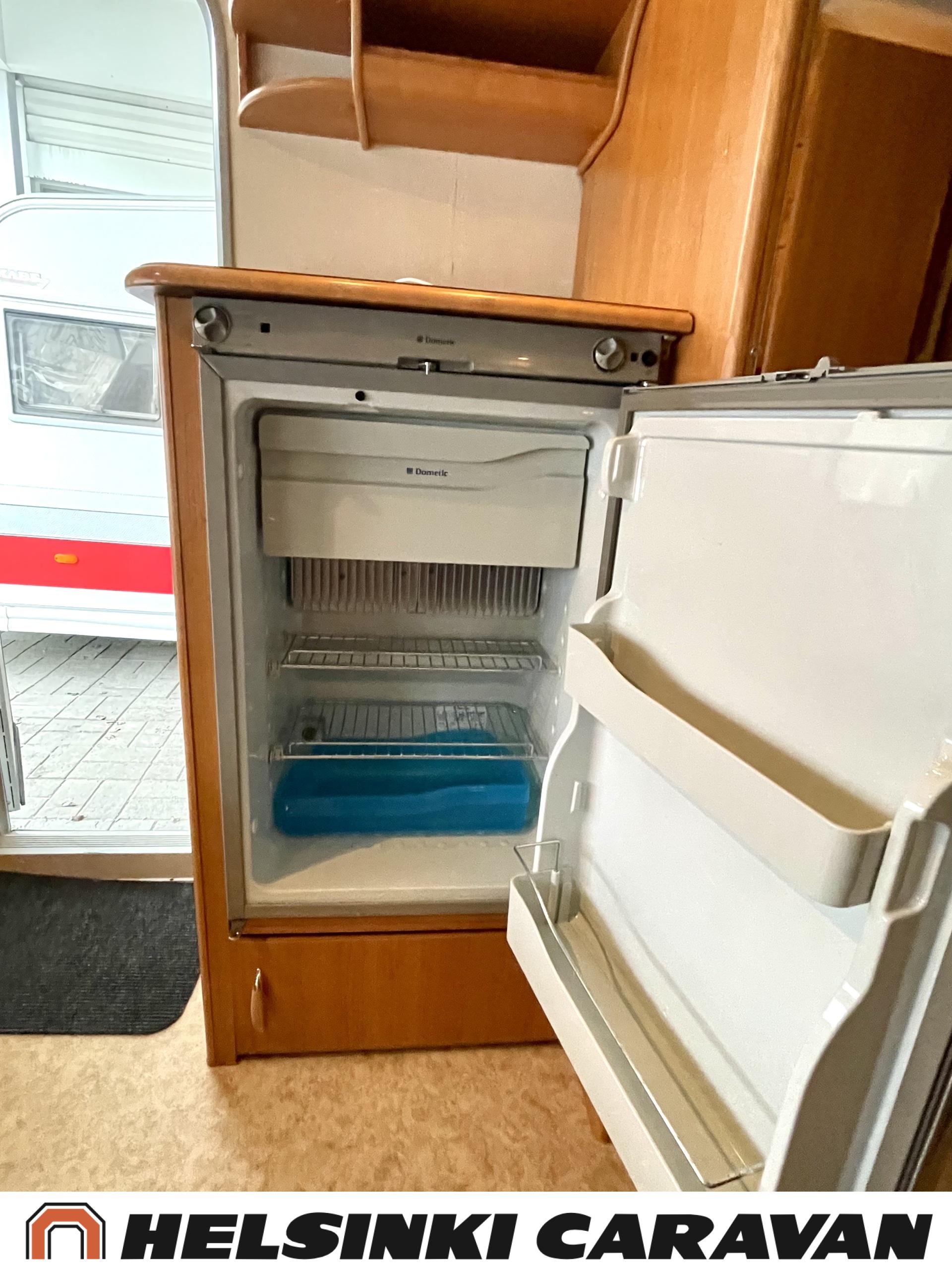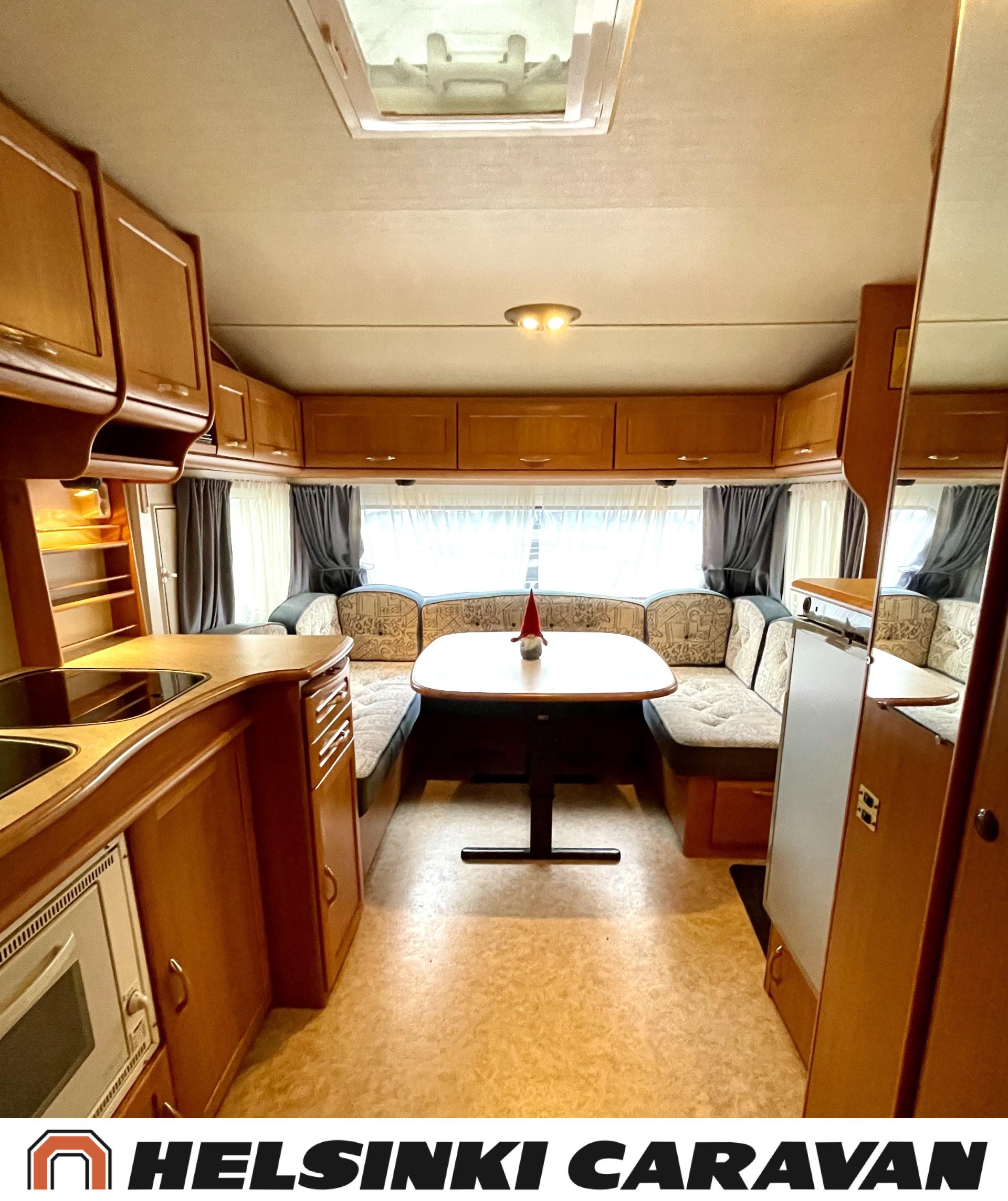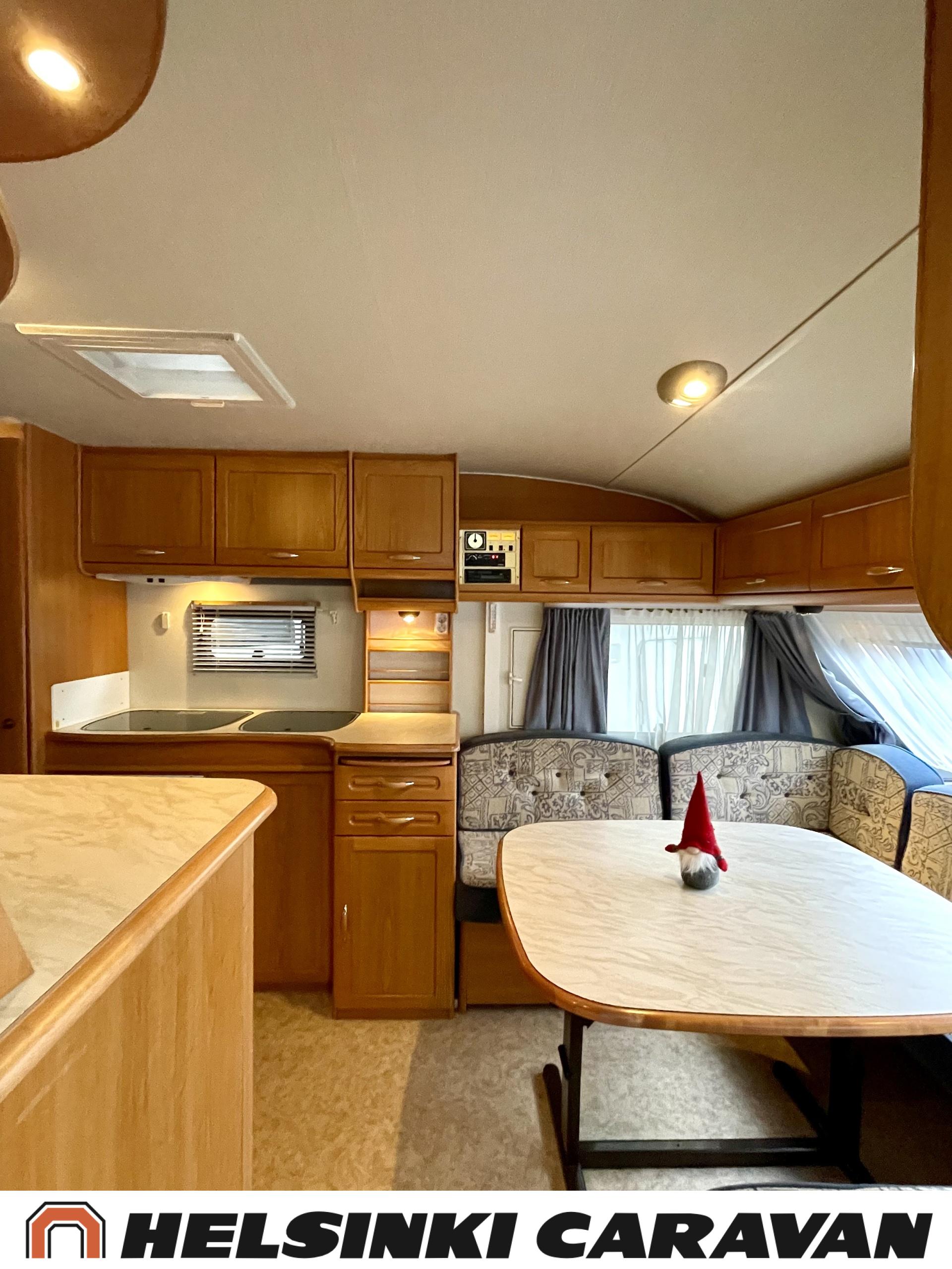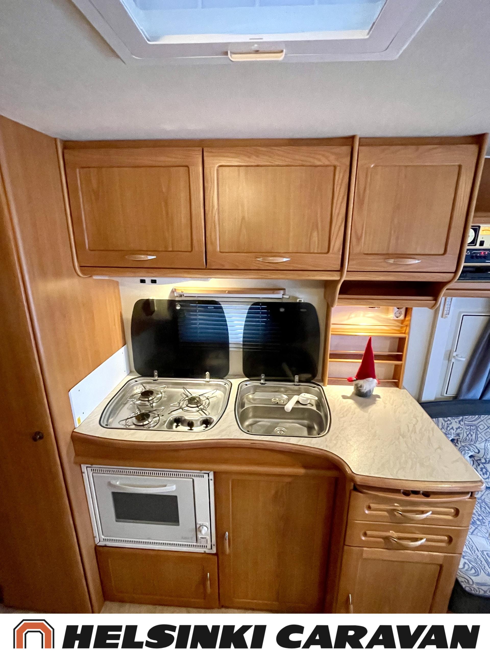 Alde, Separate beds, Hardwood decoration, Fridge, Cassette WC, Roof hatch, Stove, Hot water boiler, Fluid circulation heating, Bicycle rack, Radio, Electric heating cartridge, TV-antenni tai lautasantenni, Support legs, Cassette blinds, Floor heating, Freezer compartment, Sink