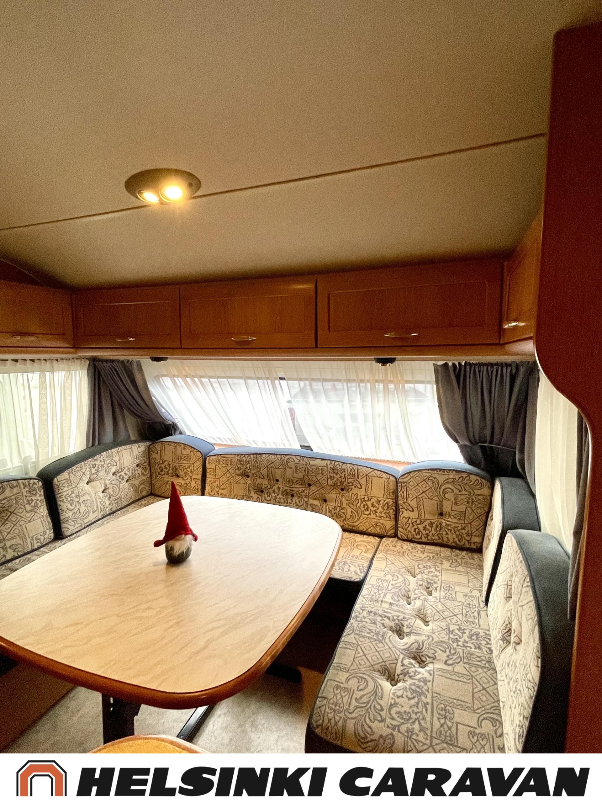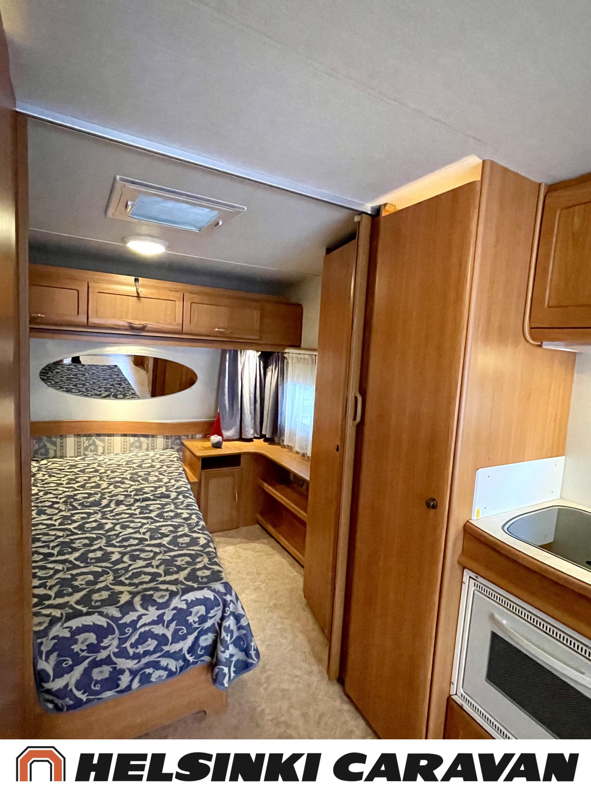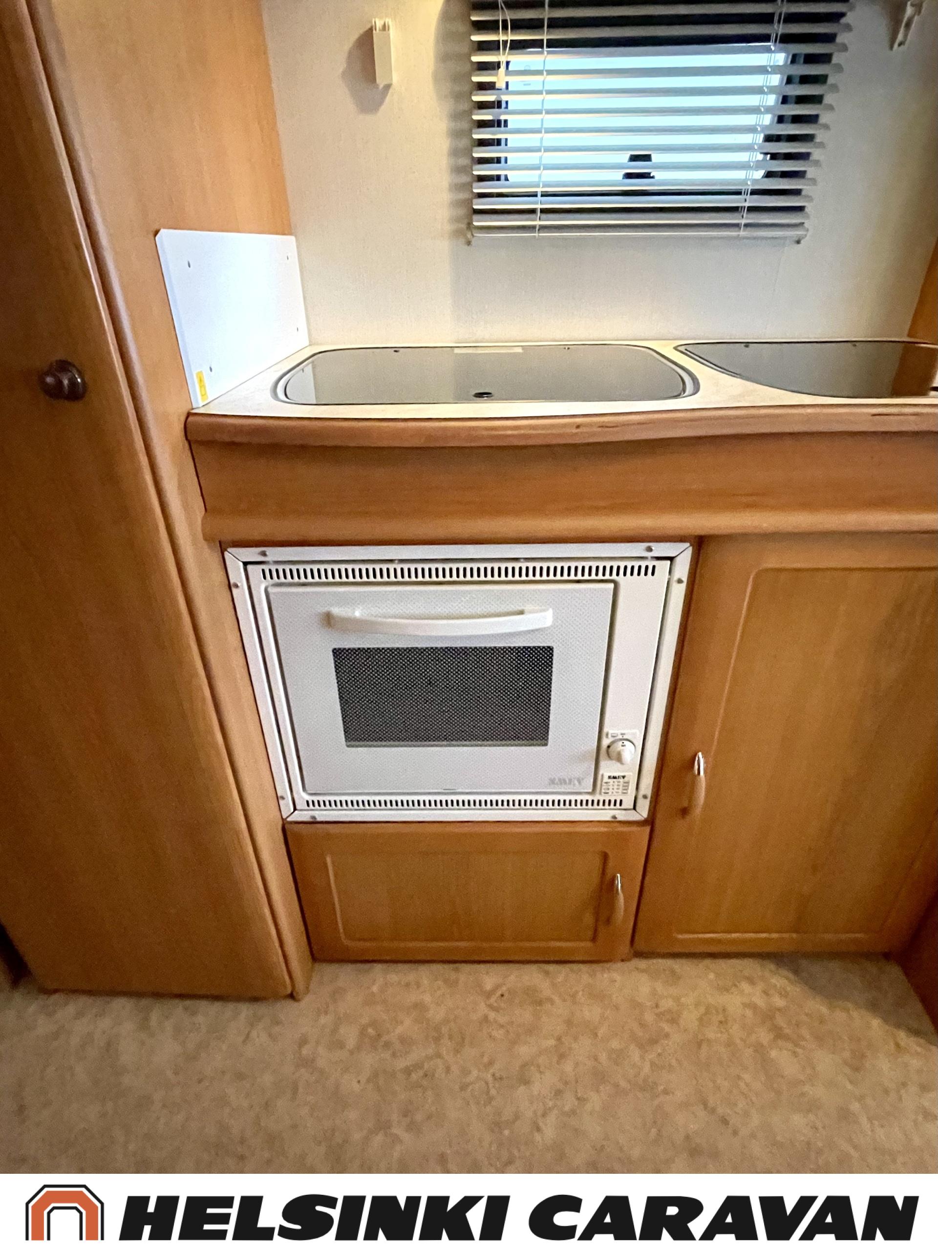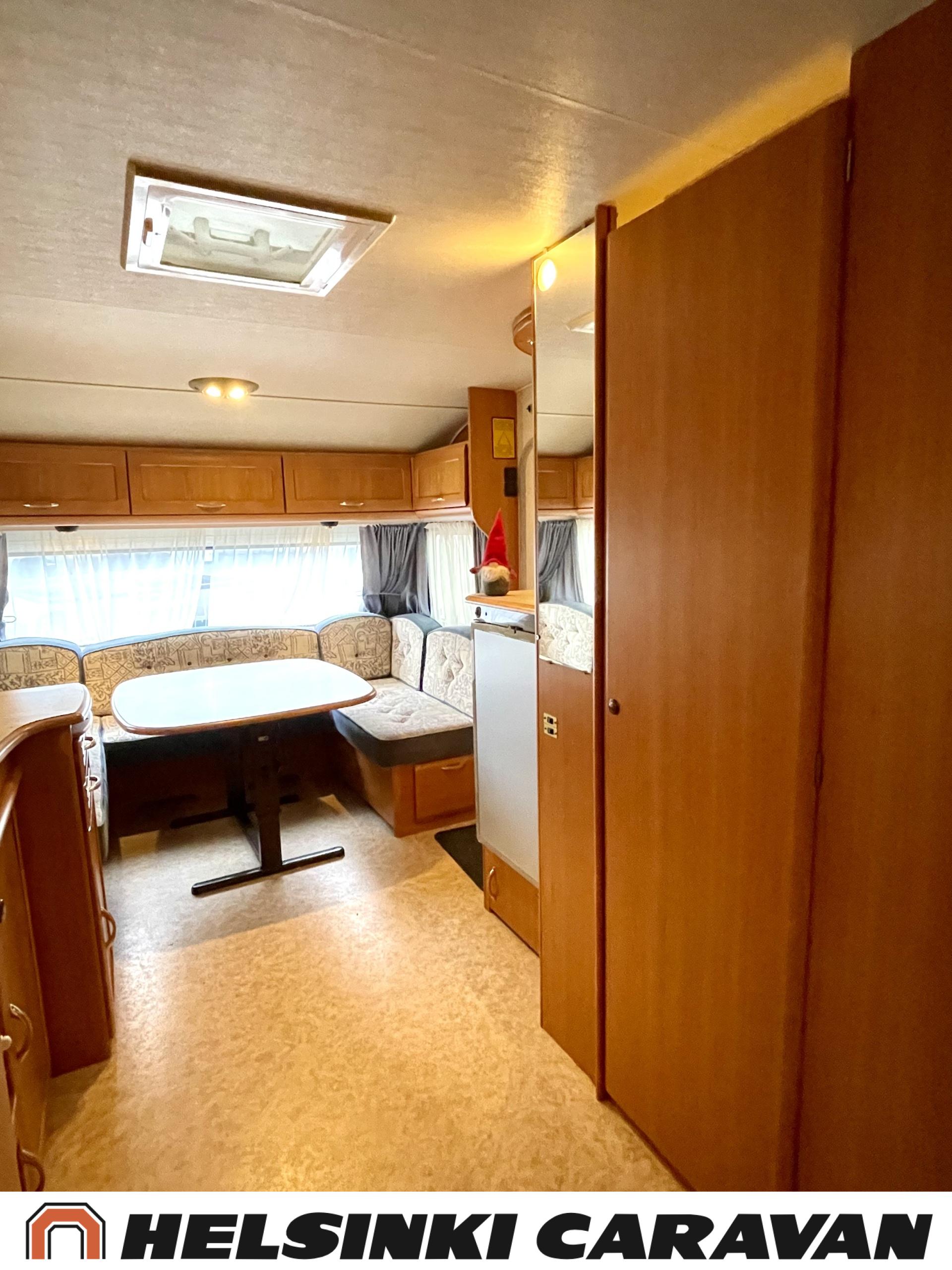 Alde, Separate beds, Hardwood decoration, Fridge, Cassette WC, Roof hatch, Stove, Hot water boiler, Fluid circulation heating, Bicycle rack, Radio, Electric heating cartridge, TV-antenni tai lautasantenni, Support legs, Cassette blinds, Floor heating, Freezer compartment, Sink