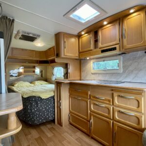 Alde, Insulated grey water tank, Fridge, Cassette WC, Cassette blinds, Roof hatch, Stove, Hot water boiler, Fluid circulation heating, Freezer compartment, Sink, Double bed, Bicycle rack, Radio, Shower, Electric heating cartridge, Support legs, Lattialämmitys (nestekierto), Ilmastointi (asuintila), kwh-mittari, Kesärenkaat, kaasun ulosotto, sähkön ulosotto