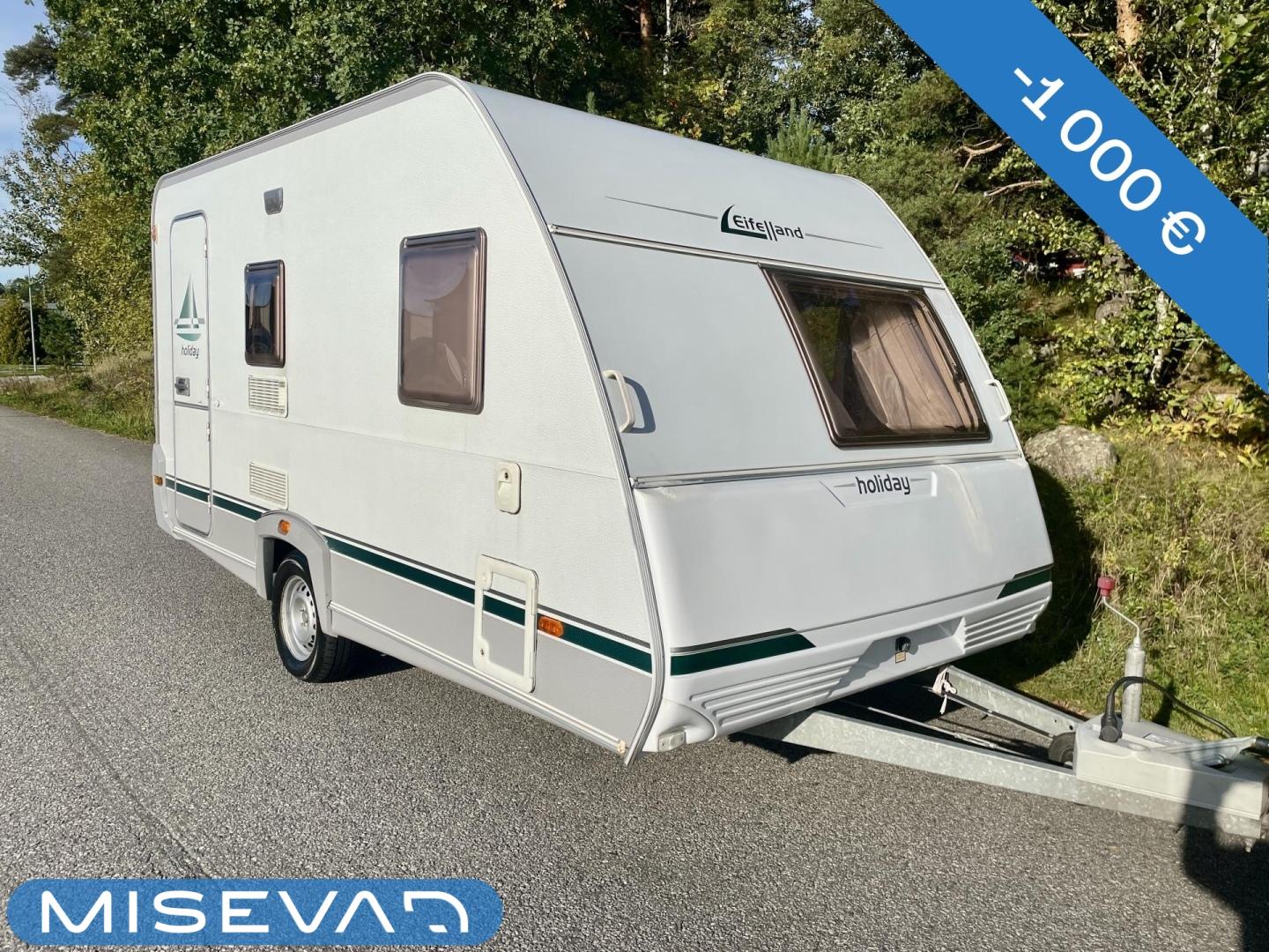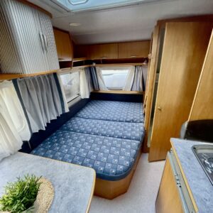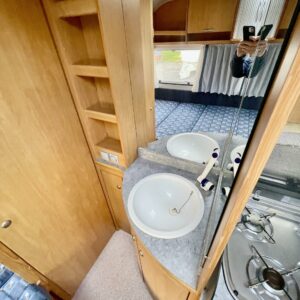 Truma, Fridge, Cassette WC, Cassette blinds, Roof hatch, Stove, Hot water boiler, Freezer compartment, Double bed, Sink, Support legs