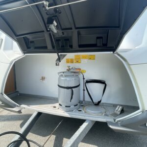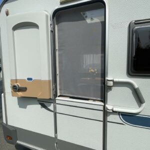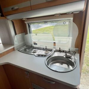 Truma, Fridge, Cassette WC, Cassette blinds, Roof hatch, Stove, Hot water boiler, Freezer compartment, Double bed, Sink, Support legs