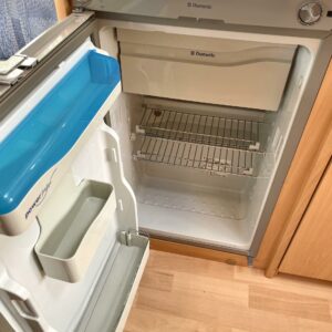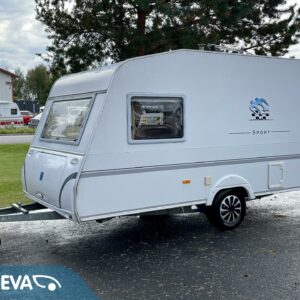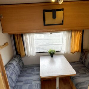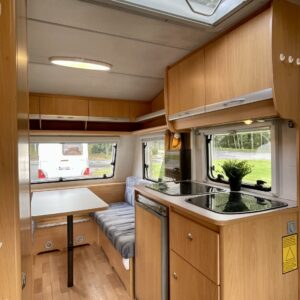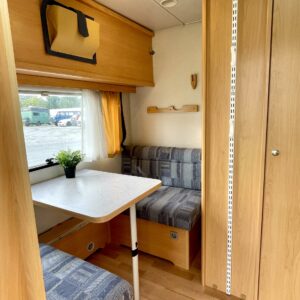 Fridge, Cassette WC, Roof hatch, Stove, Hot water boiler, Double bed, Sink, TV-antenni tai lautasantenni, Trumatic, Support legs, Cassette blinds