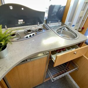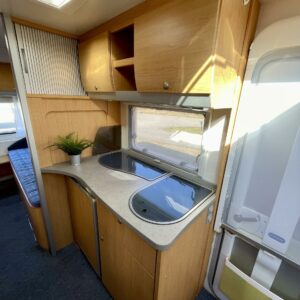 Front tent, Fridge, Cassette WC, Cassette blinds, Roof hatch, Stove, Hot water boiler, Freezer compartment, Sink, Electric heating cartridge, Trumatic, Support legs, TV antenna/satellite dish, Separate beds