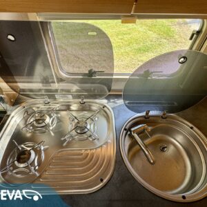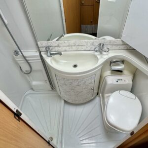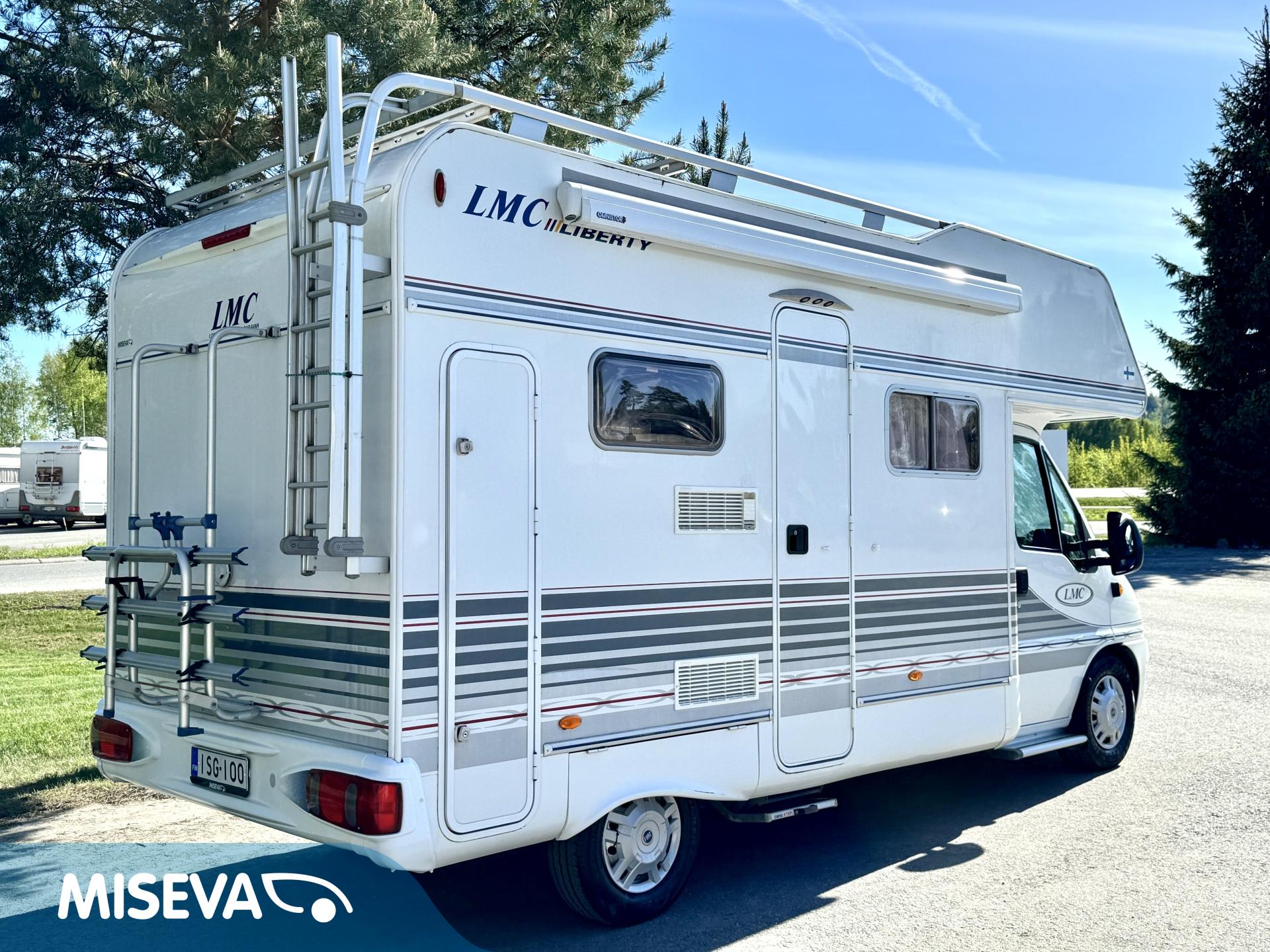 Fridge, Two tyre sets, Cassette WC, Cassette blinds, Roof railing/ladder, Roof hatch, Central heating, Hot water boiler, Sun shade, Double bed, Sink, Fuel-operated additional heater, Pysäköintikamera, Bicycle rack, Radio, Shower, Trumatic, Turbo, Stove, CD-soitin, Power steering, Freezer compartment