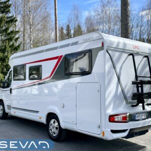 ABS brakes, Trip computer, Separate beds, Fridge, Cab air conditioning, Cassette WC, Cassette blinds, Roof hatch, Keskuslukitus: Kaukosäätöinen, Central heating, Stove, Hot water boiler, Sink, Freezer compartment, Power steering, Sun shade, Pysäköintikamera, Electric windows, Vakionopeudensäädin, Turbo, Trumatic, Power side mirrors, Tiiveystakuu voimassa, Kesärenkaat, Polkupyöräteline, Asuinosan hyttysovi/verho