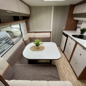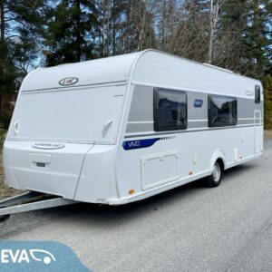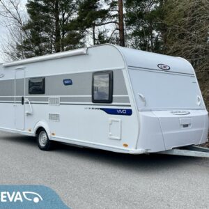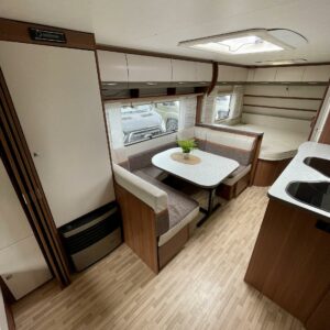 Solar panel, Fridge, Cassette WC, Cassette blinds, Roof hatch, Bunk bed, Floor heating, Passenger area carpets, Stove, Hot water boiler, Sun shade, Freezer compartment, Double bed, Sink, Electric heating cartridge, Trumatic, Support legs, Lattialämmitys (sähkö)
