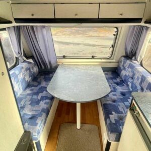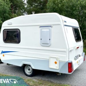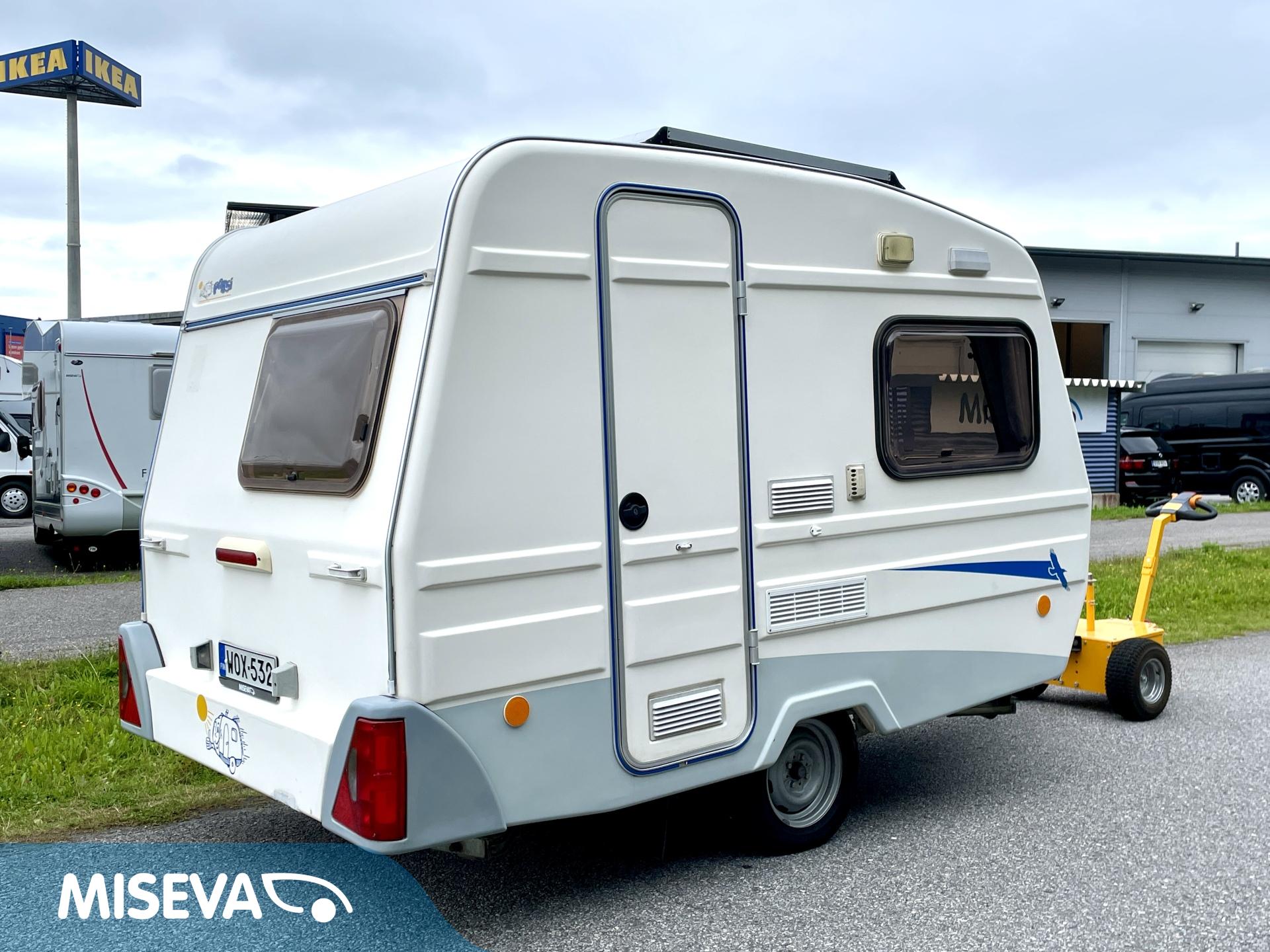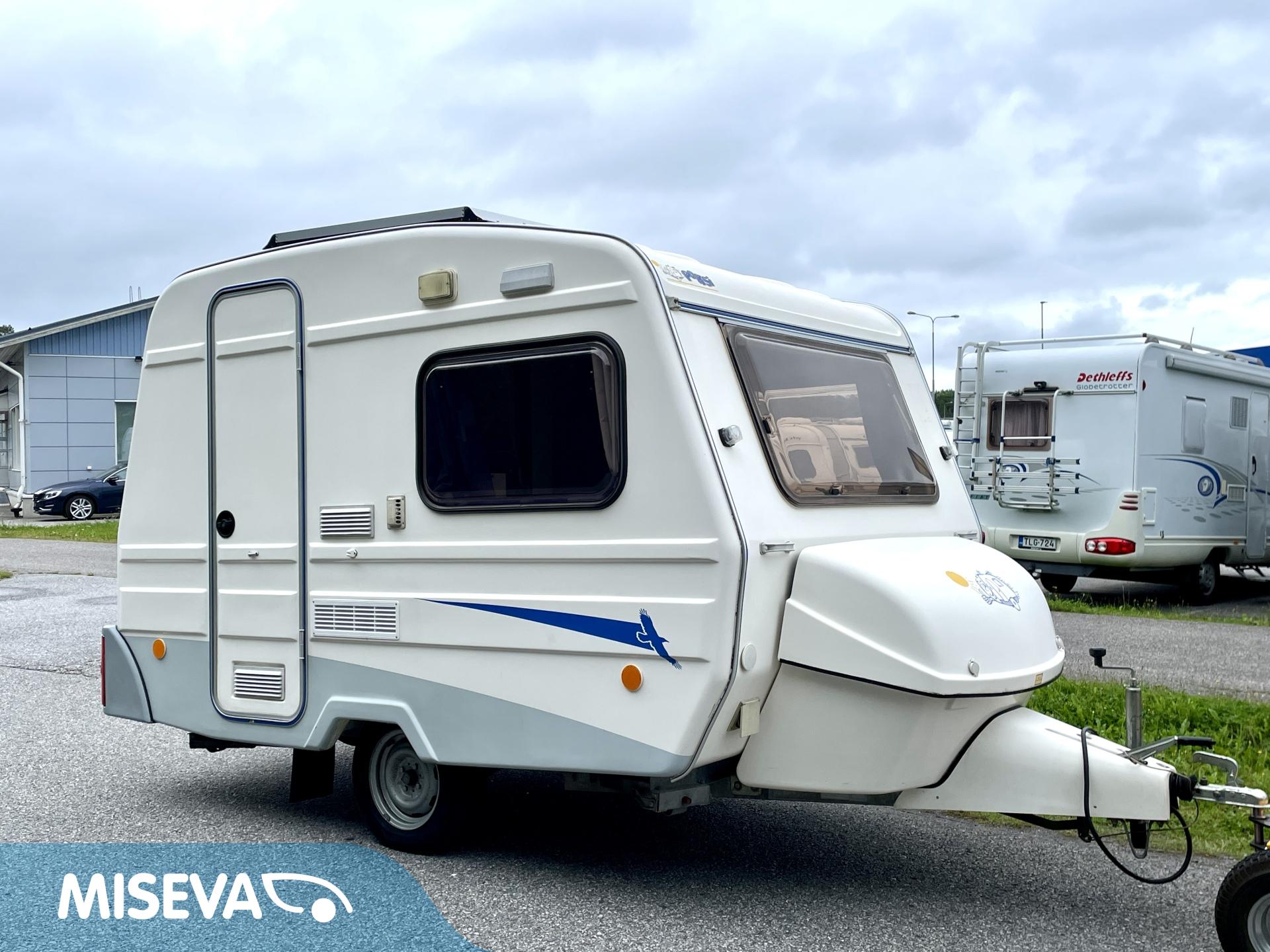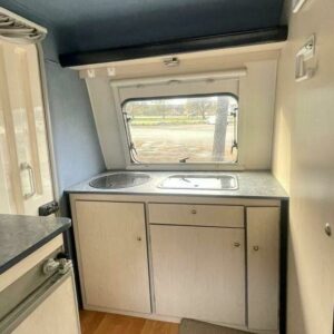 Fridge, Cassette WC, Roof hatch, Floor heating, Stove, Sink, Rear kitchen, Trumatic, Support legs, Solar panel