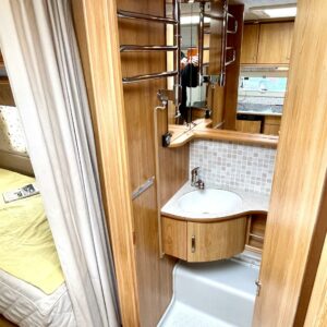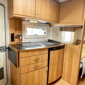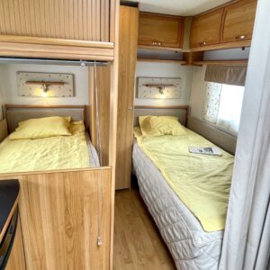 Separate beds, Fridge, Cassette WC, Cassette blinds, Roof hatch, Stove, Hot water boiler, Fluid circulation heating, Sink, Bicycle rack, Electric heating cartridge, Support legs, Lattialämmitys (nestekierto), Kesärenkaat