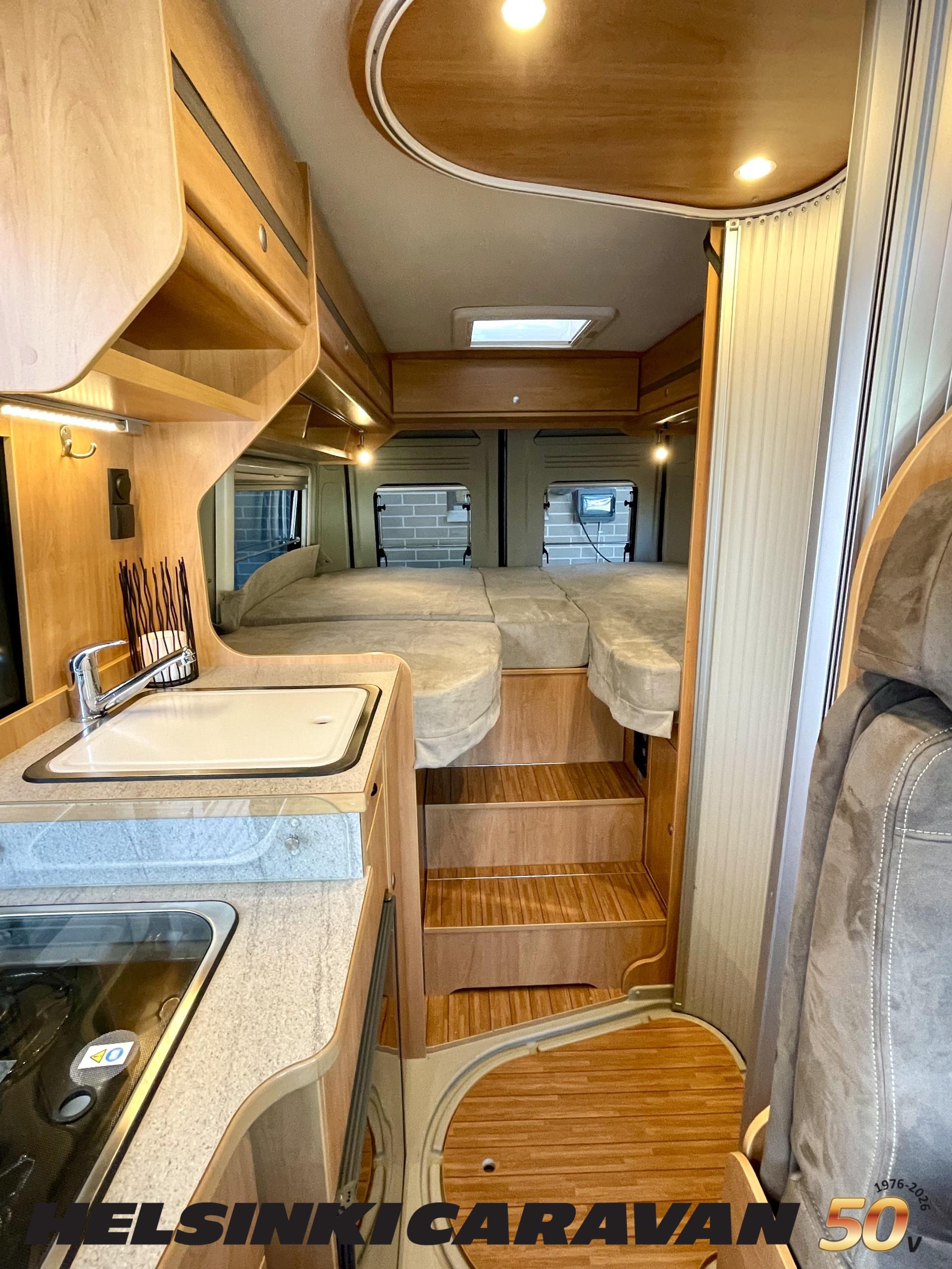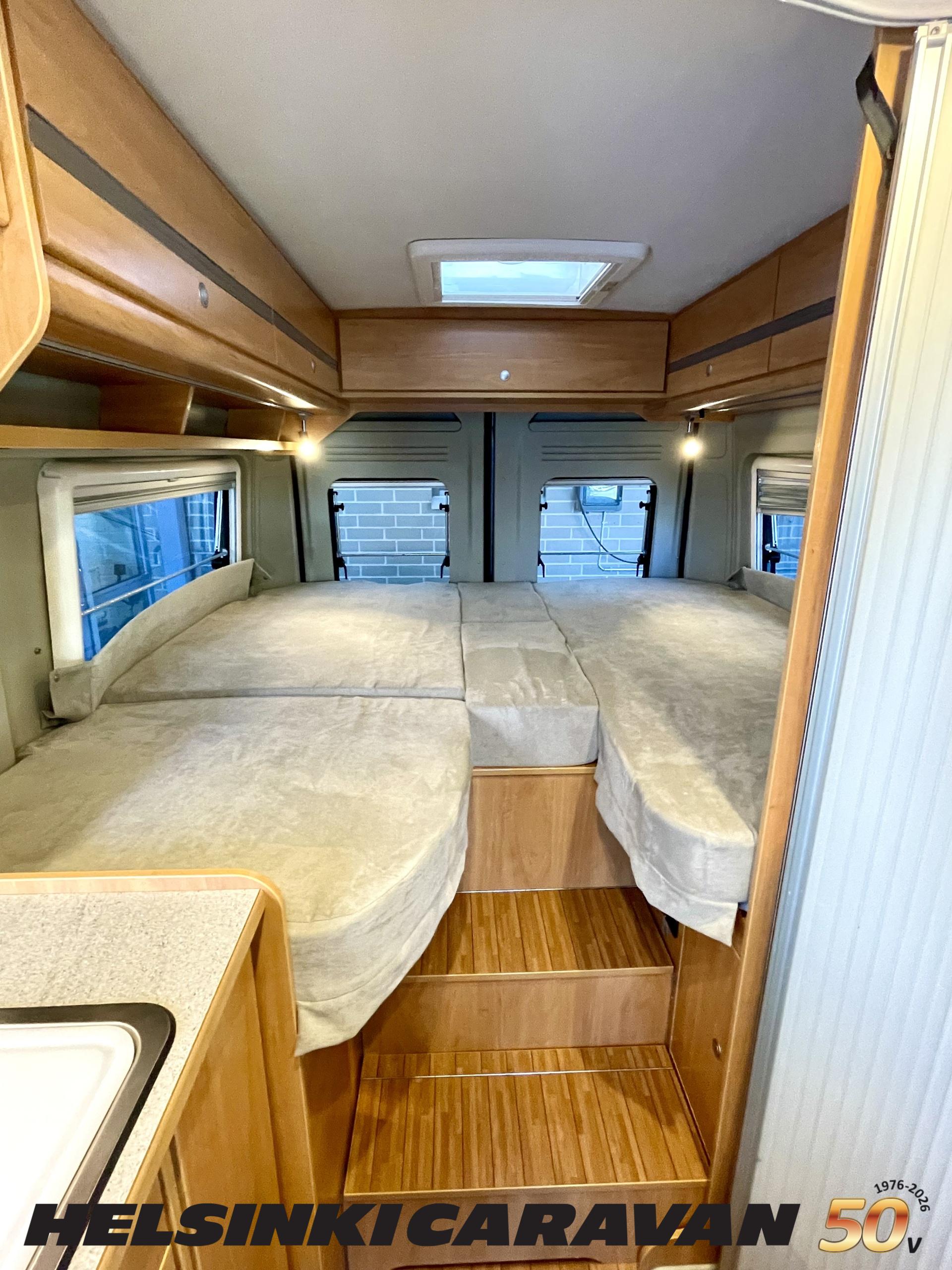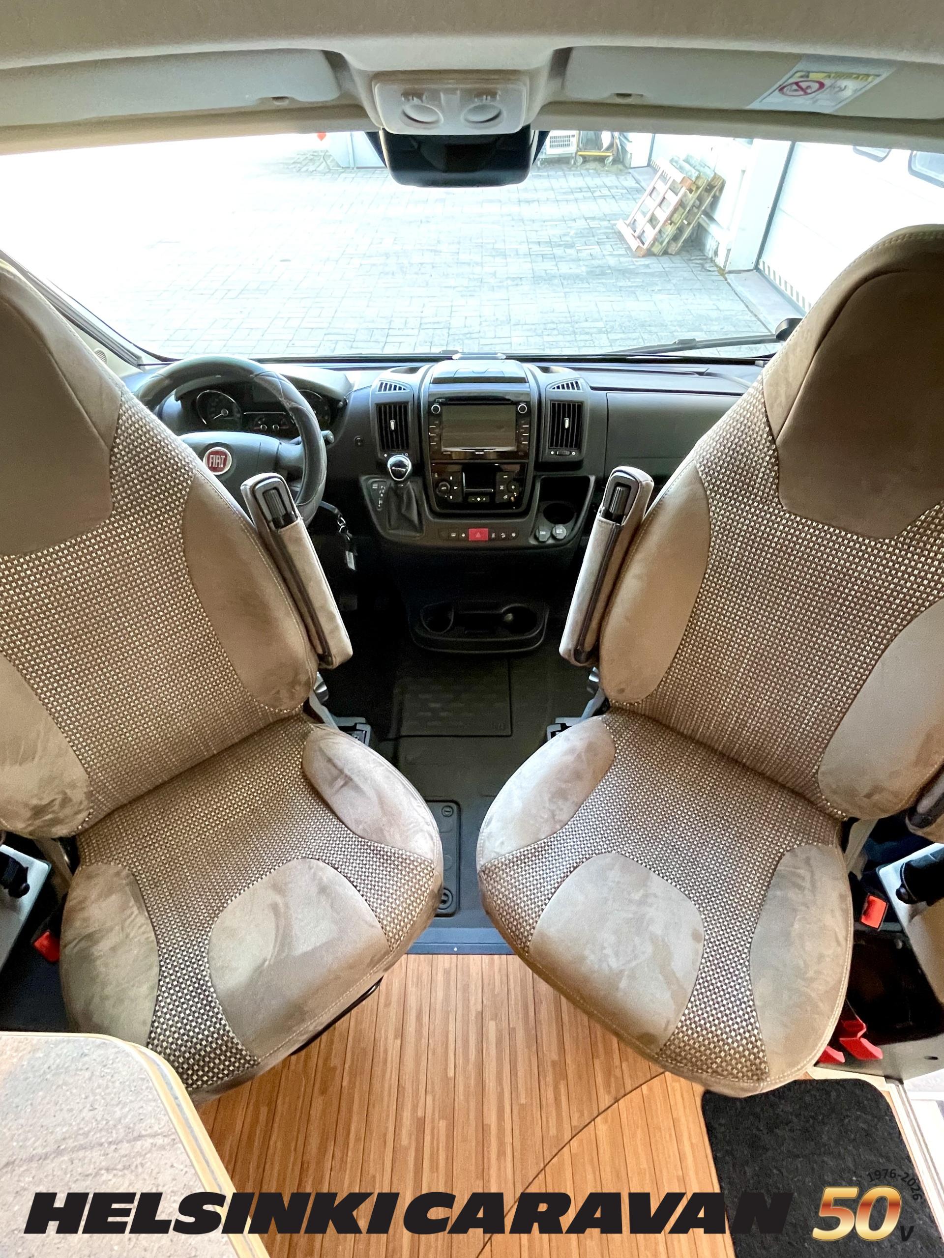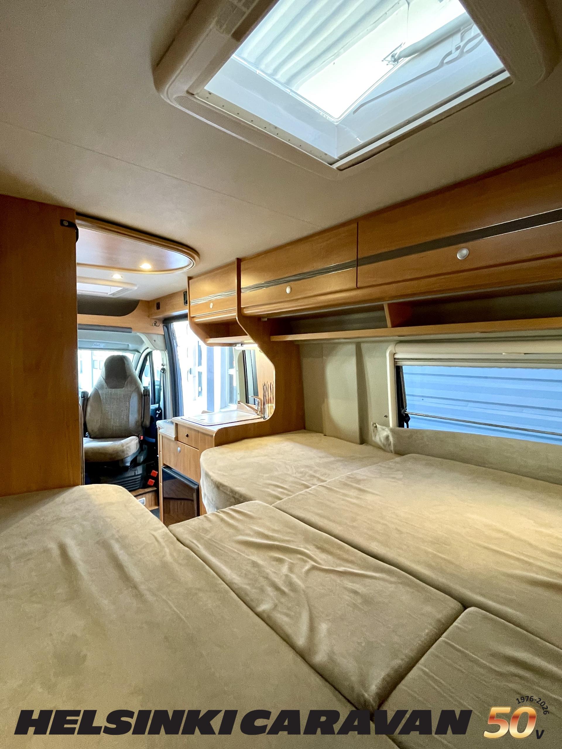 ABS brakes, Airbag, Trip computer, Solar panel, Special wheels, Service history, Cab air conditioning, Fridge, Cassette WC, Cassette blinds, Roof hatch, Keskuslukitus: Avaimella, Ignition interlock, Stove, Engine heater, Traction control, Hot water boiler, Sun shade, Navigator, Power steering, Freezer compartment, Sink, Pysäköintikamera, Radio, Shower, Electric windows, Electric heating cartridge, Power side mirrors, Electric steps, Trumatic, Turbo, Towing hook, Vakionopeudensäädin, Microwave oven, Separate beds, Truma, Ilmastointi (ohjaamo), Vakionopeuden säädin, JP-huollot ok, Huoltokirja ok, Kesärenkaat, 1 x kevytmet.vanteet, ohjaamon kasettiverhot, Peruutuskamera, Asuinosan hyttysovi/verho, liukuoven softlock, Insulated grey water tank, ESC system, Äänentoistojärjestelmä, Ilmastointi: Automaattinen