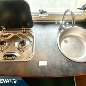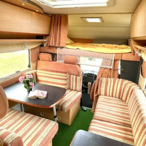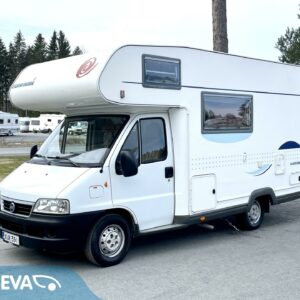 Fridge, Two tyre sets, Cassette WC, Cassette blinds, Roof hatch, Central heating, Stove, Engine heater, Hot water boiler, Sun shade, Freezer compartment, Double bed, Sink, Bicycle rack, Stereo system, Shower, Electric windows, Power side mirrors, Electric steps, Rear kitchen, Trumatic, Double bottom, Turbo, Service history, Keskuslukitus: Ilman kaukosäädintä, Radio